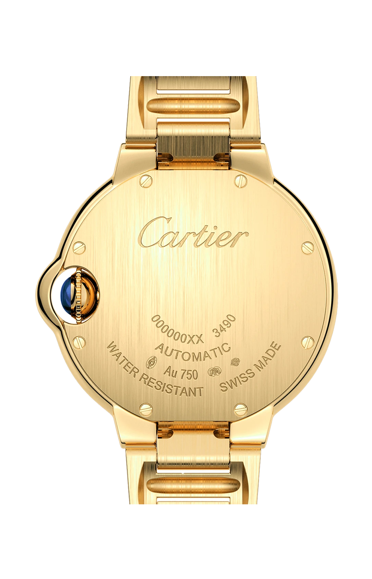 Orologio Ballon Bleu de Cartier, 33 mm. Movimento meccanico a carica automatica. Cassa in oro giallo 750/1000 ornata di 47 diamanti taglio brillante (0,68 carati). Corona scanalata ornata di uno zaffiro cabochon. Quadrante effetto soleil argentato. Lancette a forma di gladio d’acciaio azzurrato. Vetro zaffiro. Bracciale intercambiabile in oro giallo 750/1000. Spessore 10,16 mm. Impermeabile fino a 30 metri.