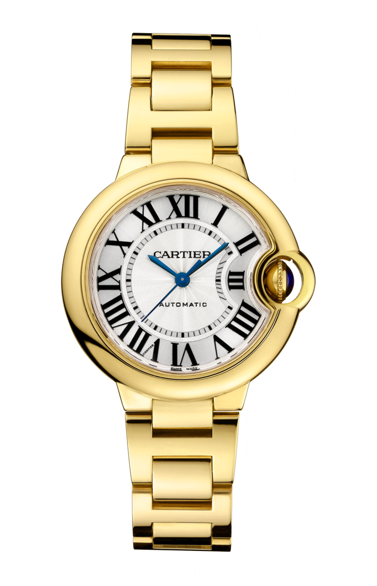 Orologio Ballon Bleu de Cartier, 33 mm. Movimento meccanico a carica automatica. Cassa in oro giallo 750/1000 e corona scanalata in oro giallo 750/1000 ornata di uno zaffiro cabochon. Quadrante argentato guilloché. Lancette a forma di gladio d’acciaio azzurrato. Vetro zaffiro. Bracciale intercambiabile in oro giallo 750/1000. Spessore 10,16 mm. Impermeabile fino a 30 metri.