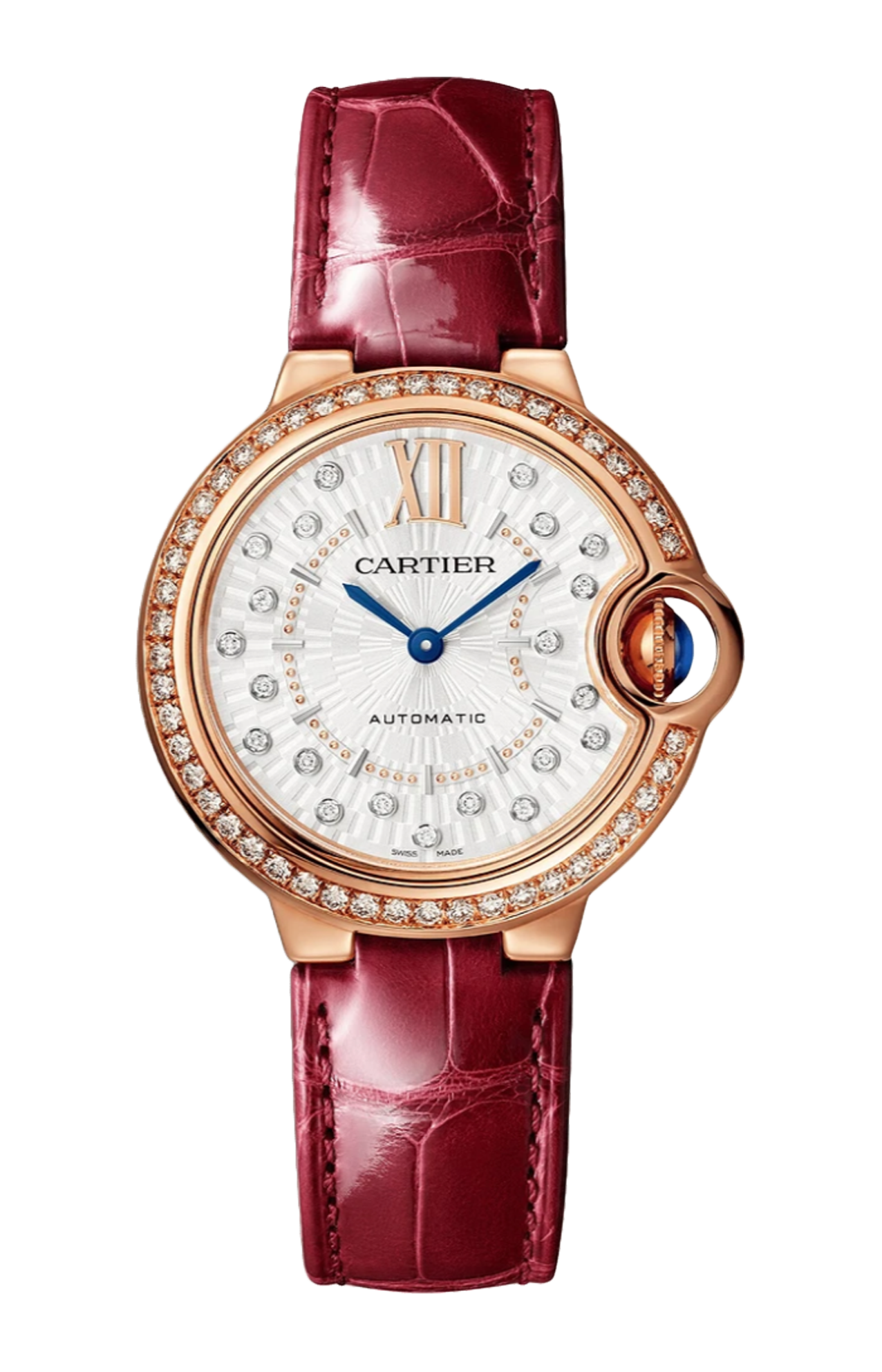 Orologio Ballon Bleu de Cartier, 33 mm. Movimento meccanico a carica automatica. Cassa in oro rosa 750/1000 ornata di 47 diamanti taglio brillante (0,68 carati). Corona scanalata ornata di uno zaffiro cabochon. Quadrante argentato effetto soleil opaco ornato di 21 diamanti taglio brillante (0,10 carati). Lancette a forma di gladio d’acciaio azzurrato. Vetro zaffiro. Cinturino d’alligatore bordeaux, fibbia ardiglione in oro rosa 750/1000. Spessore: 9,96 mm. Impermeabile fino a 30 metri.