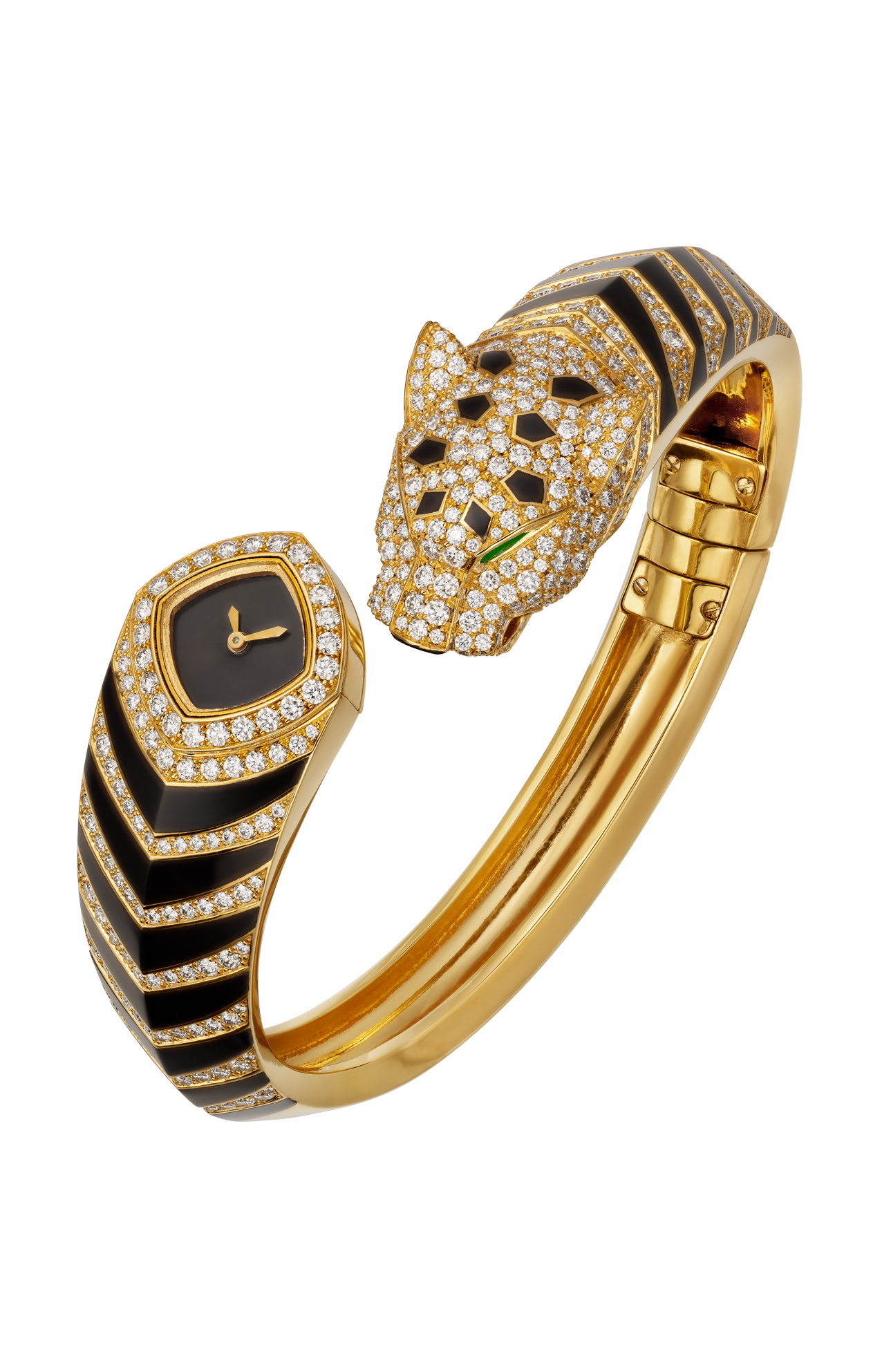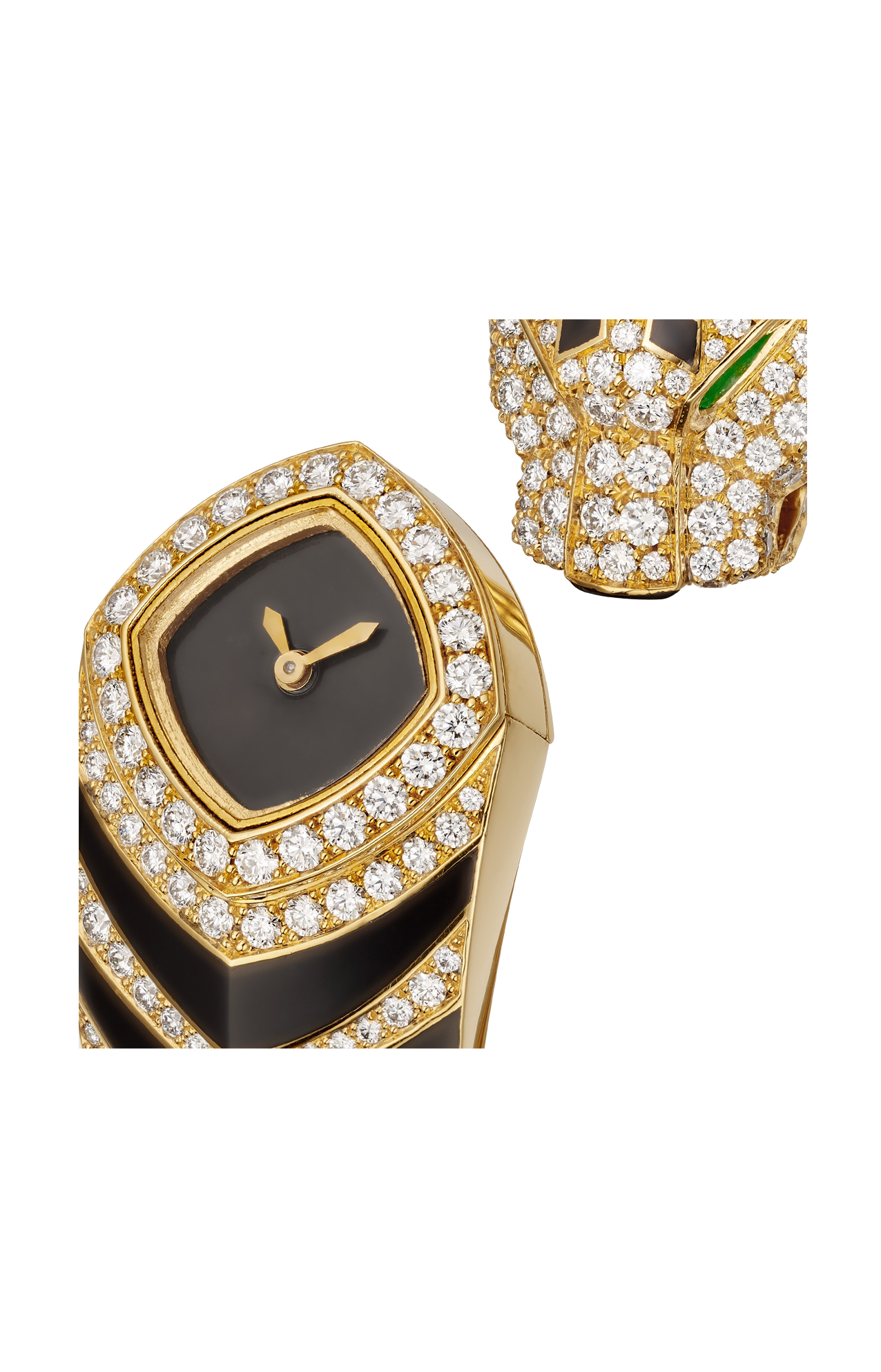 Orologio JONC Panthère de Cartier, 18 mm, movimento a quarzo. Cassa in oro giallo 750/1000, lunetta ornata di 24 diamanti taglio brillante (0,42 carati), testa di pantera e bracciale in oro giallo 750/1000 ornati di 492 diamanti taglio brillante (4,38 carati), occhi di smeraldo forma poire, motivi in lacca nera, quadrante in lacca nera, lancette a forma di gladio d’acciaio finitura dorata. Spessore 8,5 mm. Impermeabile fino a 30 metri. Misura 18.