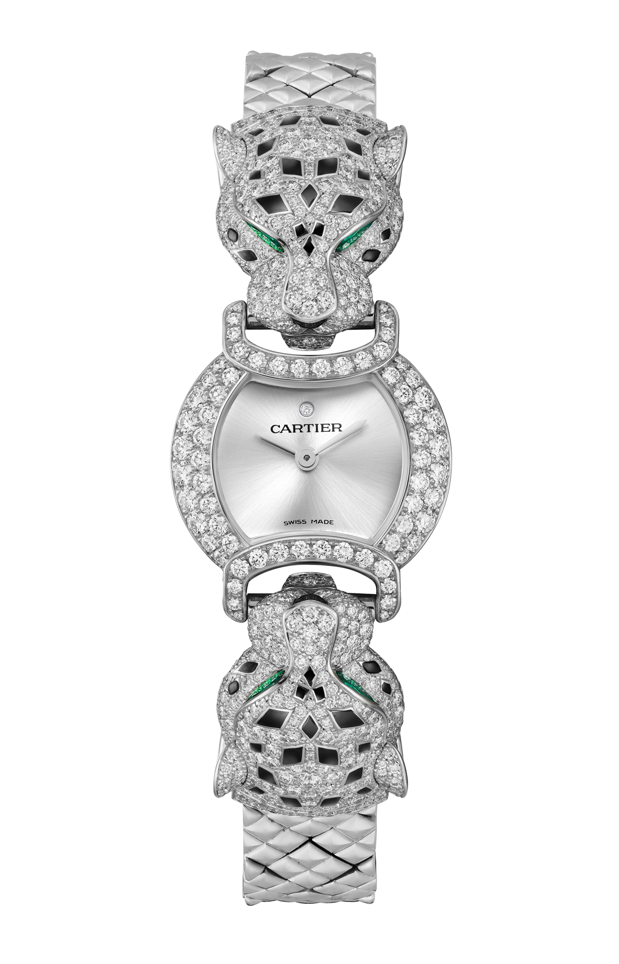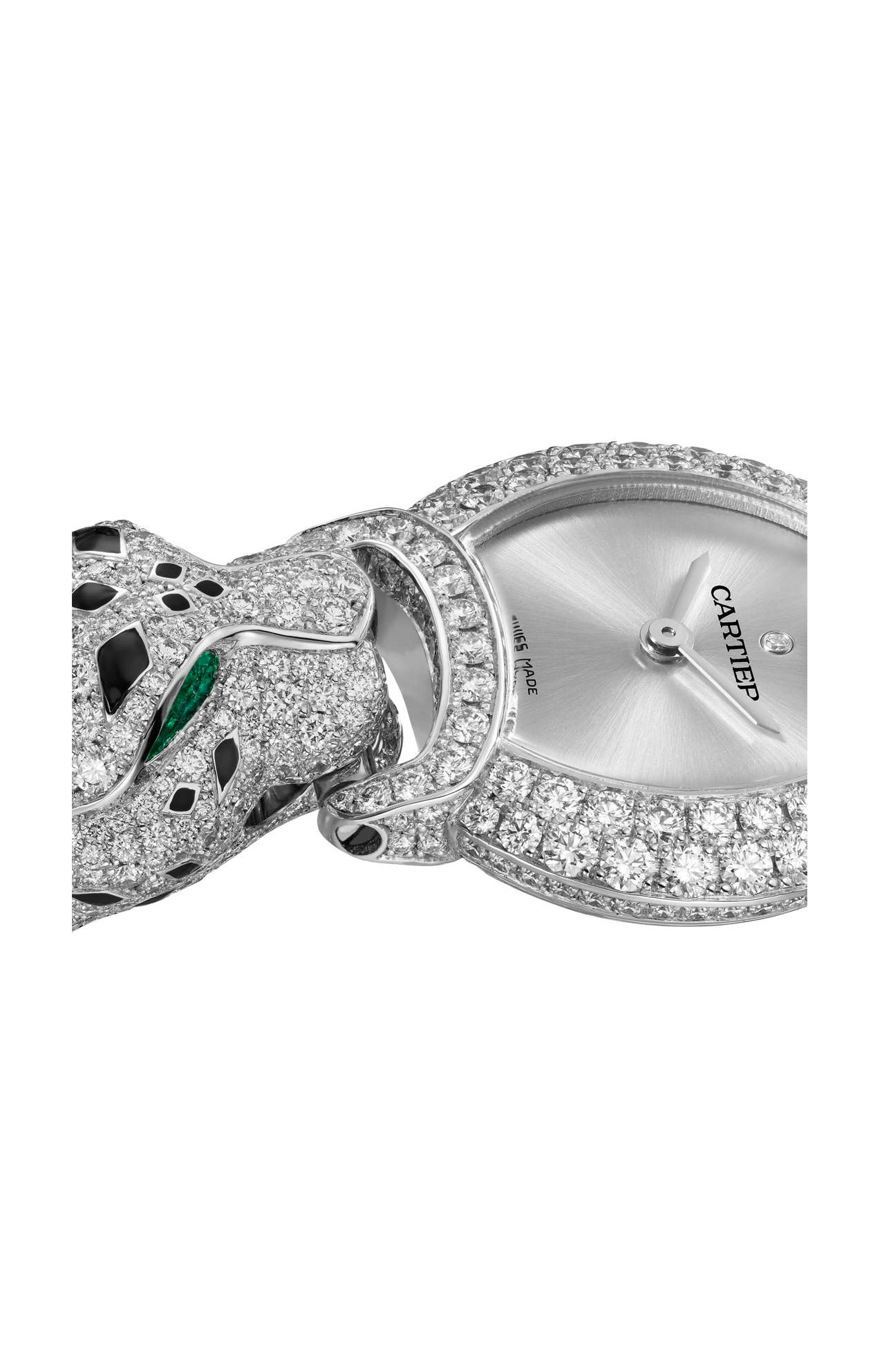 Orologio La Panthère, 22,2 mm, movimento al quarzo. Cassa in oro bianco rodiato 750/1000 ornata di 128 diamanti taglio brillante (1,08 carati), teste di pantera in oro bianco rodiato 750/1000 ornata di 572 diamanti taglio brillante (2,76 carati), occhi di smeraldo forma poire (0,30 carati), macchie e naso in lacca nera, quadrante argentato, lancette a forma di gladio in acciaio rodiato, bracciale in oro bianco rodiato 750/1000. Spessore della cassa 7,55 mm. Impermeabile fino a 30 metri.