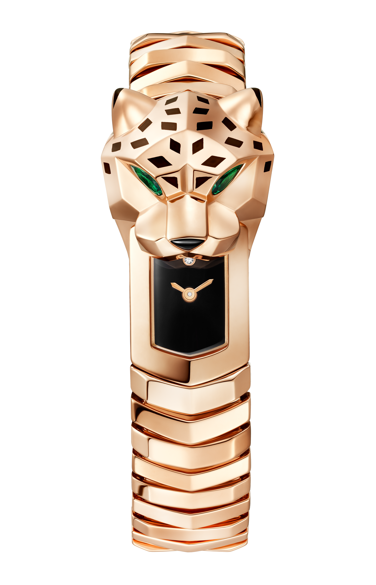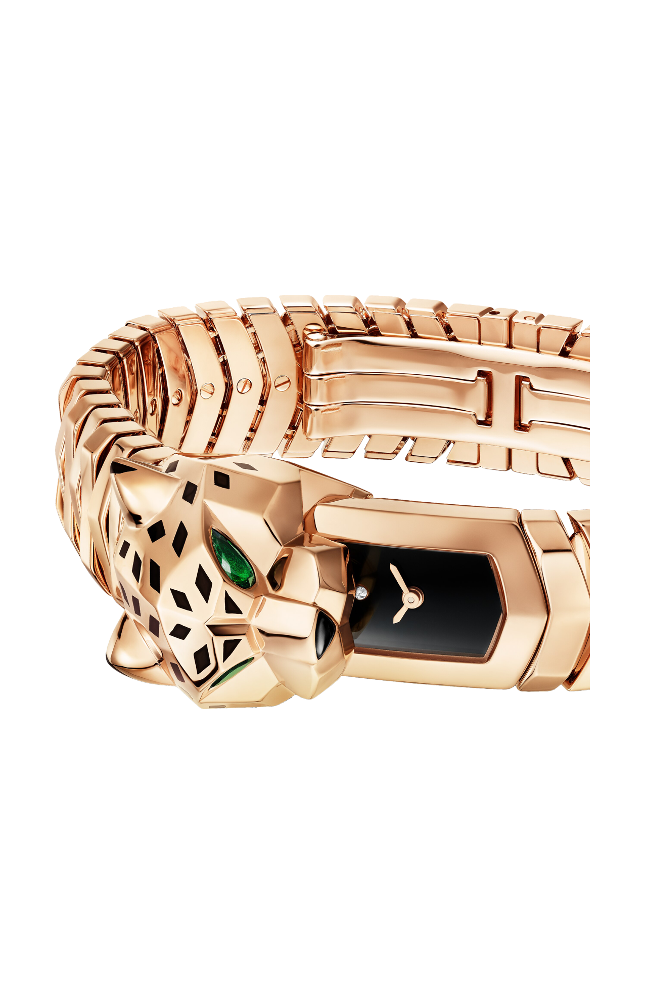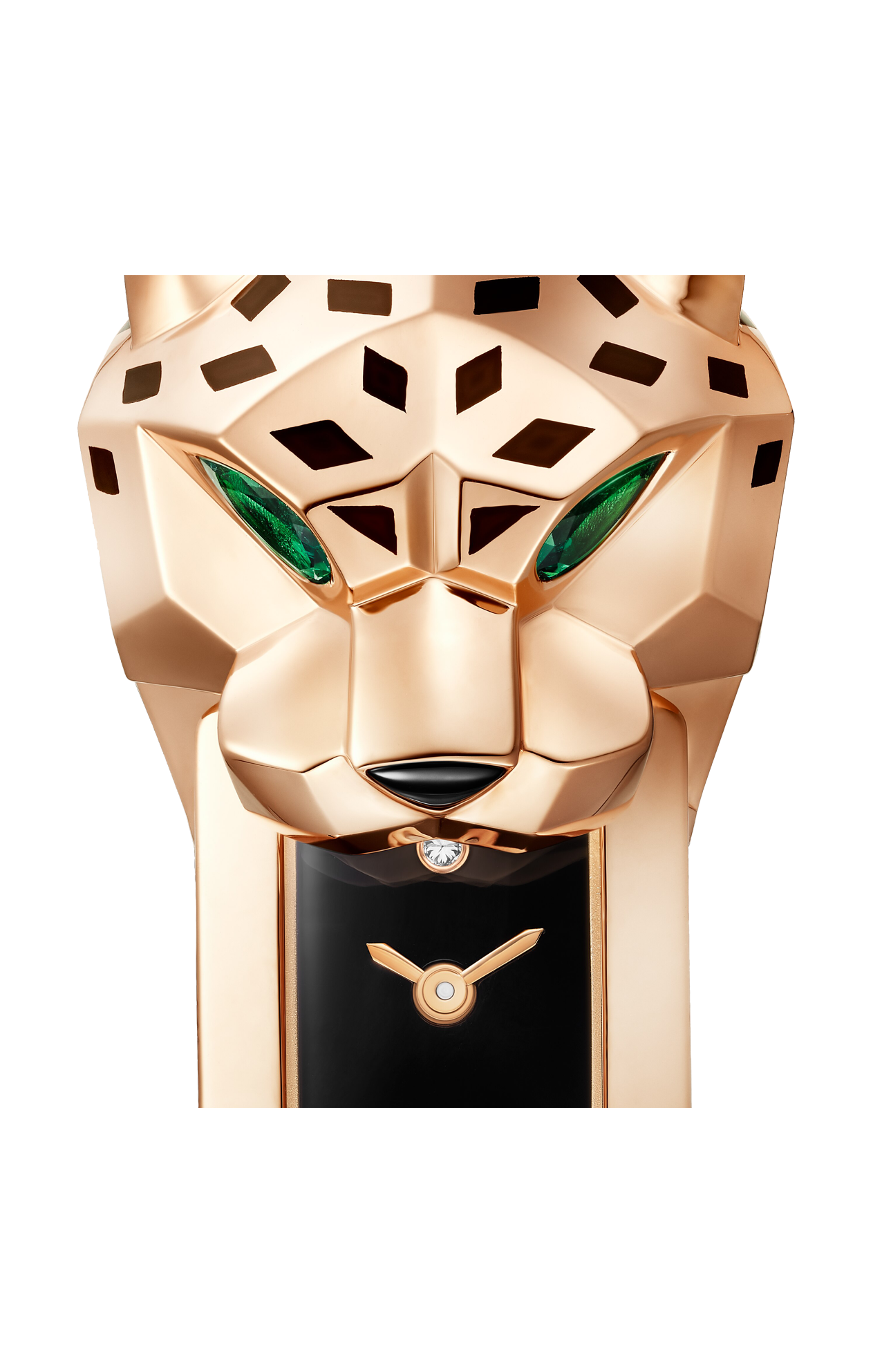 Orologio La Panthère de Cartier, 38,2 mm, movimento al quarzo. Cassa e testa di pantera in oro rosa 750/1000, occhi di tsavorite forma poire, naso in onice suiффé, macchie in lacca nera, quadrante laccato nero, lancette a forma di gladio d’acciaio, vetro zaffiro, bracciale in oro rosa 750/1000. Spessore della cassa 7,53 mm. Impermeabile fino a 30 metri.