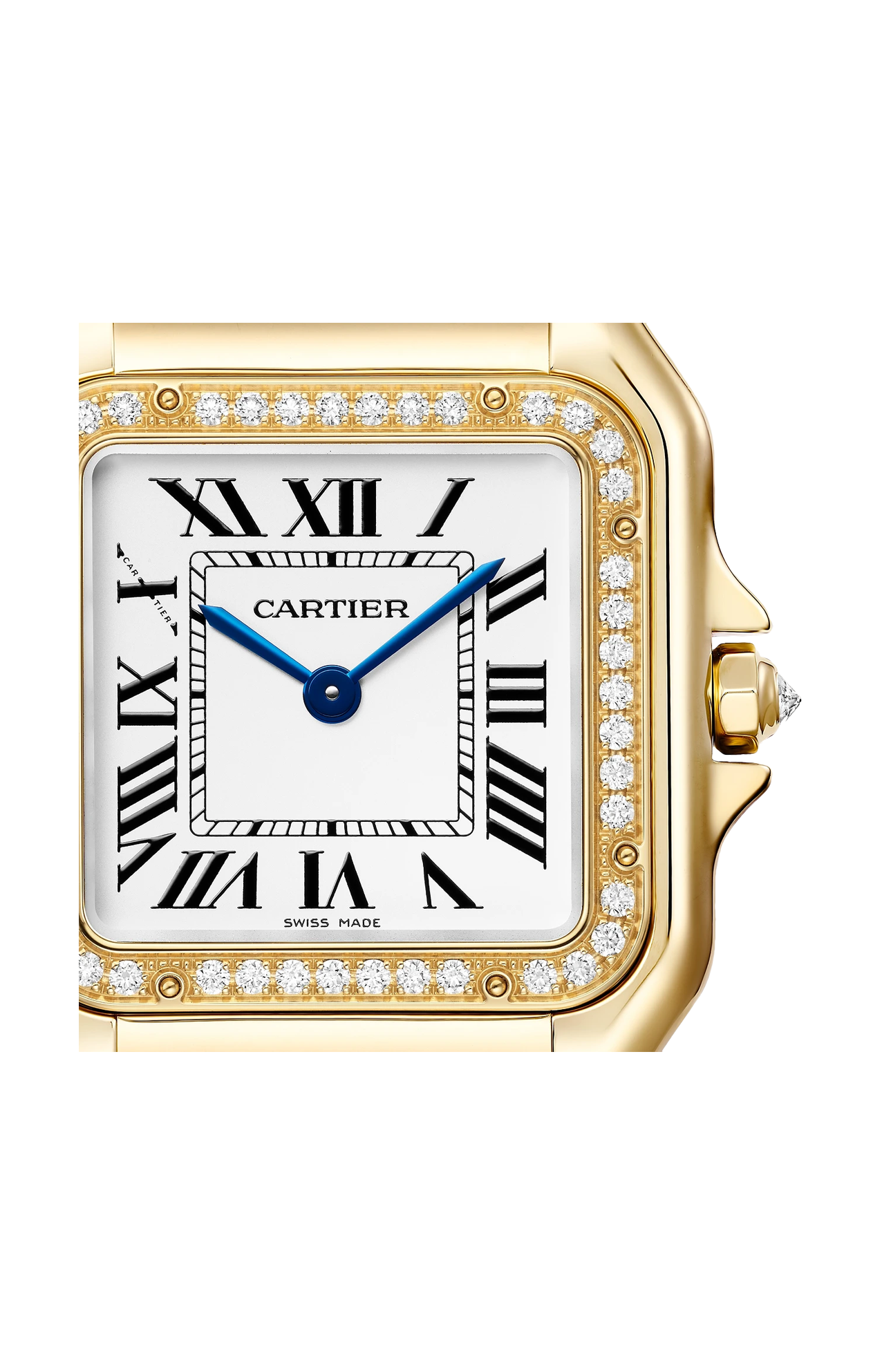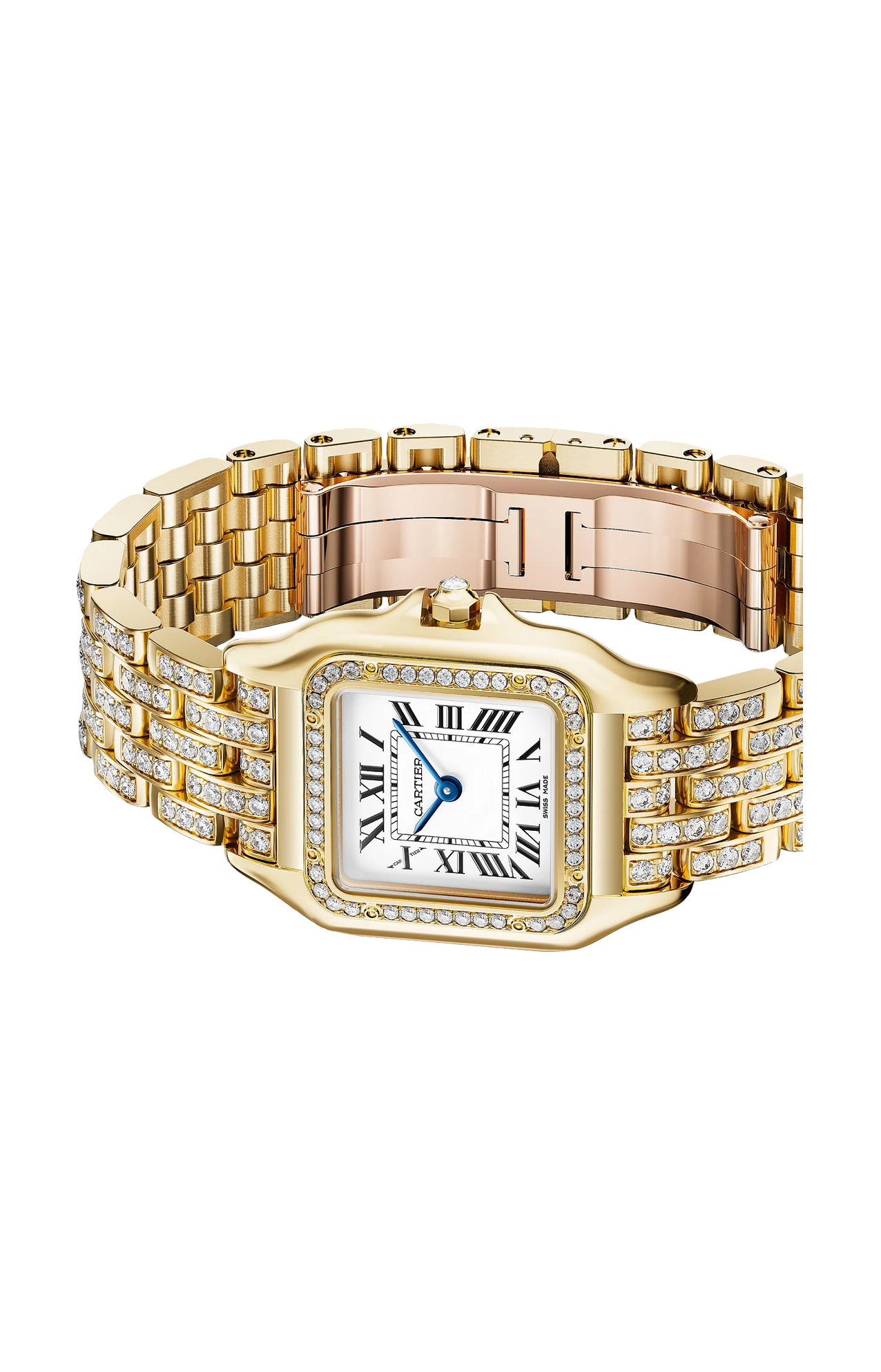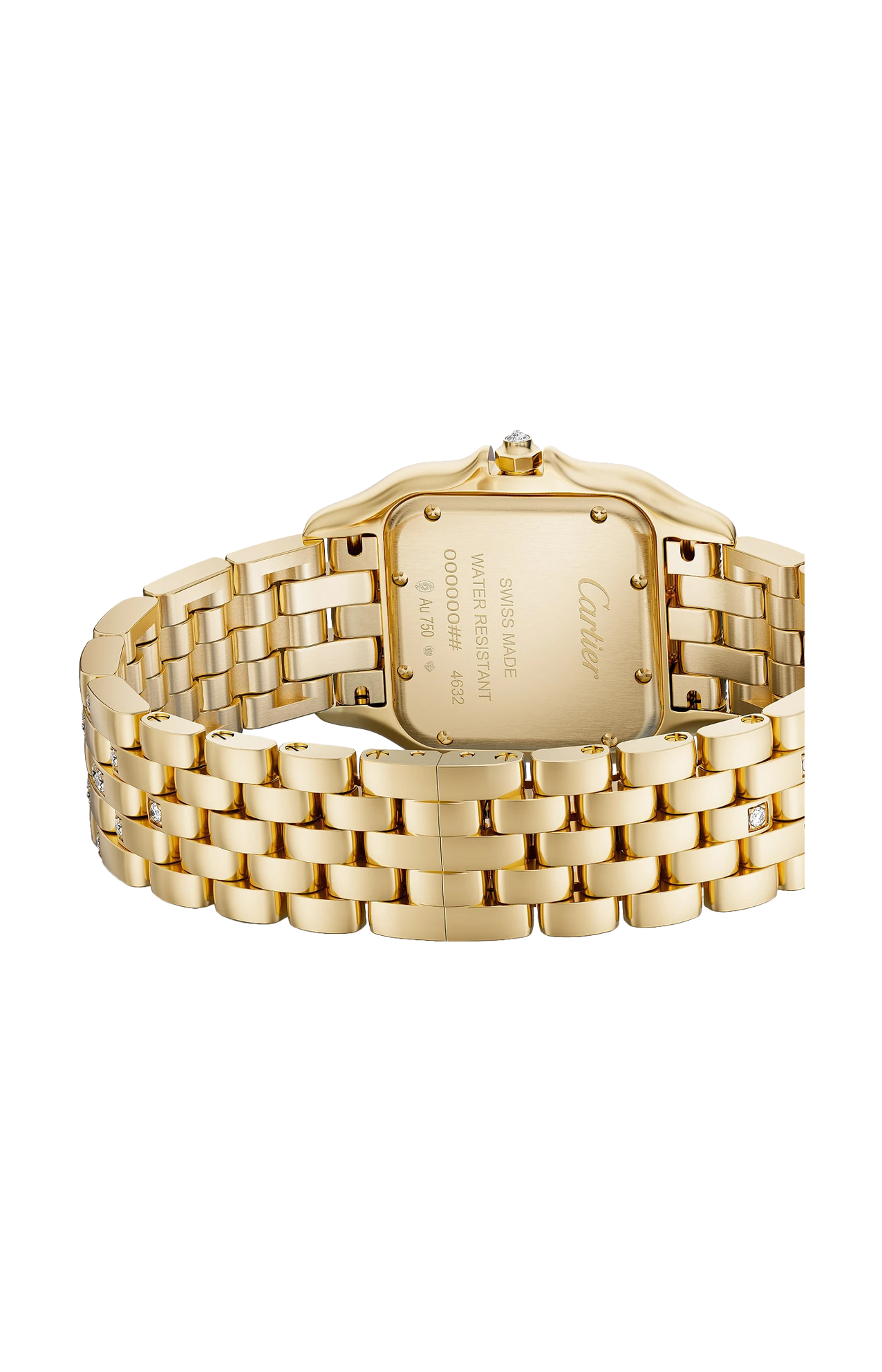 Orologio Panthère de Cartier, modello medio, movimento al quarzo. Cassa in oro giallo 750/1000 ornata di 44 diamanti taglio brillante (0,29 carati). Dimensioni della cassa: 36,5 x 26,7 mm, spessore: 6,8 mm. Corona ottagonale in oro giallo 750/1000 ornata di un diamante taglio brillante (0,02 carati). Quadrante argentato, lancette a forma di gladio d’acciaio azzurrato. Bracciale in oro giallo 750/1000 semi-ornato di 142 diamanti taglio brillante (3,18 carati). Impermeabile fino a 30 metri.