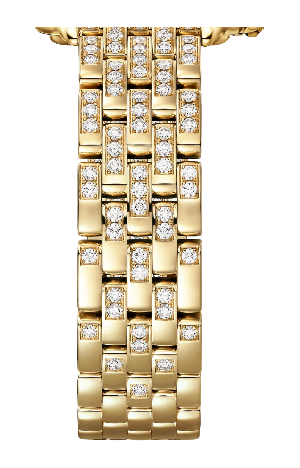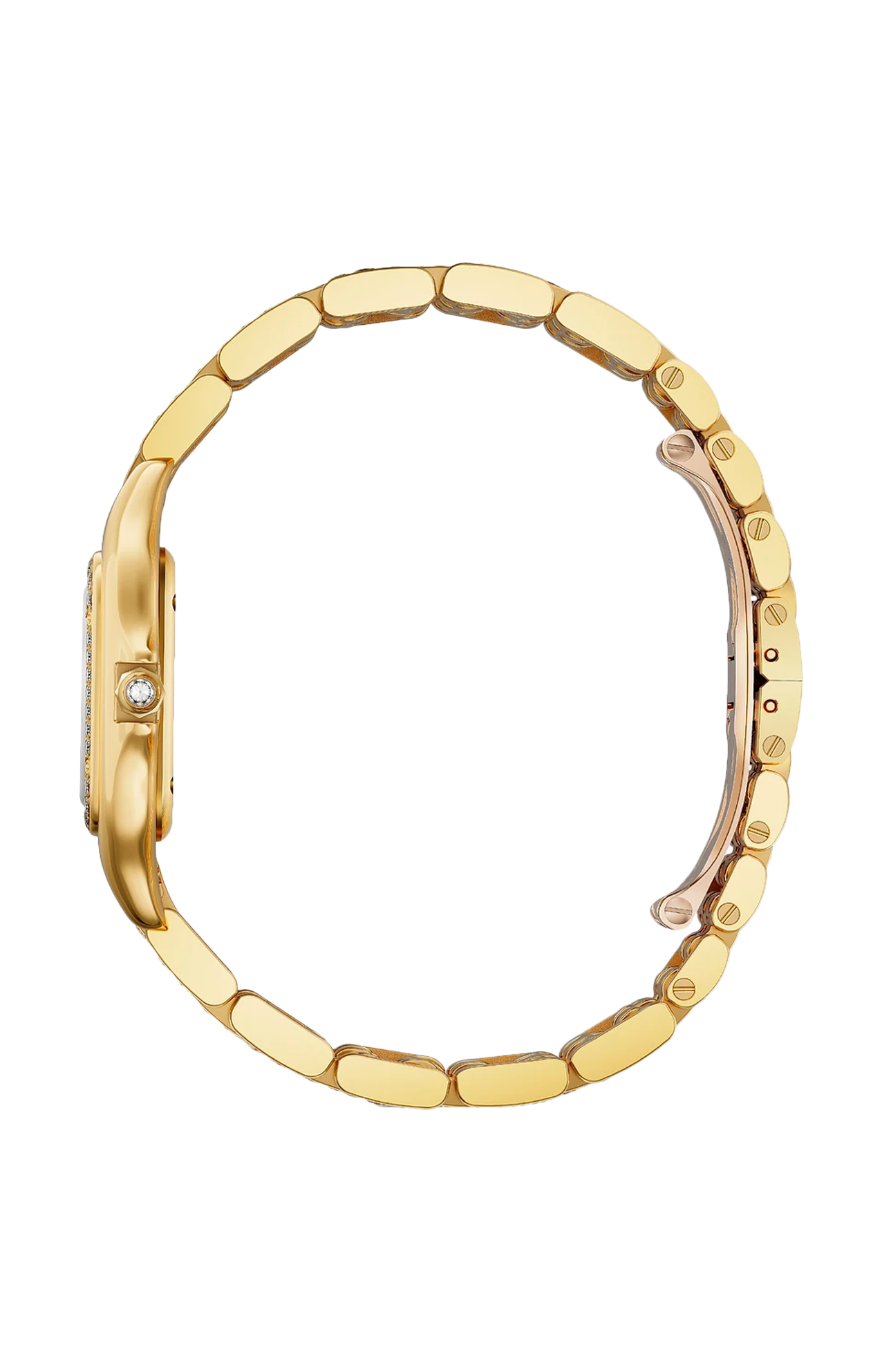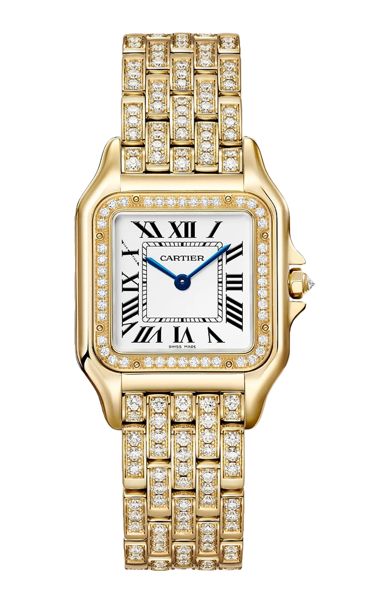 Orologio Panthère de Cartier, modello medio, movimento al quarzo. Cassa in oro giallo 750/1000 ornata di 44 diamanti taglio brillante (0,29 carati). Dimensioni della cassa: 36,5 x 26,7 mm, spessore: 6,8 mm. Corona ottagonale in oro giallo 750/1000 ornata di un diamante taglio brillante (0,02 carati). Quadrante argentato, lancette a forma di gladio d’acciaio azzurrato. Bracciale in oro giallo 750/1000 semi-ornato di 142 diamanti taglio brillante (3,18 carati). Impermeabile fino a 30 metri.