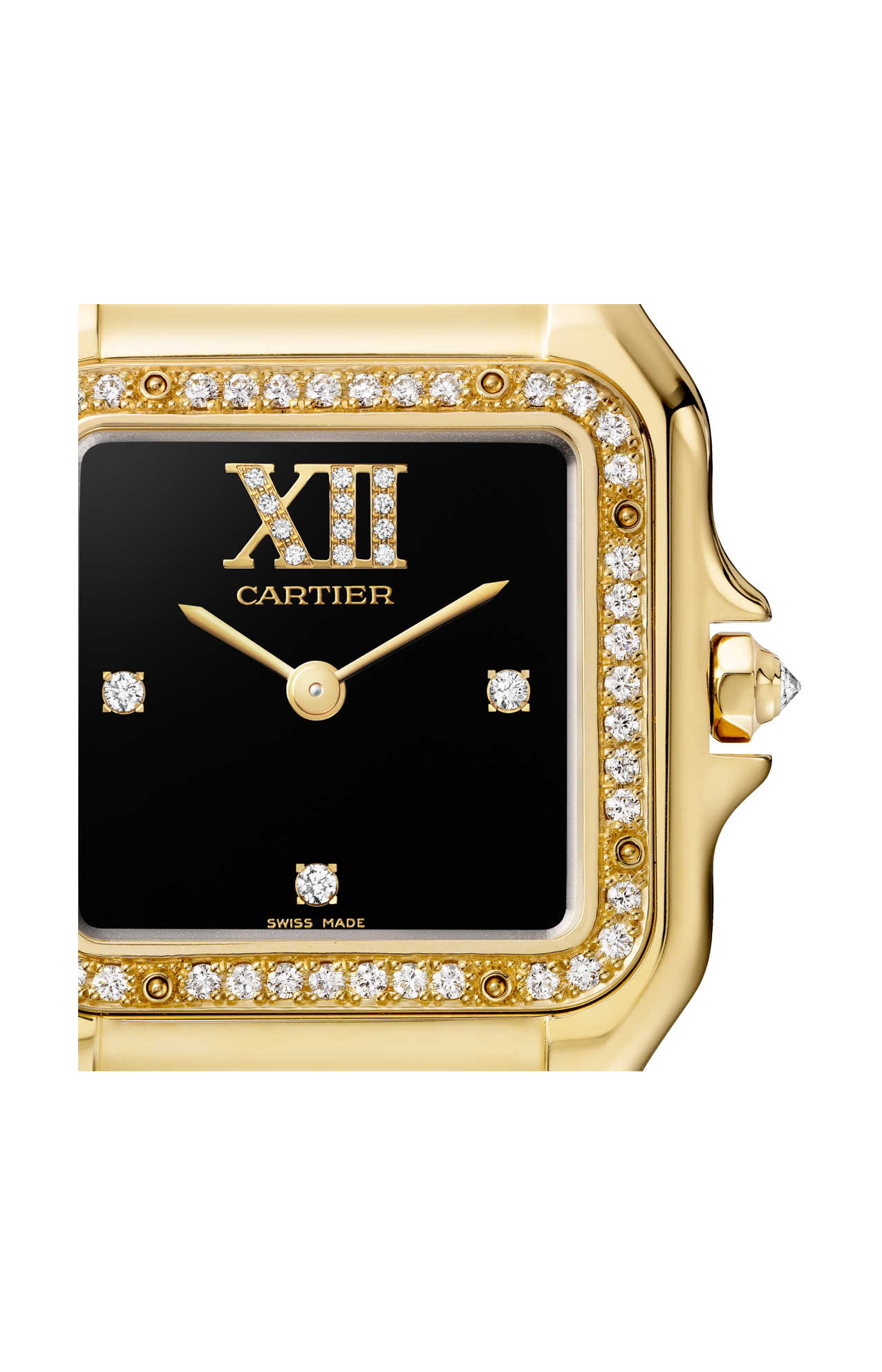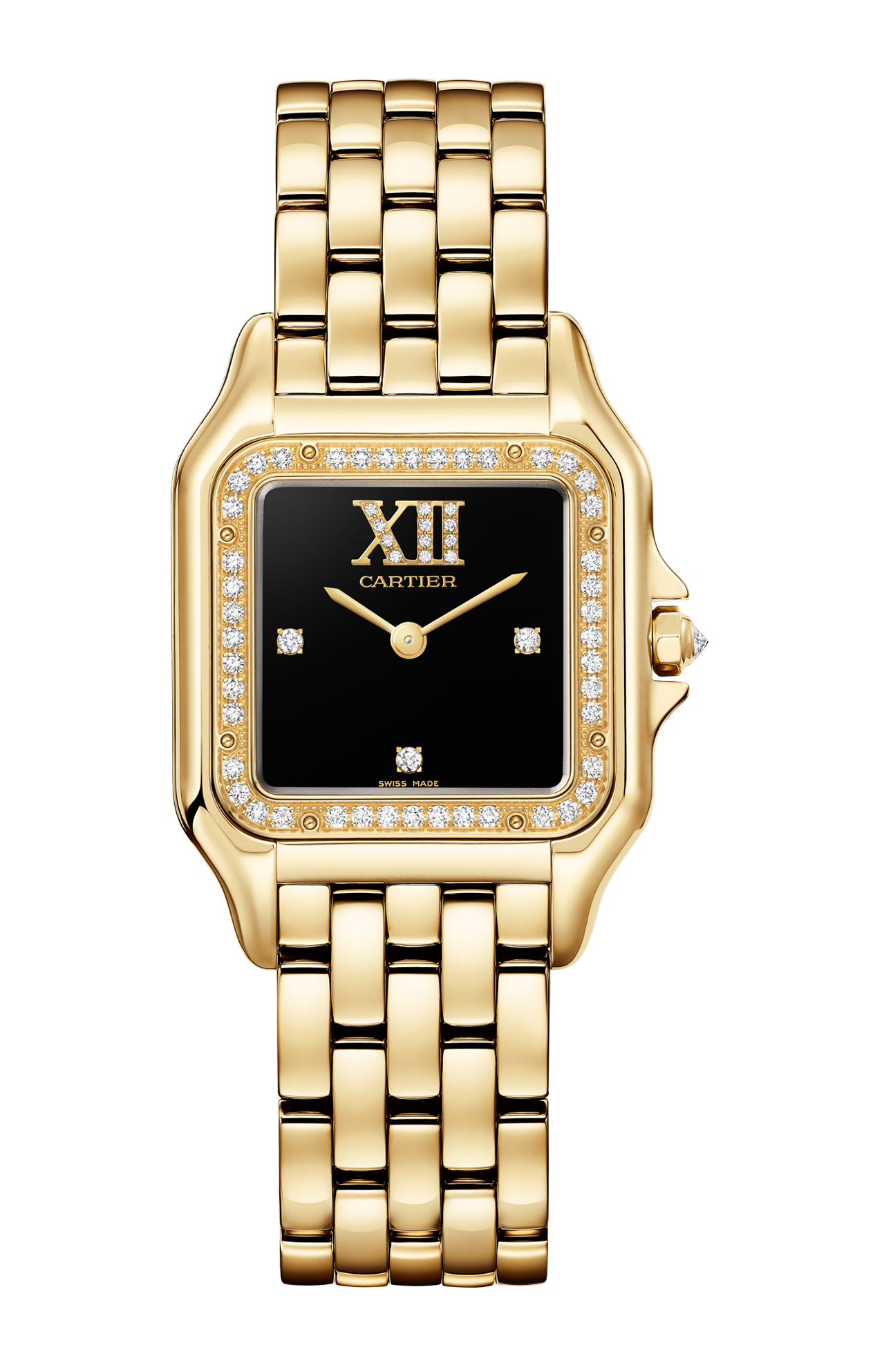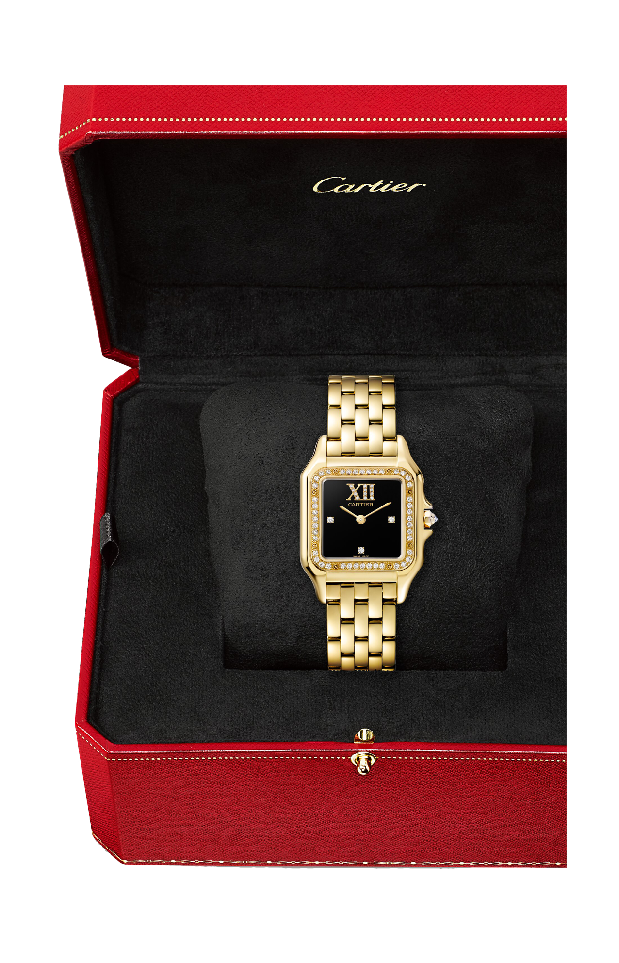Orologio Panthère de Cartier, modello medio, movimento al quarzo. Cassa in oro giallo 750/1000 ornata di 44 diamanti taglio brillante (0,28 carati). Dimensioni 36,5 x 26,7 mm, spessore 6,8 mm. Corona ottagonale in oro giallo 750/1000 ornata di un diamante taglio brillante (0,02 carati). Quadrante in lacca nera ornato di 15 diamanti taglio brillante (0,03 carati), lancette a forma di gladio finitura dorata. Bracciale in oro giallo 750/1000. Impermeabile fino 30 metri.