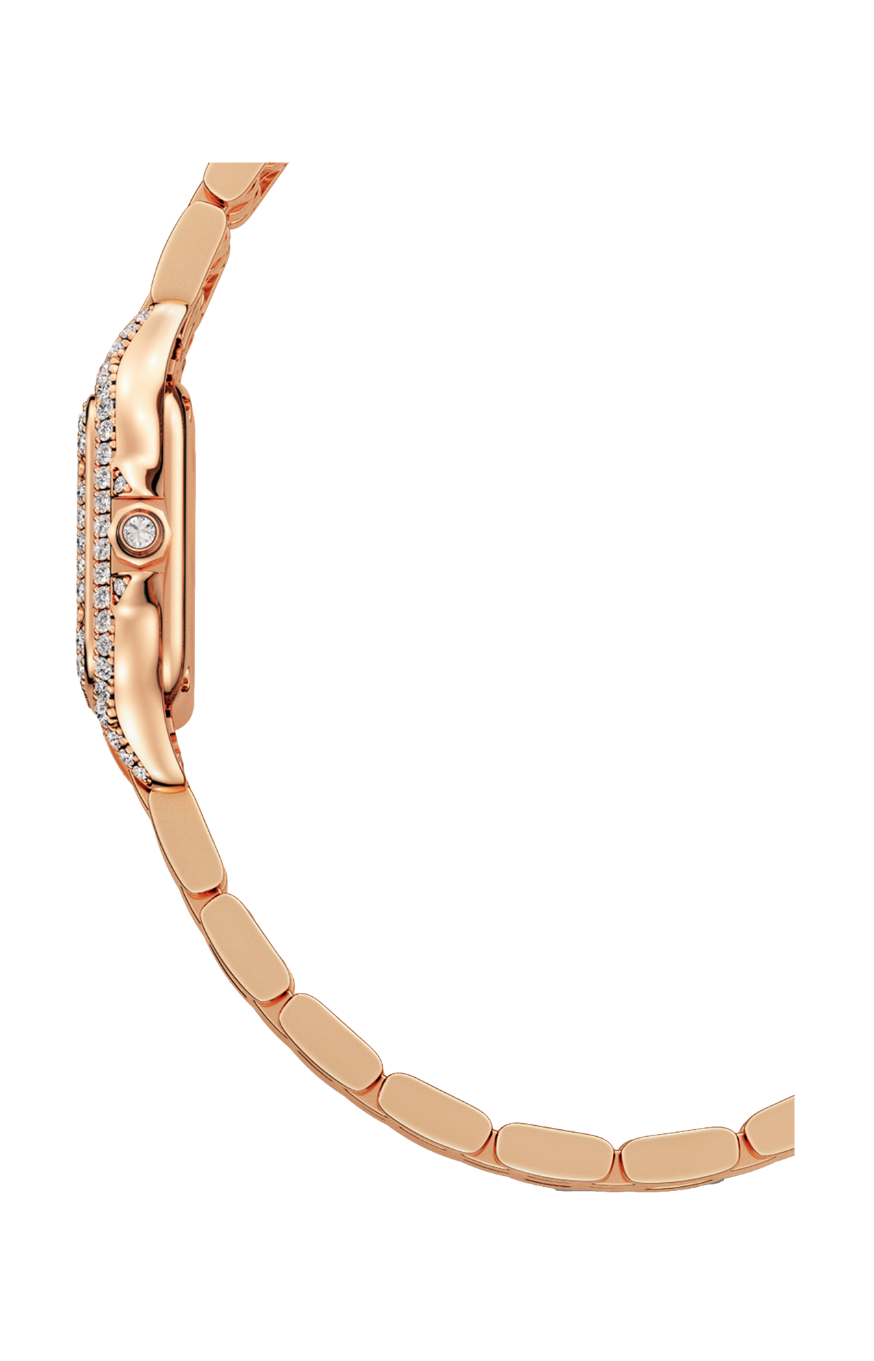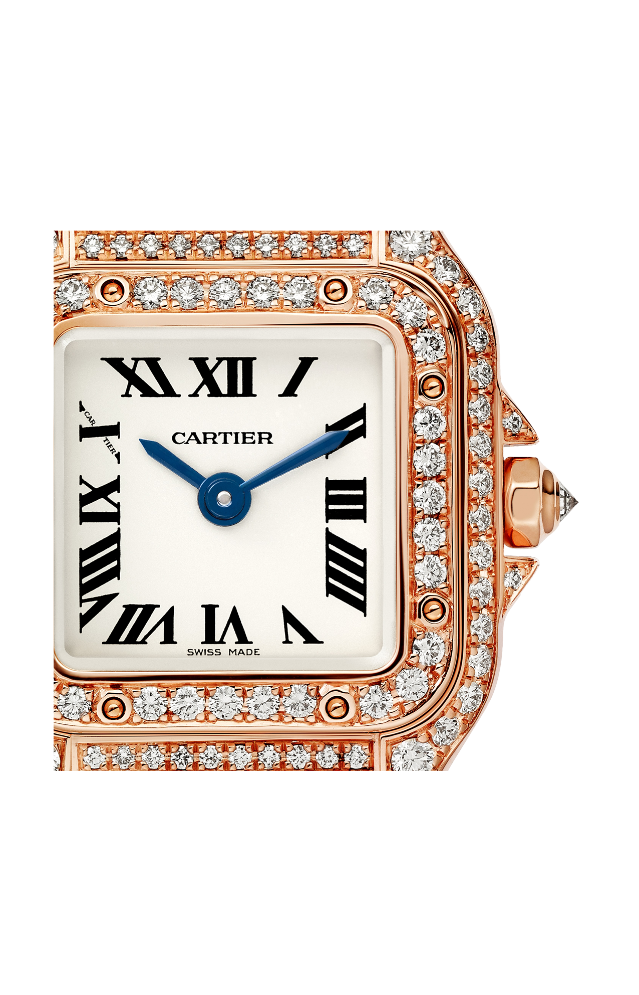 Orologio Panthère de Cartier, modello mini, movimento a quarzo. Cassa in oro rosa 750/1000 ornata di diamanti taglio brillante. Corona ottagonale in oro rosa 750/1000 ornata di un diamante taglio brillante. Quadrante argentato, lancette a forma di gladio d’acciaio azzurrato, vetro zaffiro. Bracciale in oro rosa 750/1000. Dimensioni 25 x 20 mm, spessore 6 mm. Impermeabile fino a 30 metri. Foto non contrattuale (la lunghezza del bracciale dell’orologio può variare leggermente).