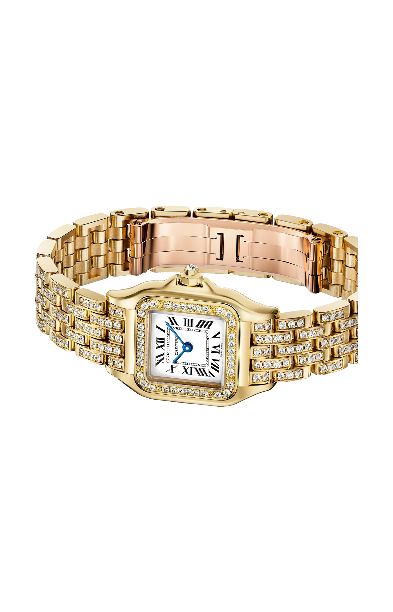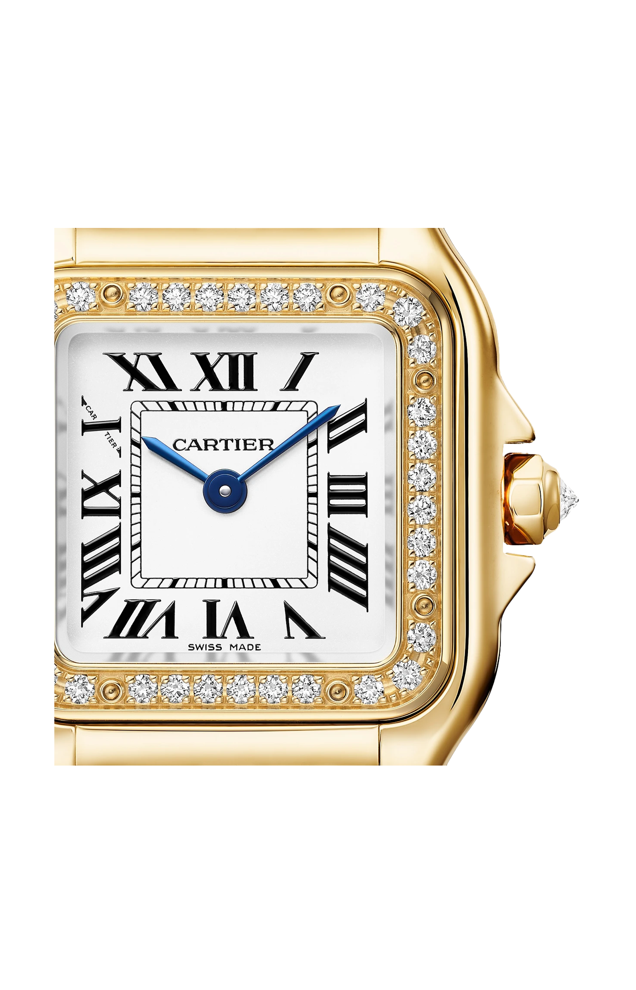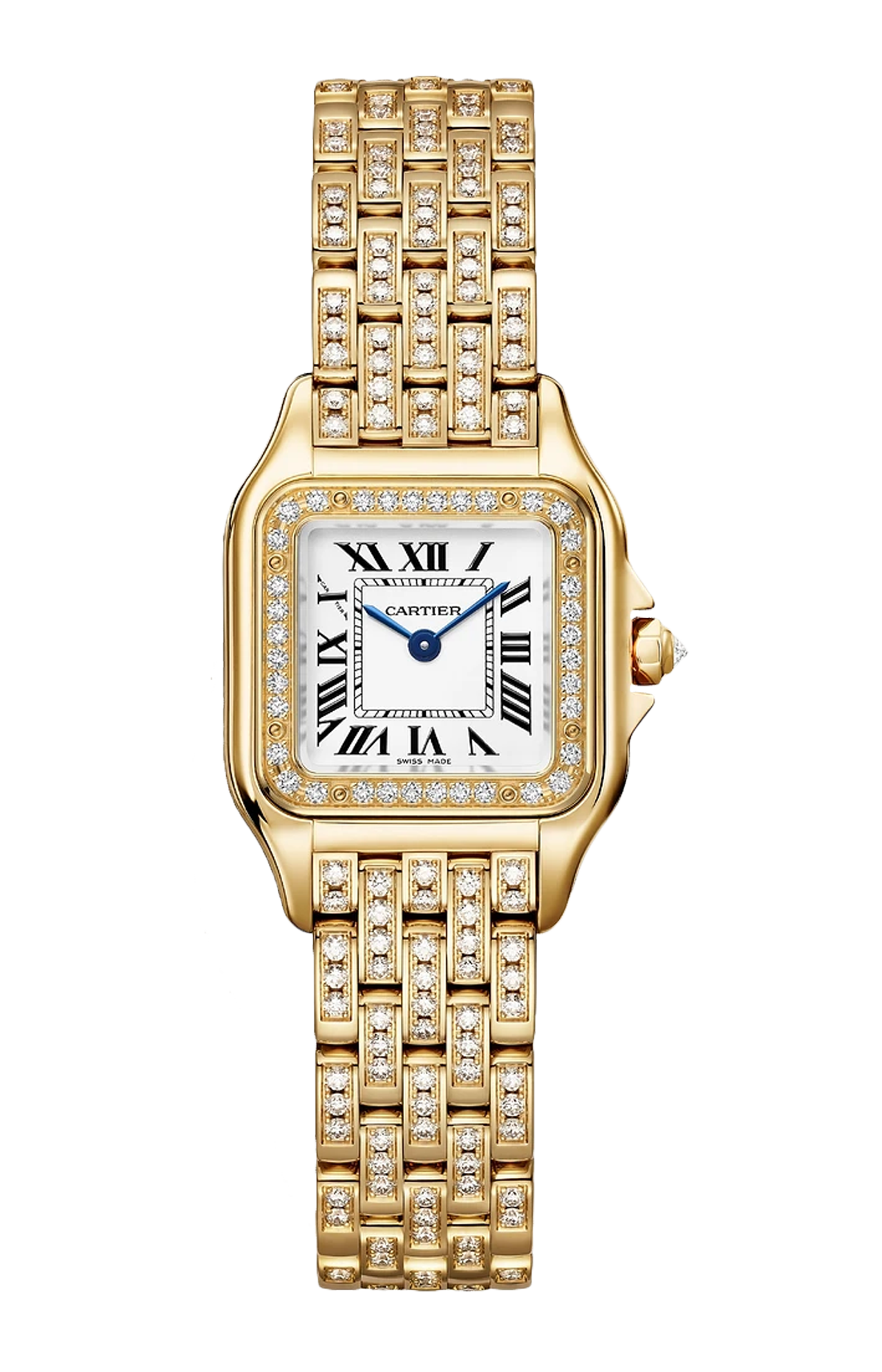Orologio Panthère de Cartier, modello piccolo, movimento al quarzo. Cassa in oro giallo 750/1000 ornata di 36 diamanti taglio brillante (0,25 carati). Dimensioni della cassa: 30,3 x 22 mm, spessore: 6,05 mm. Corona ottagonale in oro giallo 750/1000 ornata di un diamante taglio brillante (0,02 carati). Quadrante argentato, lancette a forma di gladio d’acciaio azzurrato. Bracciale in oro giallo 750/1000 semi-ornato di 142 diamanti taglio brillante (1,29 carati). Impermeabile fino a 30 metri.