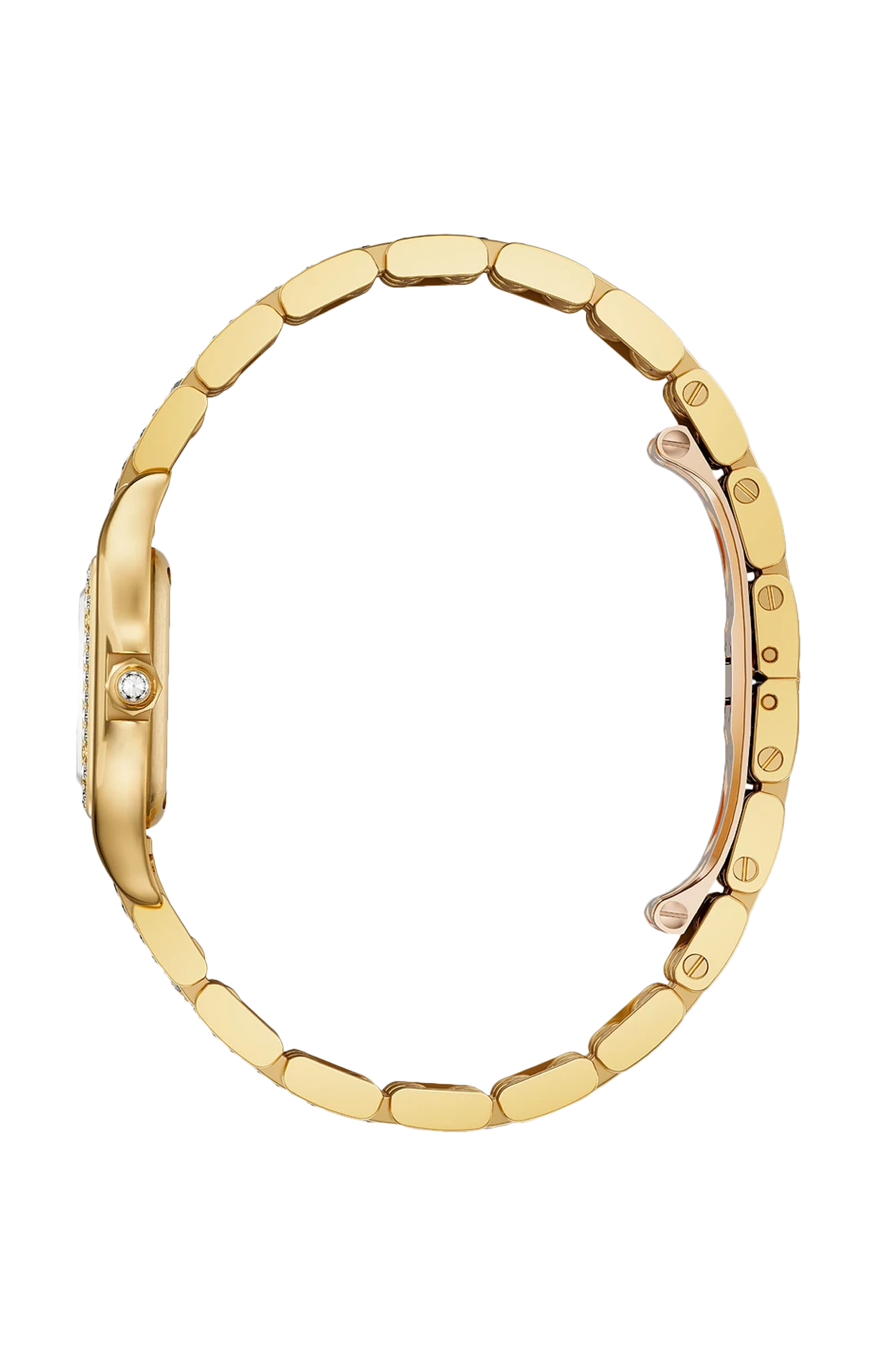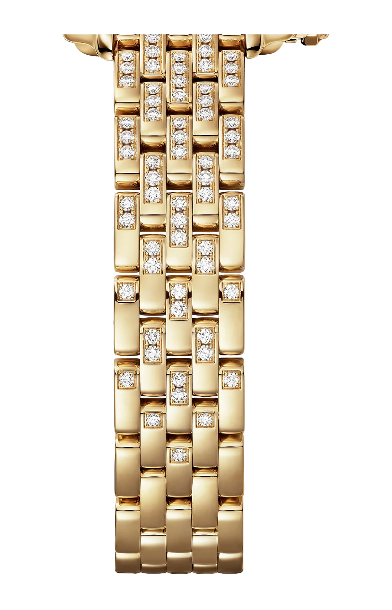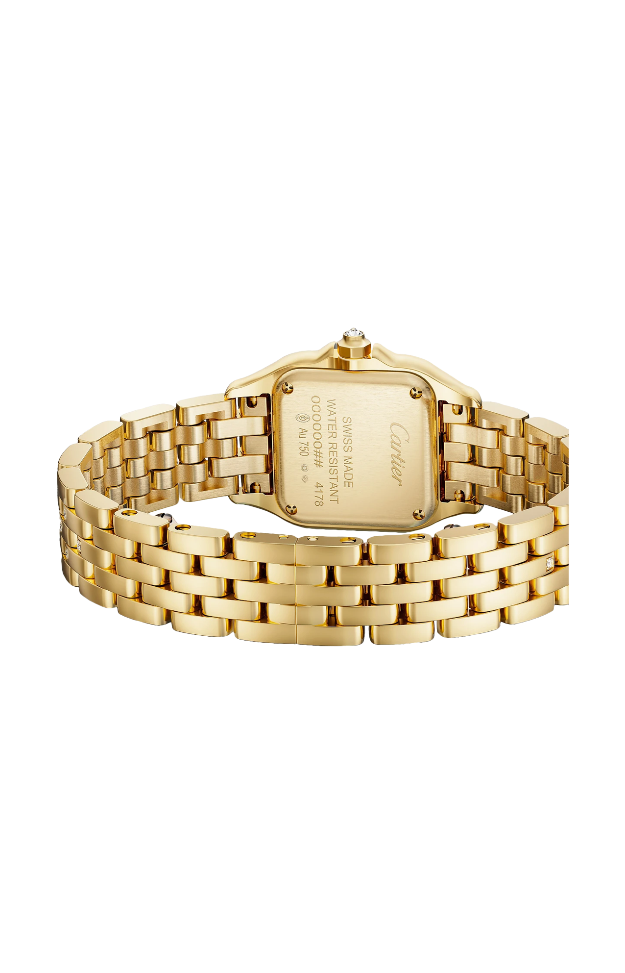 Orologio Panthère de Cartier, modello piccolo, movimento al quarzo. Cassa in oro giallo 750/1000 ornata di 36 diamanti taglio brillante (0,25 carati). Dimensioni della cassa: 30,3 x 22 mm, spessore: 6,05 mm. Corona ottagonale in oro giallo 750/1000 ornata di un diamante taglio brillante (0,02 carati). Quadrante argentato, lancette a forma di gladio d’acciaio azzurrato. Bracciale in oro giallo 750/1000 semi-ornato di 142 diamanti taglio brillante (1,29 carati). Impermeabile fino a 30 metri.