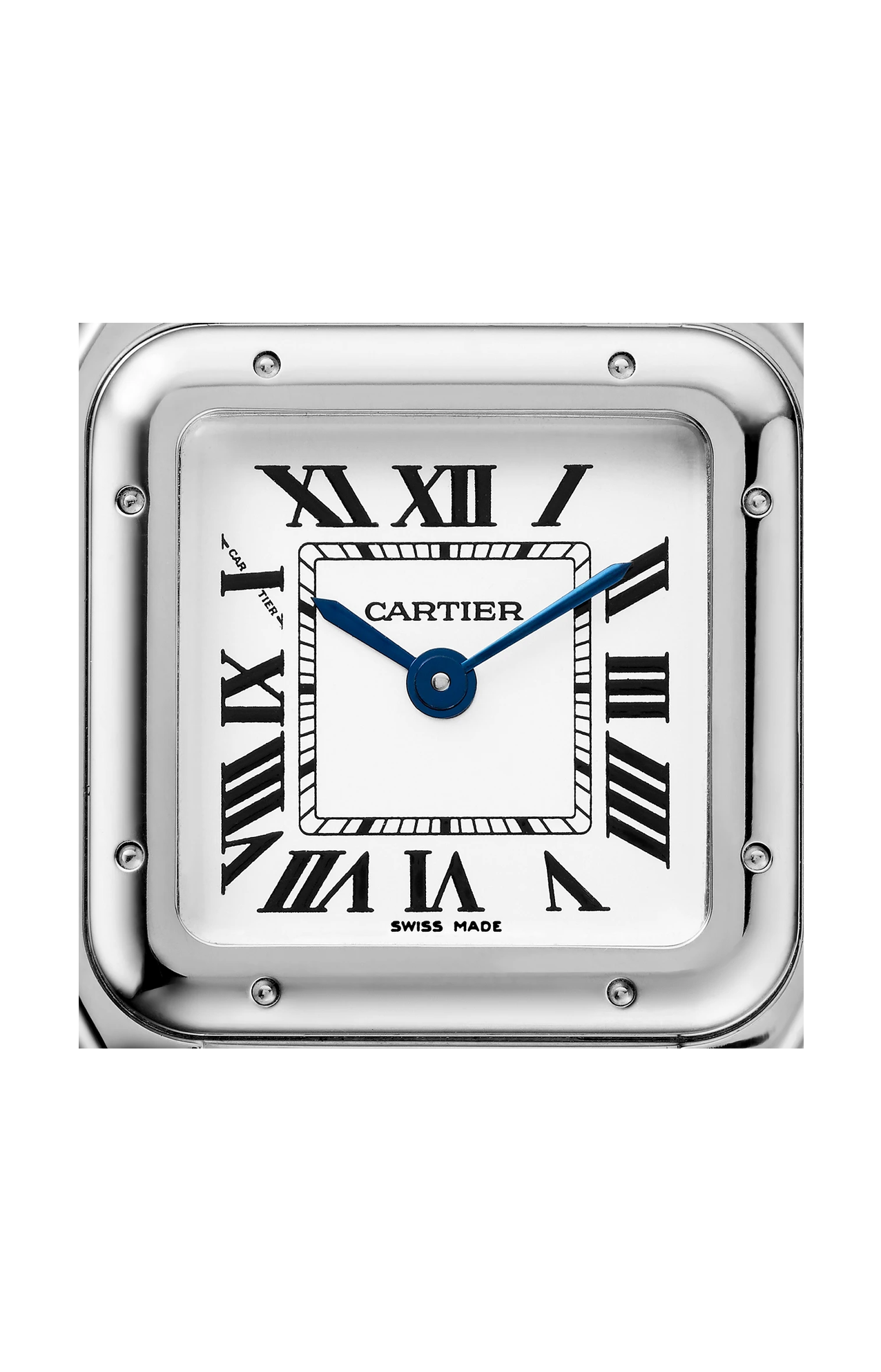 Orologio Panthère de Cartier, modello piccolo, movimento a quarzo. Cassa in acciaio, dimensioni 23 x 30 mm, spessore 6 mm, corona ornata di uno spinello sintetico blu, quadrante argentato, lancette a forma di gladio d'acciaio azzurrato, bracciale in acciaio, impermeabile fino a 30 metri. Insieme orologio e gioiello, la Panthère de Cartier rappresenta uno dei design più emblematici della maison. Conceputa negli anni '80 e più contemporanea che mai, questa creazione si pone come vera e propria icona della moda per le donne dallo stile deciso.
