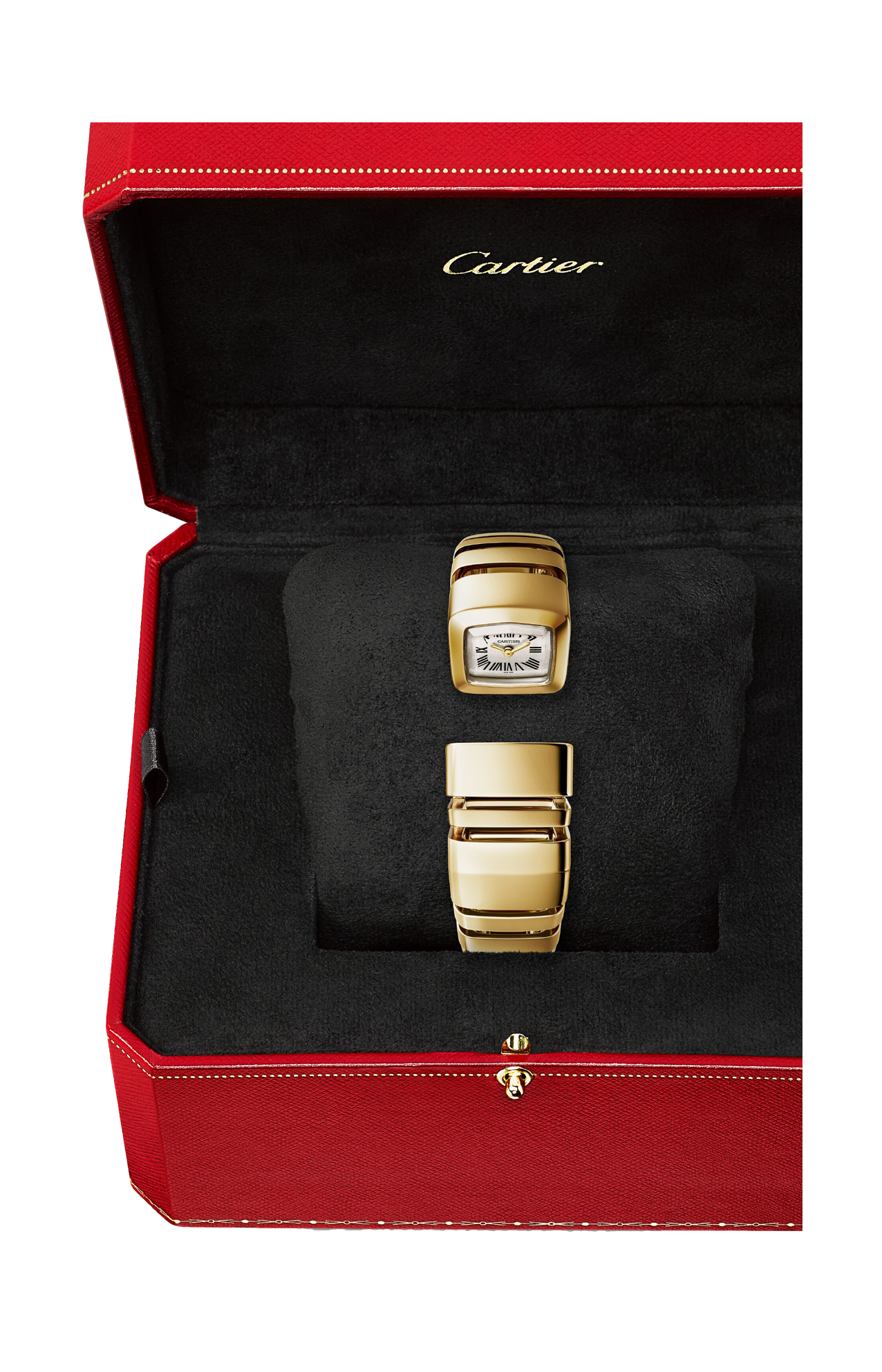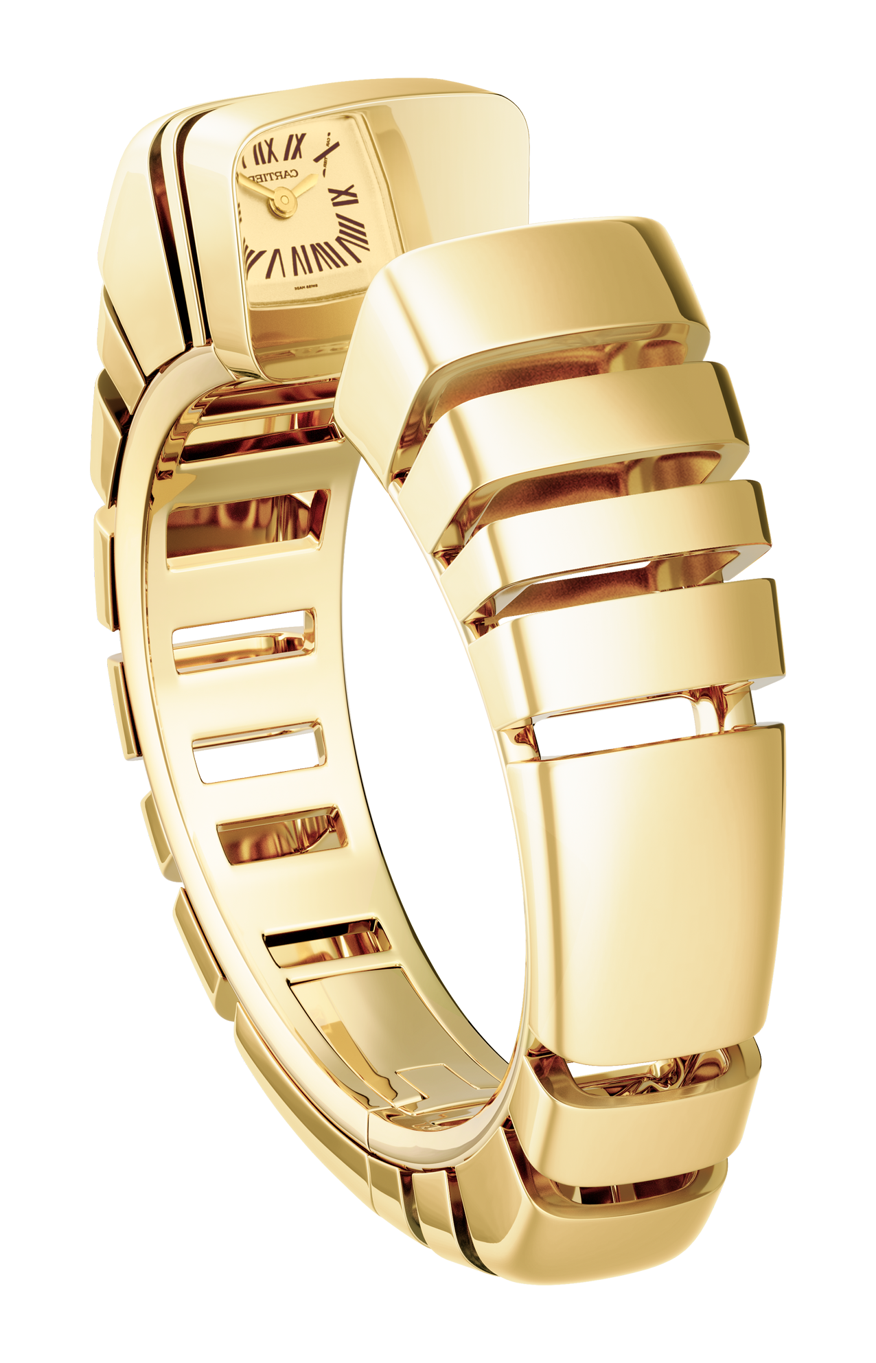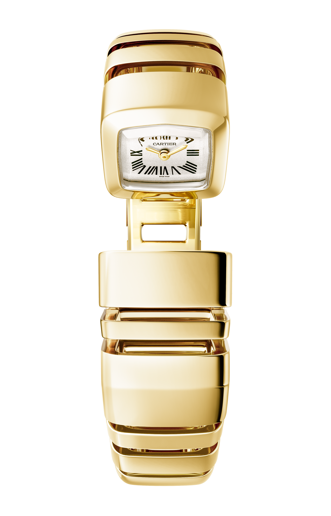 Orologio Reflection de Cartier, movimento al quarzo. Cassa in oro giallo 750/1000. Quadrante sabbiato, lancette a forma di gladio in acciaio finitura dorata, vetro zaffiro. Bracciale in oro giallo 750/1000. Dimensioni della cassa 18,4 mm x 17,5 mm, spessore 8,9 mm. Impermeabile fino a 30 metri.