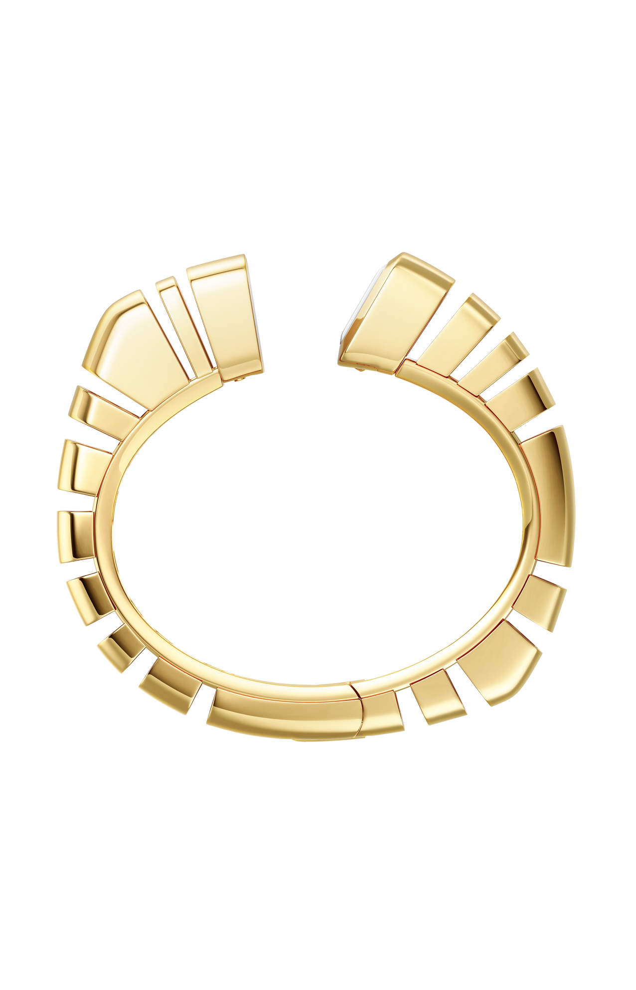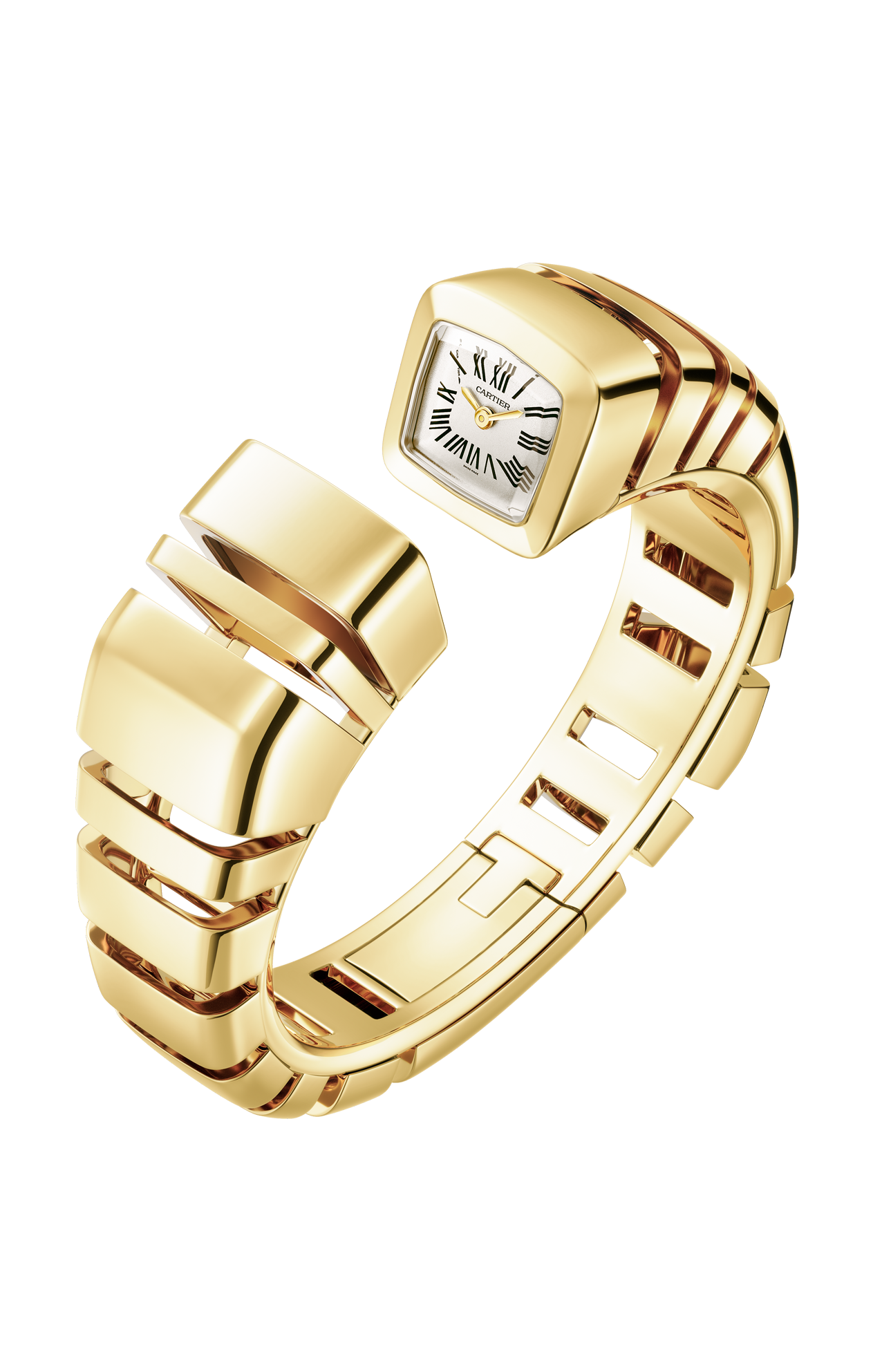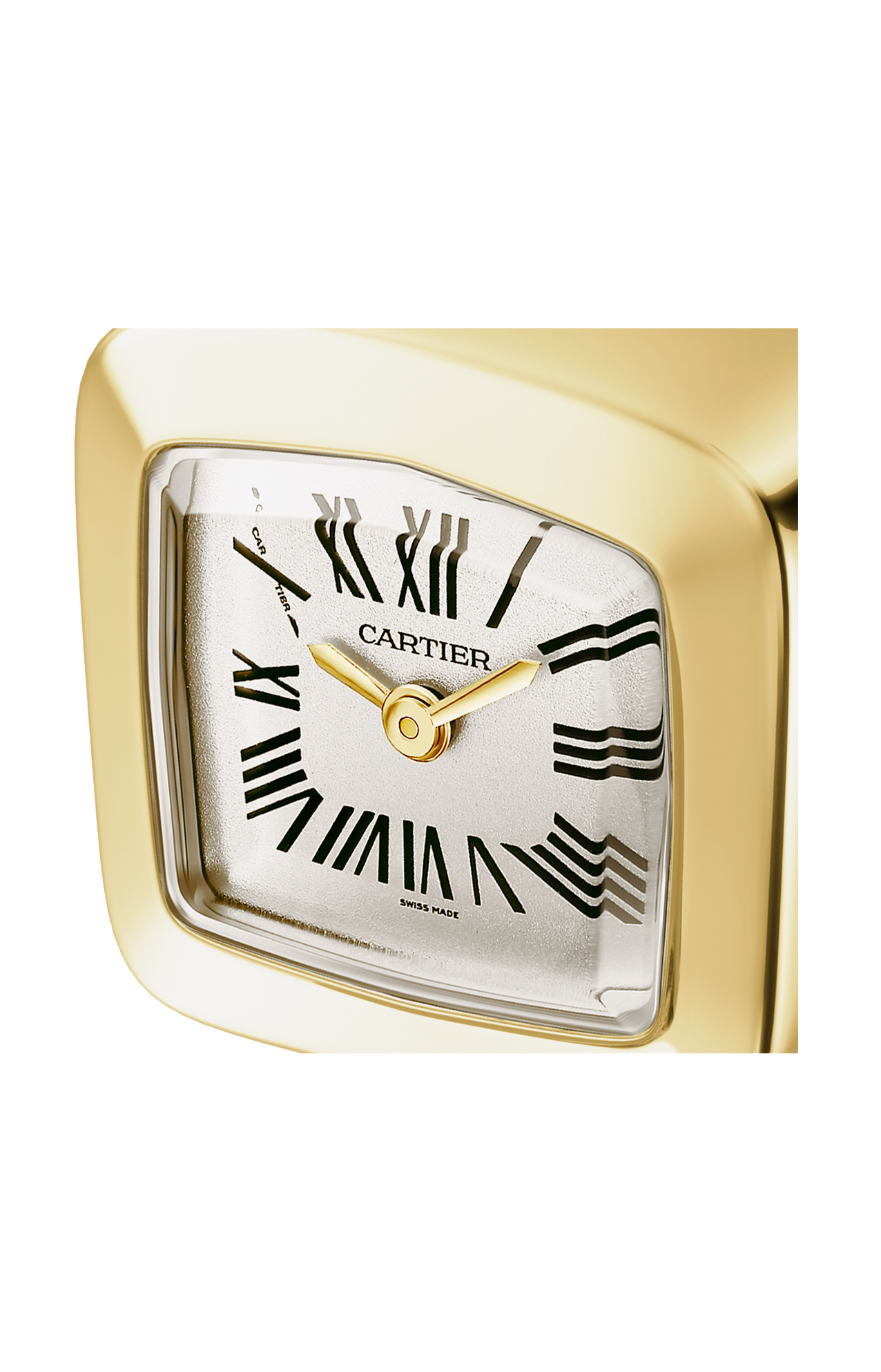 Orologio Reflection de Cartier, movimento al quarzo. Cassa in oro giallo 750/1000. Quadrante sabbiato, lancette a forma di gladio in acciaio finitura dorata, vetro zaffiro. Bracciale in oro giallo 750/1000. Dimensioni della cassa 18,4 mm x 17,5 mm, spessore 8,9 mm. Impermeabile fino a 30 metri.