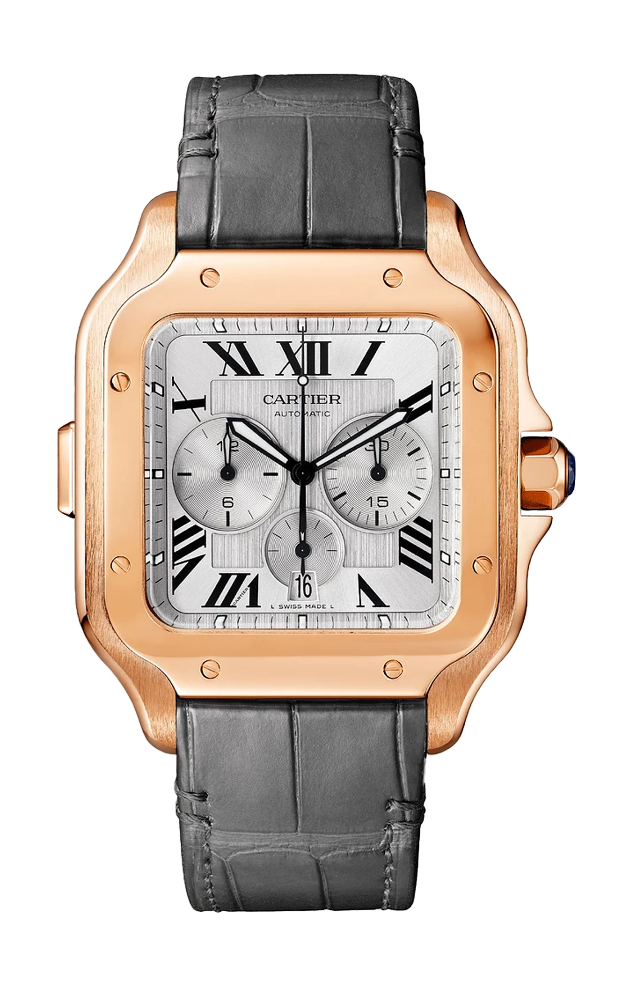 Orologio Santos, modello extra-large, movimento meccanico cronografo a carica automatica, calibro 1904 CH MC. Cassa in oro rosa 750/1000, corona ettagonale ornata di uno zaffiro sfaccettato, quadrante argentato satinato, lancette luminose a forma di gladio d’acciaio nero, vetro zaffiro. Primo cinturino d’alligatore semi-opaco grigio scuro, secondo cinturino in caucciù, fibbia pieghevole in oro rosa 750/1000. Entrambi sono dotati del sistema d’intercambiabilità QuickSwitch. Larghezza della cassa 43,3 mm, spessore 12,4 mm. Impermeabile fino a 100 metri.