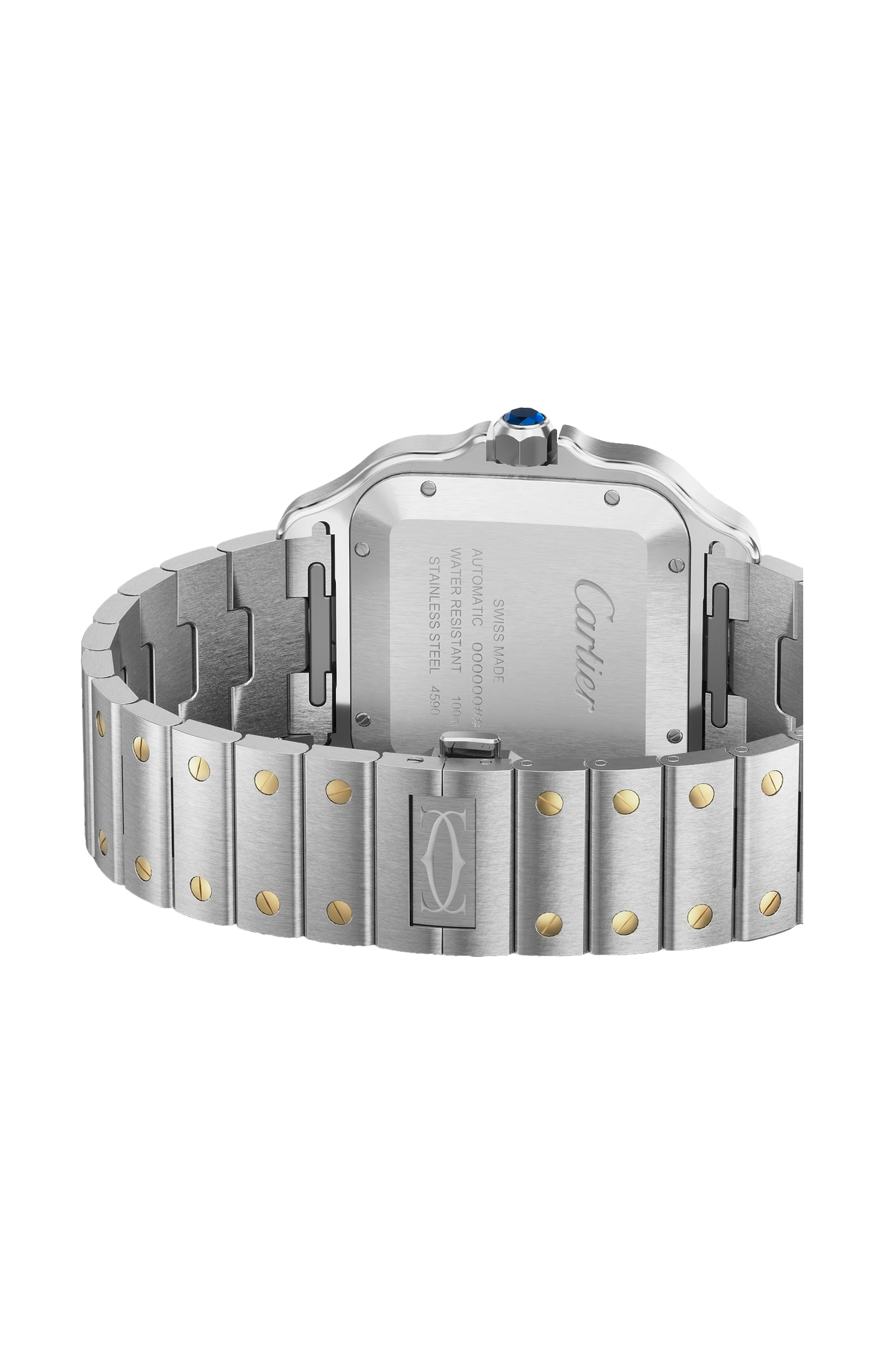 Orologio Santos de Cartier, modello grande, movimento meccanico a carica automatica, calibro 1847 MC. Cassa in acciaio, lunetta in oro giallo 750/1000, corona ettagonale ornata di uno spinello sintetico blu sfaccettato, quadrante grigio antracite sfumato satinato effetto soleil, lancette a forma di gladio in acciaio dorato lucido, vetro zaffiro. Bracciale in acciaio con sistema di regolazione della misura “SMARTLINK”. Secondo cinturino in alligatore grigio, fibbia pieghevole intercambiabile in acciaio. Bracciale e cinturino sono entrambi dotati del sistema d’intercambiabilità “QUICKSWITCH”. Larghezza della cassa 39,8 mm, spessore 9,38 mm. Impermeabile fino a 100 metri.