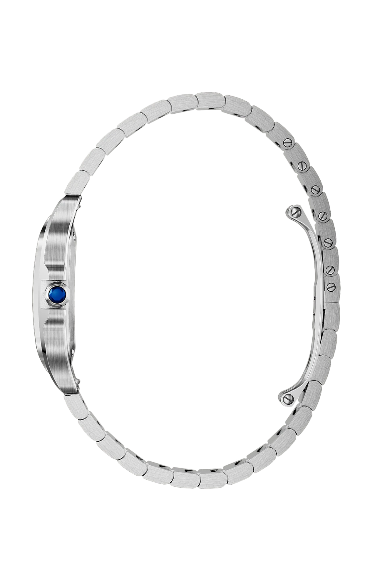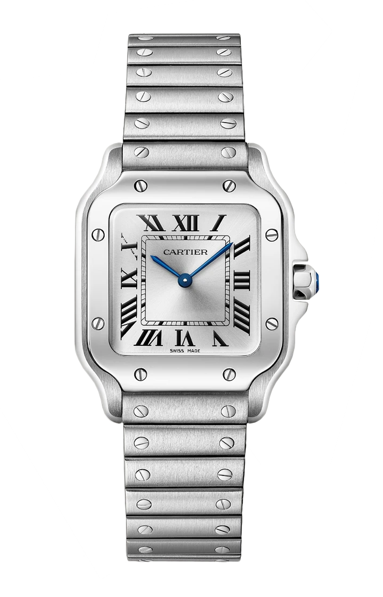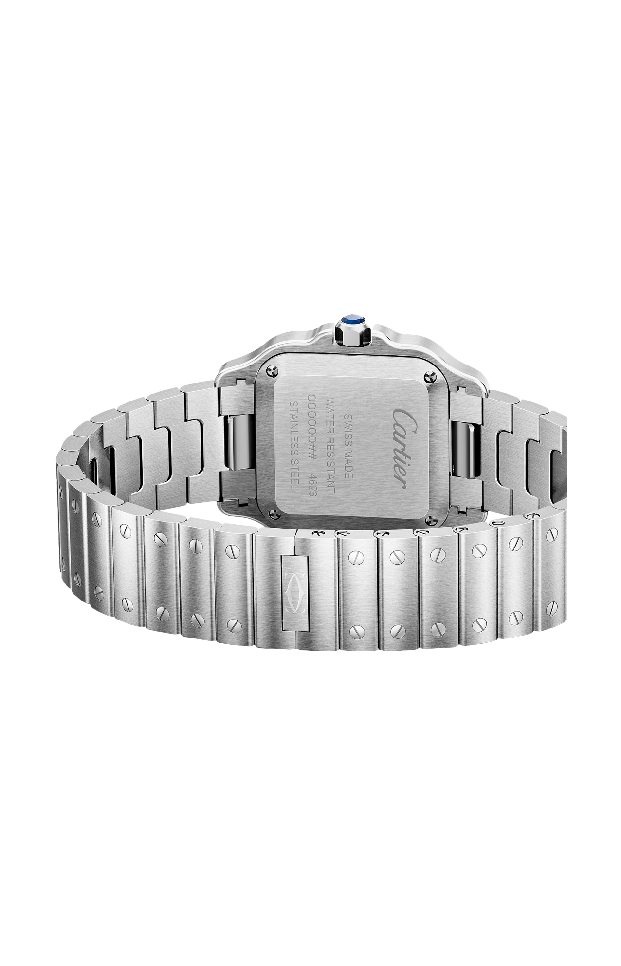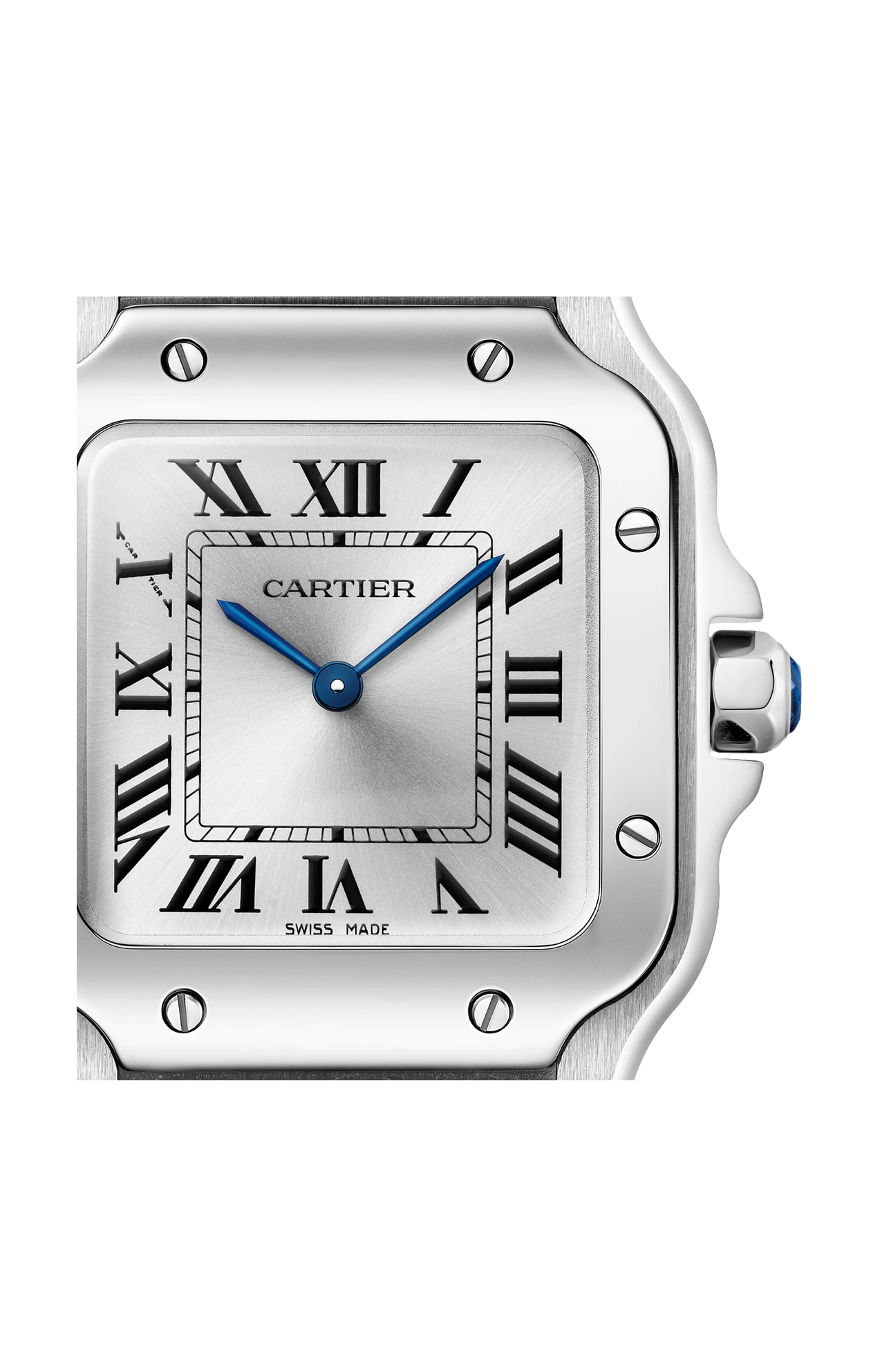 Orologio Santos de Cartier, modello piccolo, movimento al quarzo. Cassa e lunetta in acciaio, corona ettagonale ornata di uno zaffiro blu sfaccettato, lancette a forma di gladio d’acciaio azzurrato, vetro e fondocassa in vetro zaffiro. Bracciale in acciaio. Secondo cinturino in pelle di vitello, fibbia pieghevole a doppia regolazione in acciaio. Ore, minuti con ponti scheletrati a forma di numeri romani. Dimensioni 27 x 34,5 mm, spessore 7,08 mm. Impermeabile fino a 30 metri.