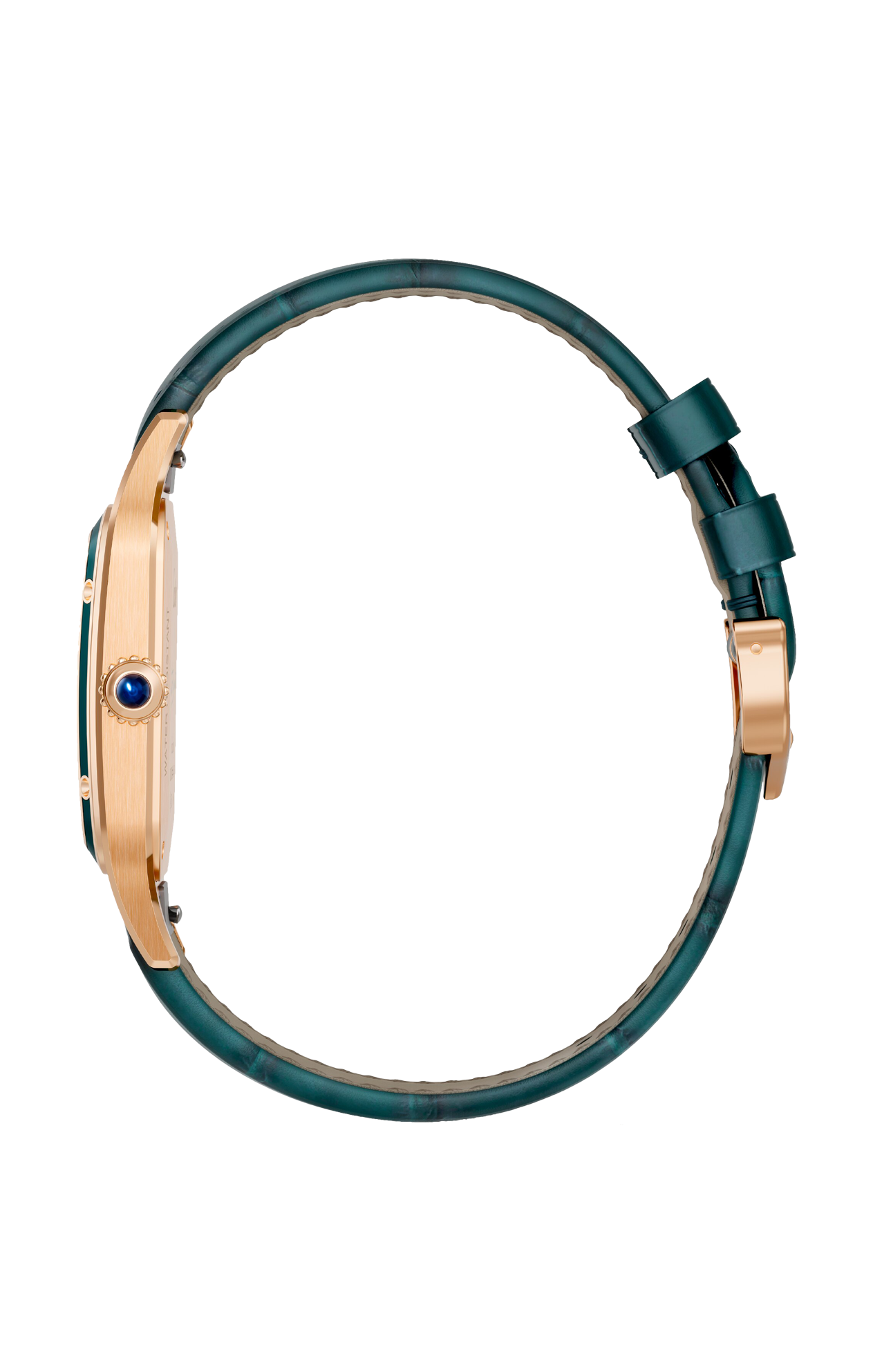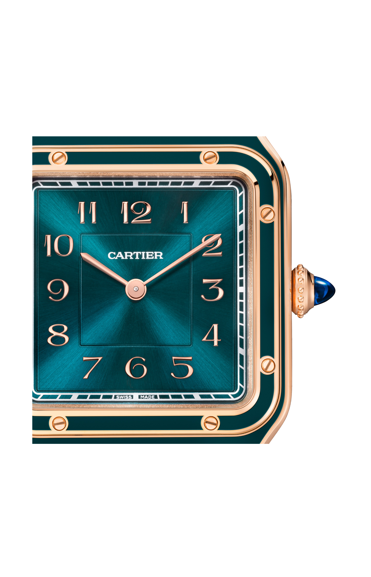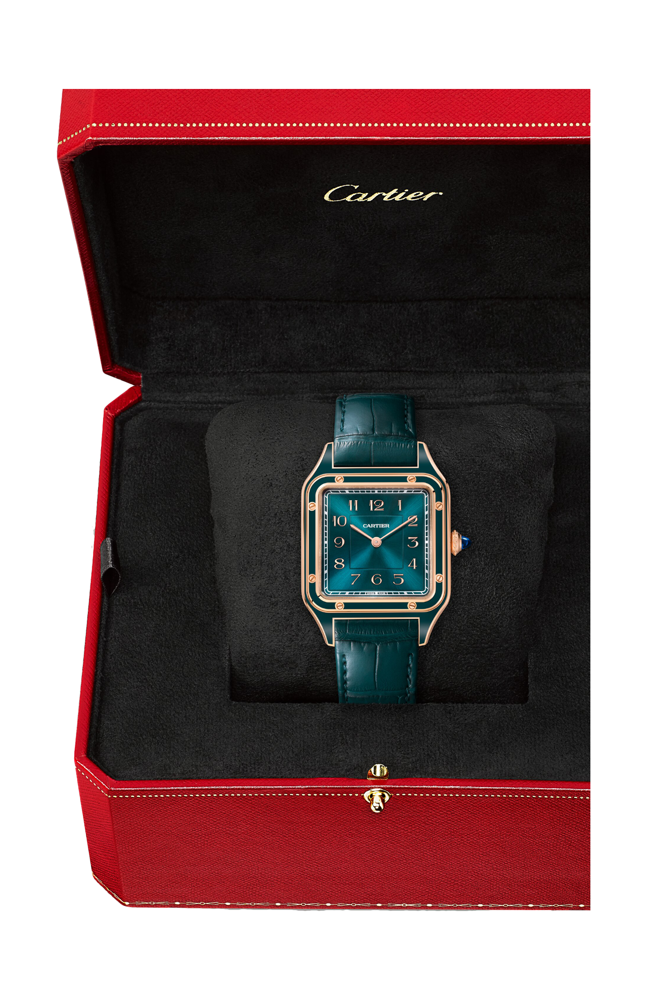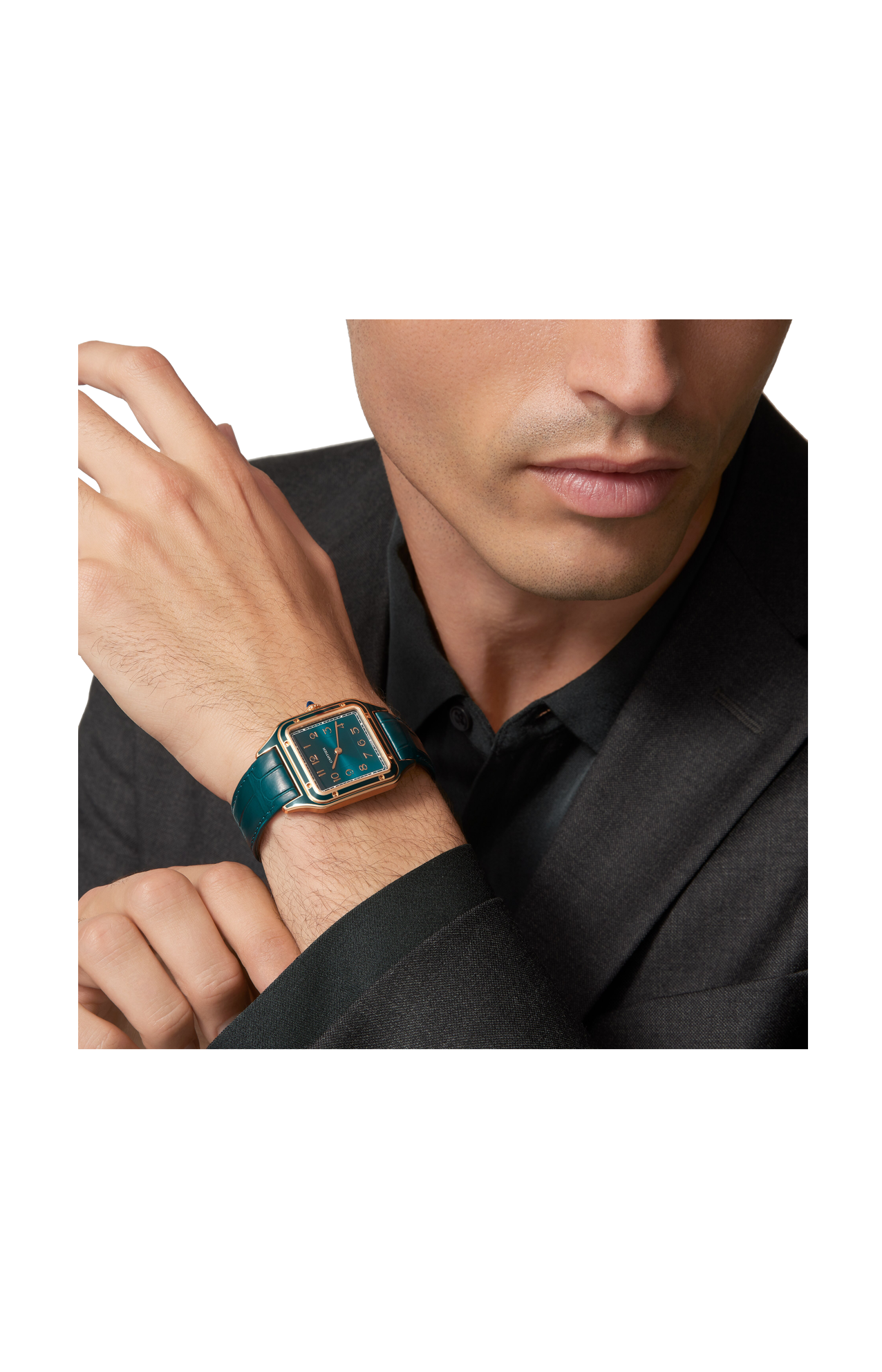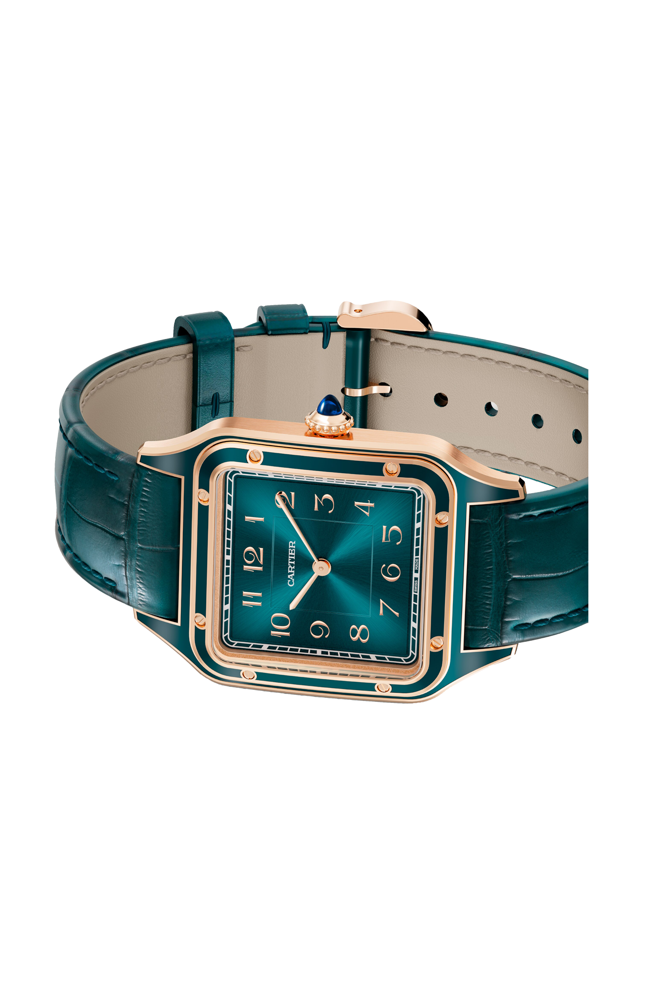 Orologio Santos-Dumont, modello grande, movimento meccanico a carica manuale 430 MC. Cassa in oro rosa 750/1000, corona circolare granulata ornata da uno zaffiro blu cabochon, quadrante blu pavone laccato a raggi di sole con cifre arabe, lancette a forma di gladio in acciaio placcato oro lucido, vetro zaffiro, fondello inciso con la firma autografa di Alberto Santos-Dumont. Cinturino d’alligatore blu, fibbia ardiglione in oro rosa 750/1000. Dimensioni della cassa 43,5 x 31,4 mm, spessore 7,3 mm. Impermeabile fino a 30 metri.