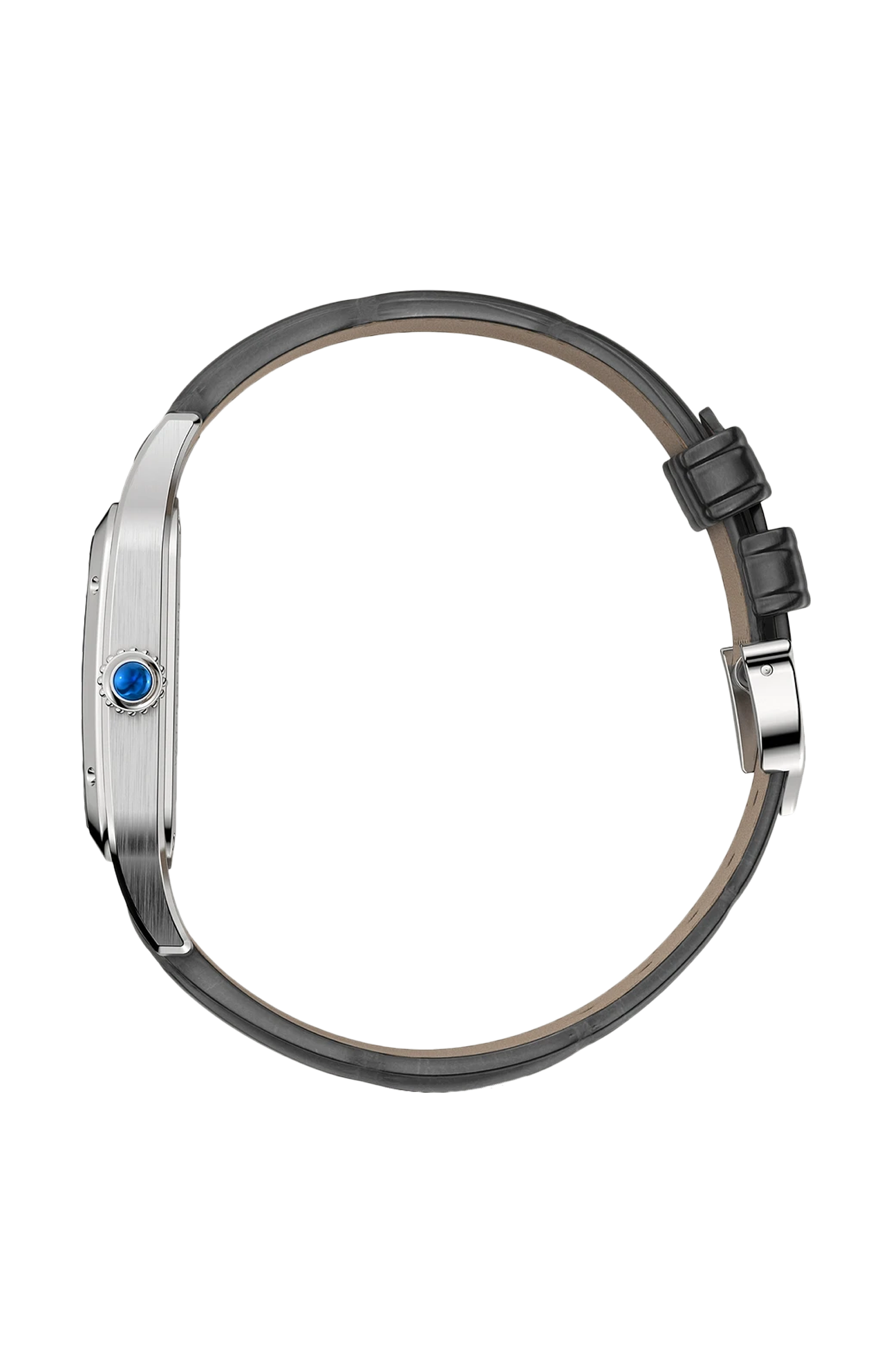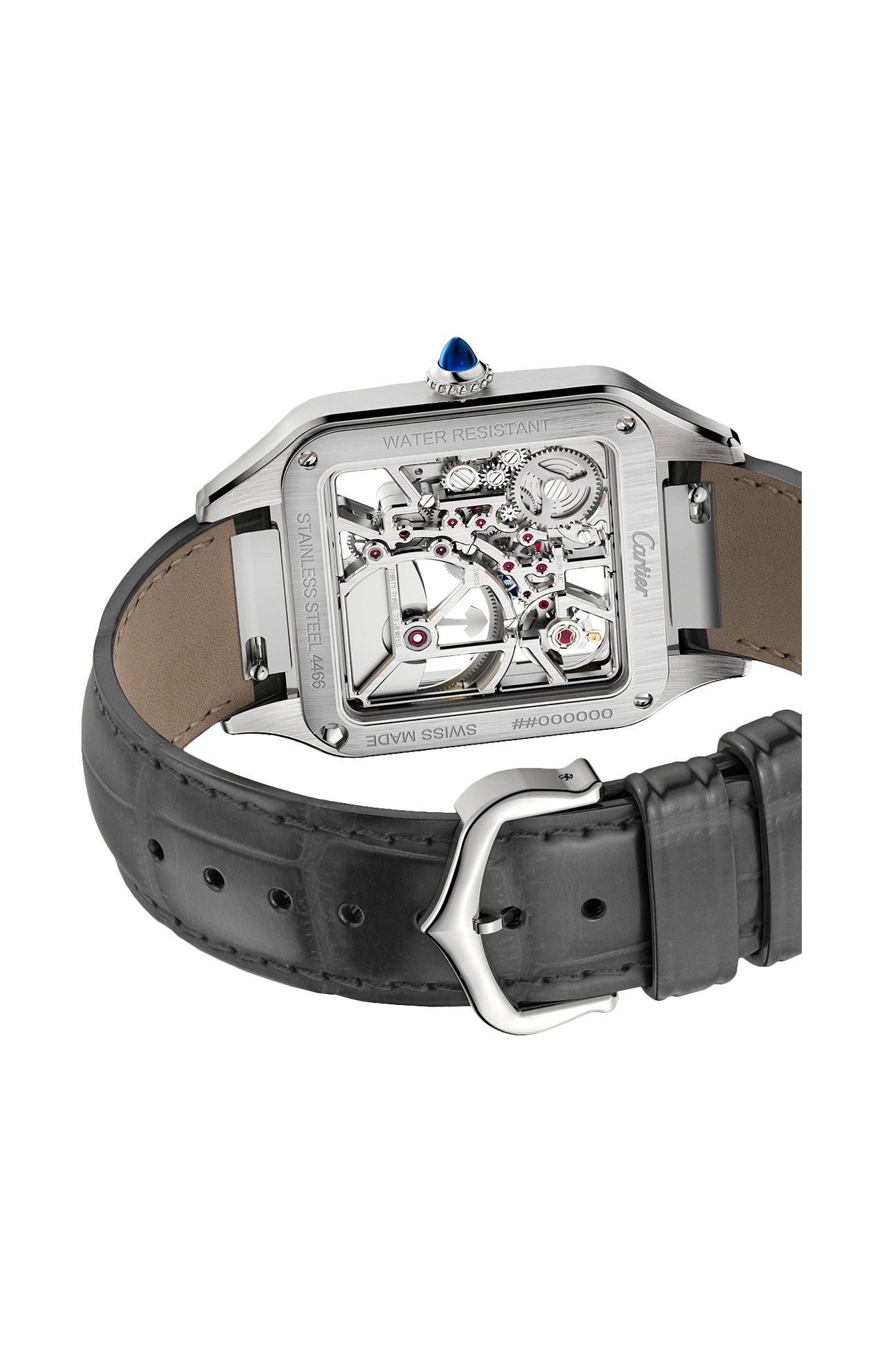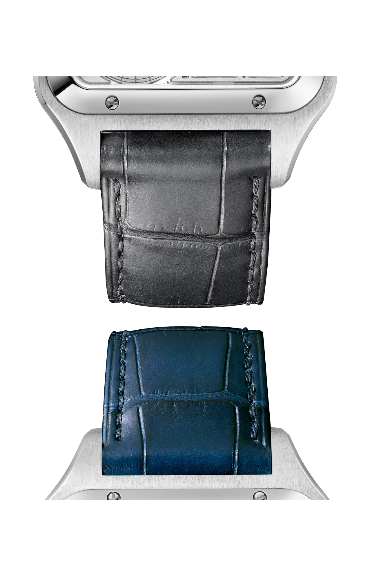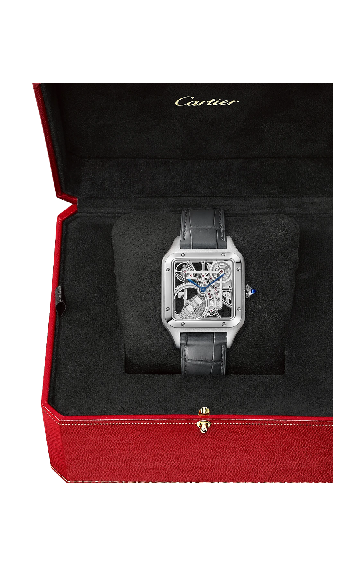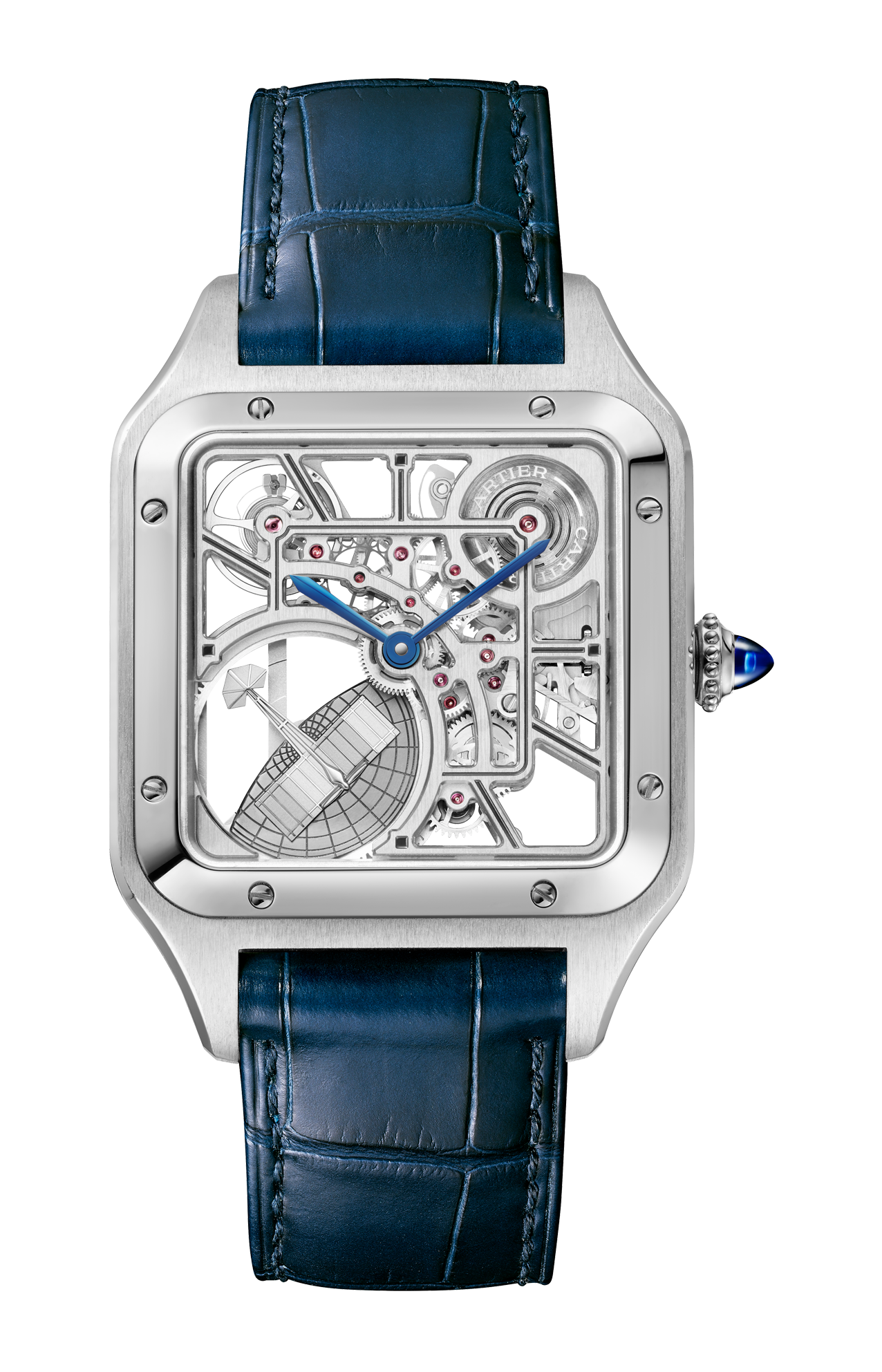 Orologio Santos-Dumont scheletrato micro-rotore, modello grande, 31 mm, movimento meccanico a carica automatica 9629 MC. Cassa in acciaio, lancette a forma di gladio d’acciaio azzurrato lucido, vetro e fondocassa in vetro zaffiro, ponti laccati grigi. Cinturino d’alligatore grigio e cinturino d’alligatore blu, fibbia ardiglione in acciaio. Dimensioni 23,2 mm, spessore 4,4 mm, bilanciere a 25.200 alternanze/ora, riserva di carica di circa 46 ore. Dimensioni della cassa 31 mm, spessore: 8 mm. Impermeabile fino a 30 metri.