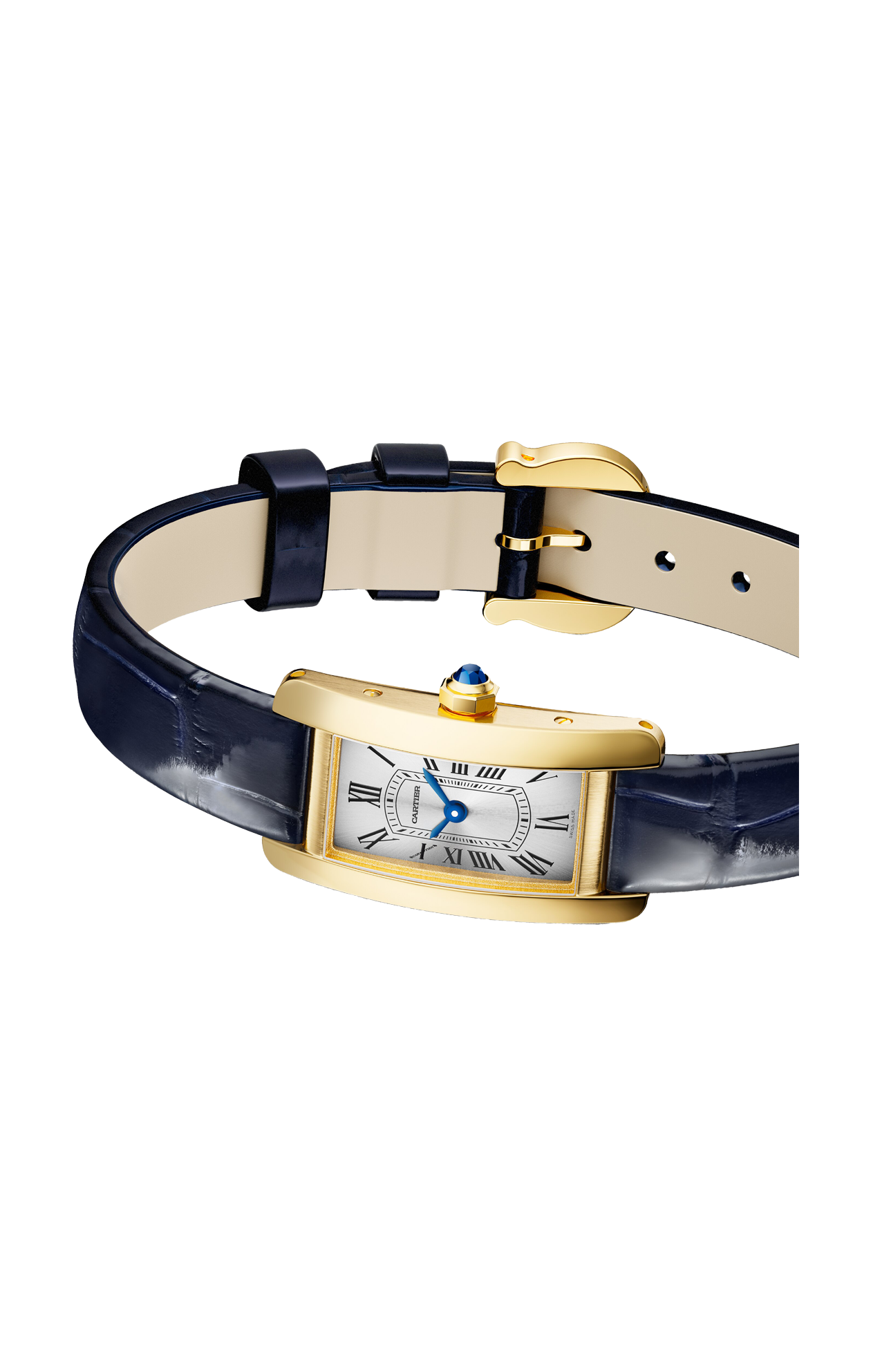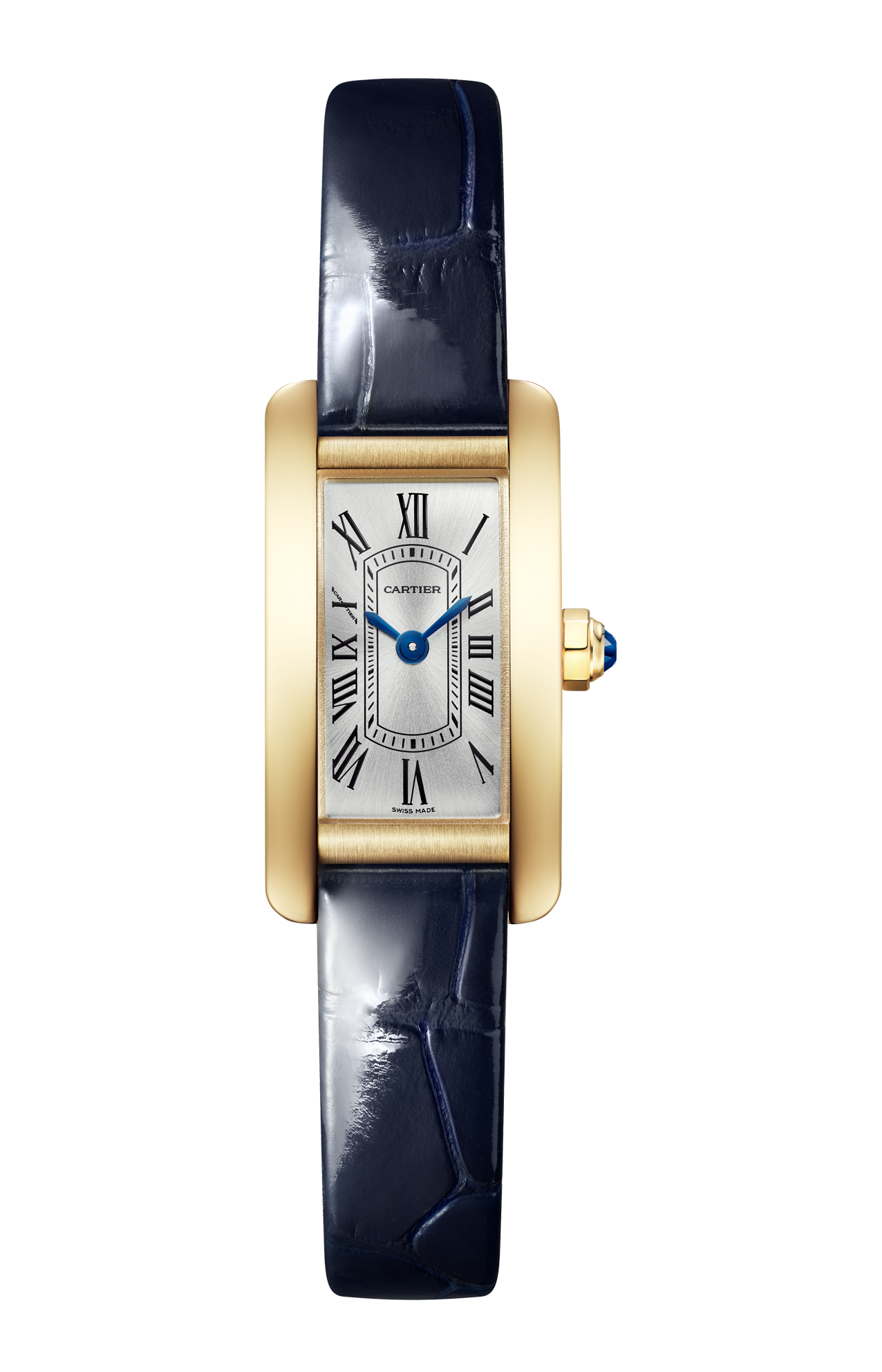 Orologio Tank Américain, modello mini, movimento a quarzo. Cassa in oro giallo 750/1000, corona poligonale ornata di uno zaffiro sfaccettato. Quadrante argentato satinato effetto soleil, lancette a forma di gladio in acciaio azzurrato, vetro zaffiro. Cinturino in alligatore blu navy lucido con fibbia ardiglione in oro giallo 750/1000. Dimensioni della cassa 28 mm x 15,2 mm, spessore 6,5 mm. Impermeabile fino a 30 metri.