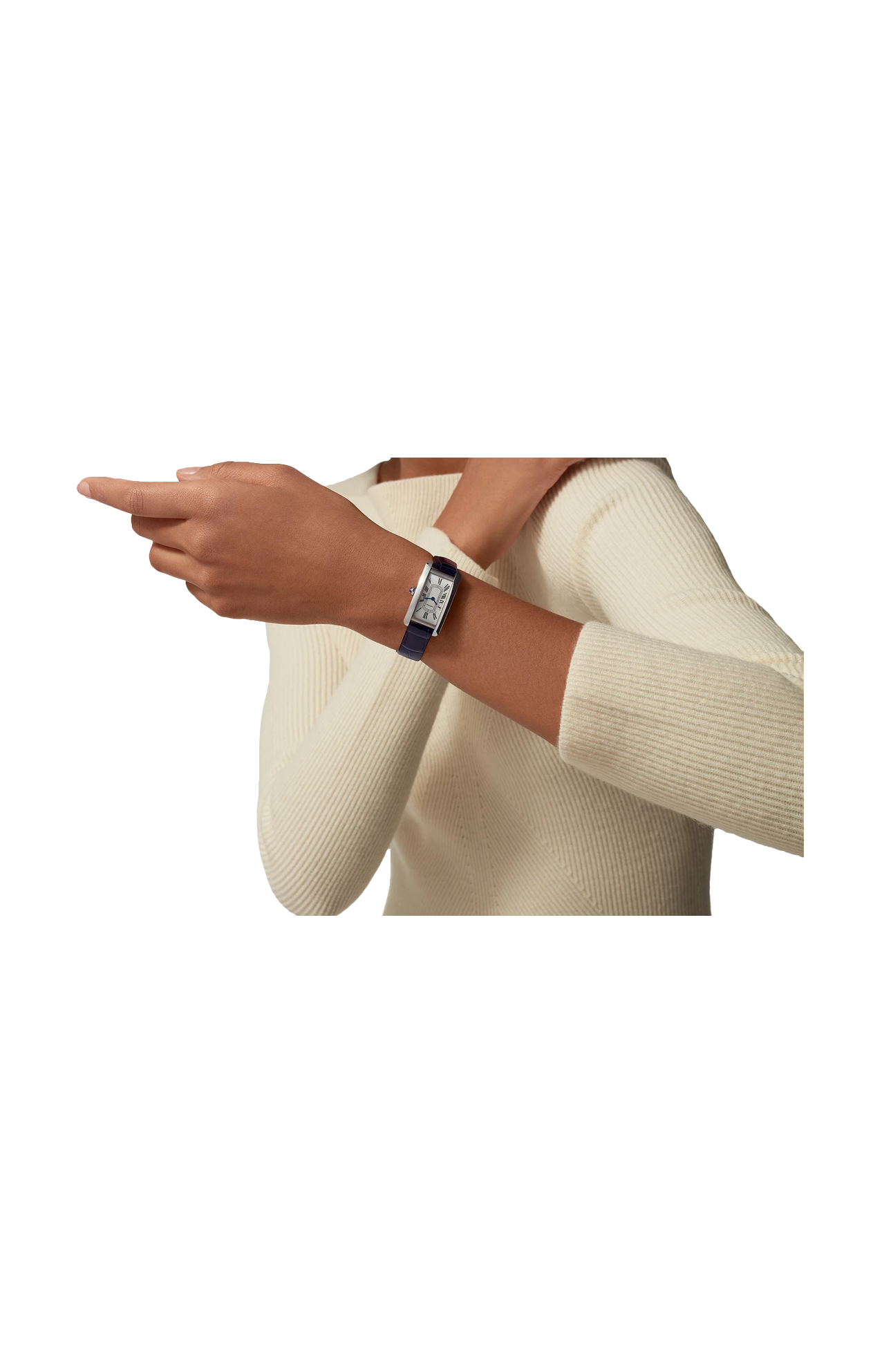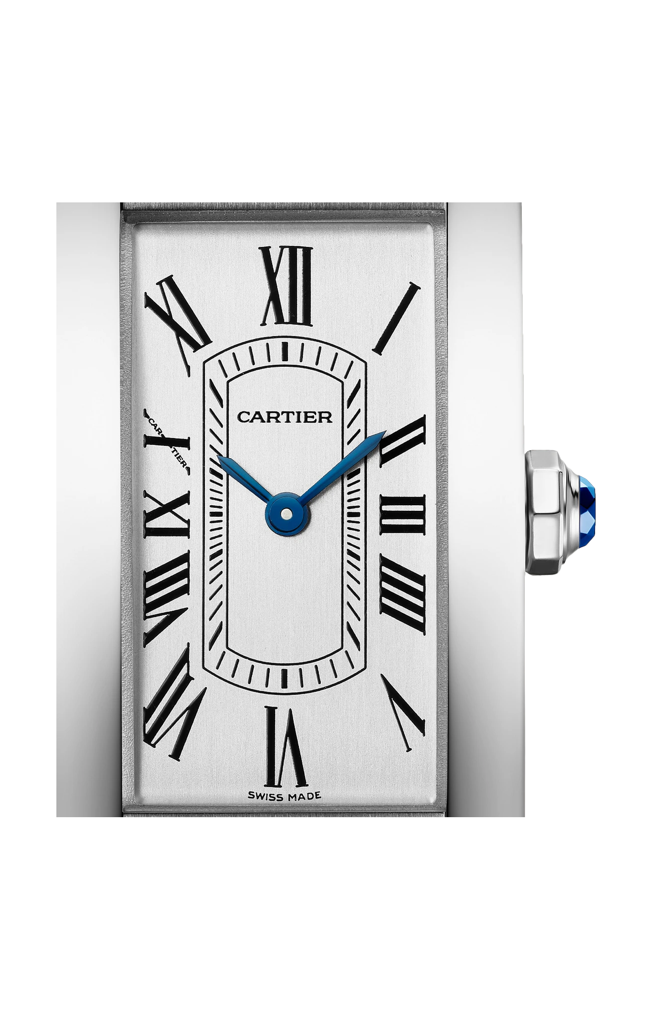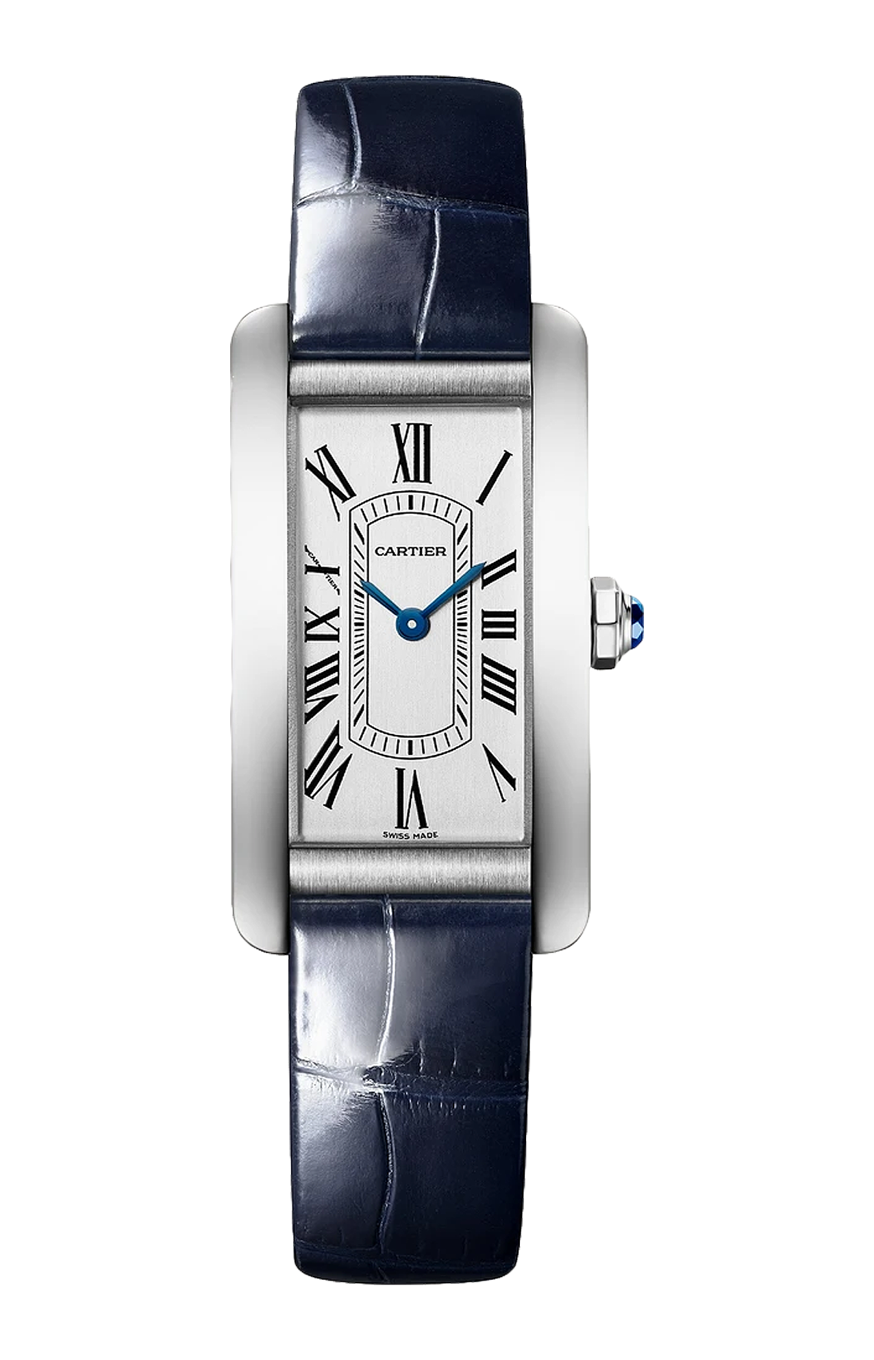 Orologio Tank Américaine, modello piccolo, movimento al quarzo. Cassa in acciaio. Corona poligonale ornata di uno spinello sintetico blu sfaccettato. Quadrante argentato satinato, lancette a forma di gladio d’acciaio azzurrato, vetro zaffiro. Cinturino d’alligatore lucido blu, fibbia ardiglione in acciaio. Dimensioni della cassa 35,4 x 19,4 mm, spessore 6,8 mm. Impermeabile fino a 30 metri.