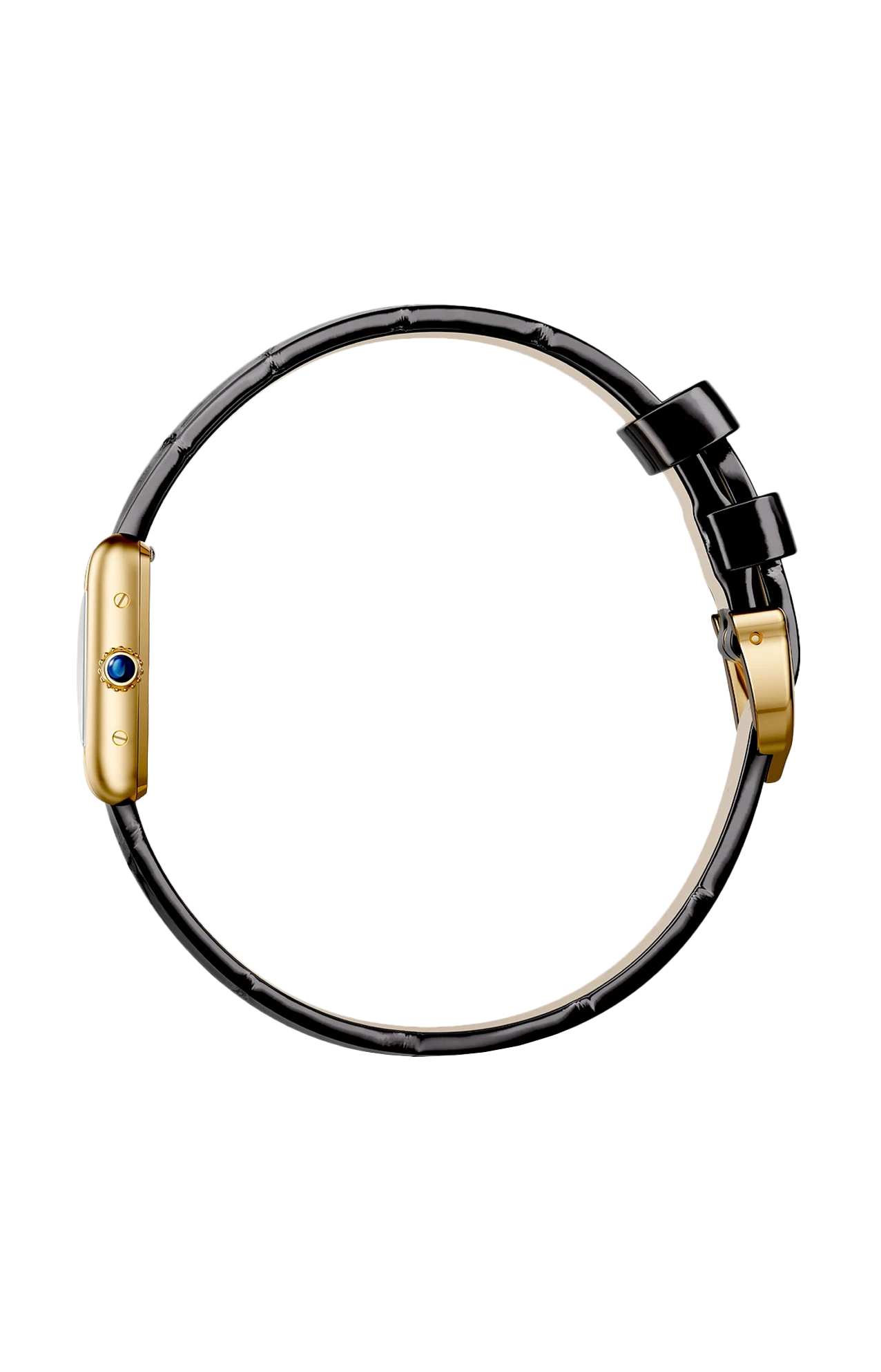 Orologio Tank Louis Cartier, modello mini, movimento al quarzo. Cassa in oro giallo 750/1000, corona perlata ornata di uno zaffiro, quadrante grené argentato, lancette a forma di gladio in acciaio azzurrrato, vetro minerale, cinturino in alligatore nero lucido, fibbia ardiglione in oro giallo 750/1000. Dimensioni della cassa 24 mm x 16,5 mm, spessore 6,2 mm. Impermeabile fino a 30 metri.