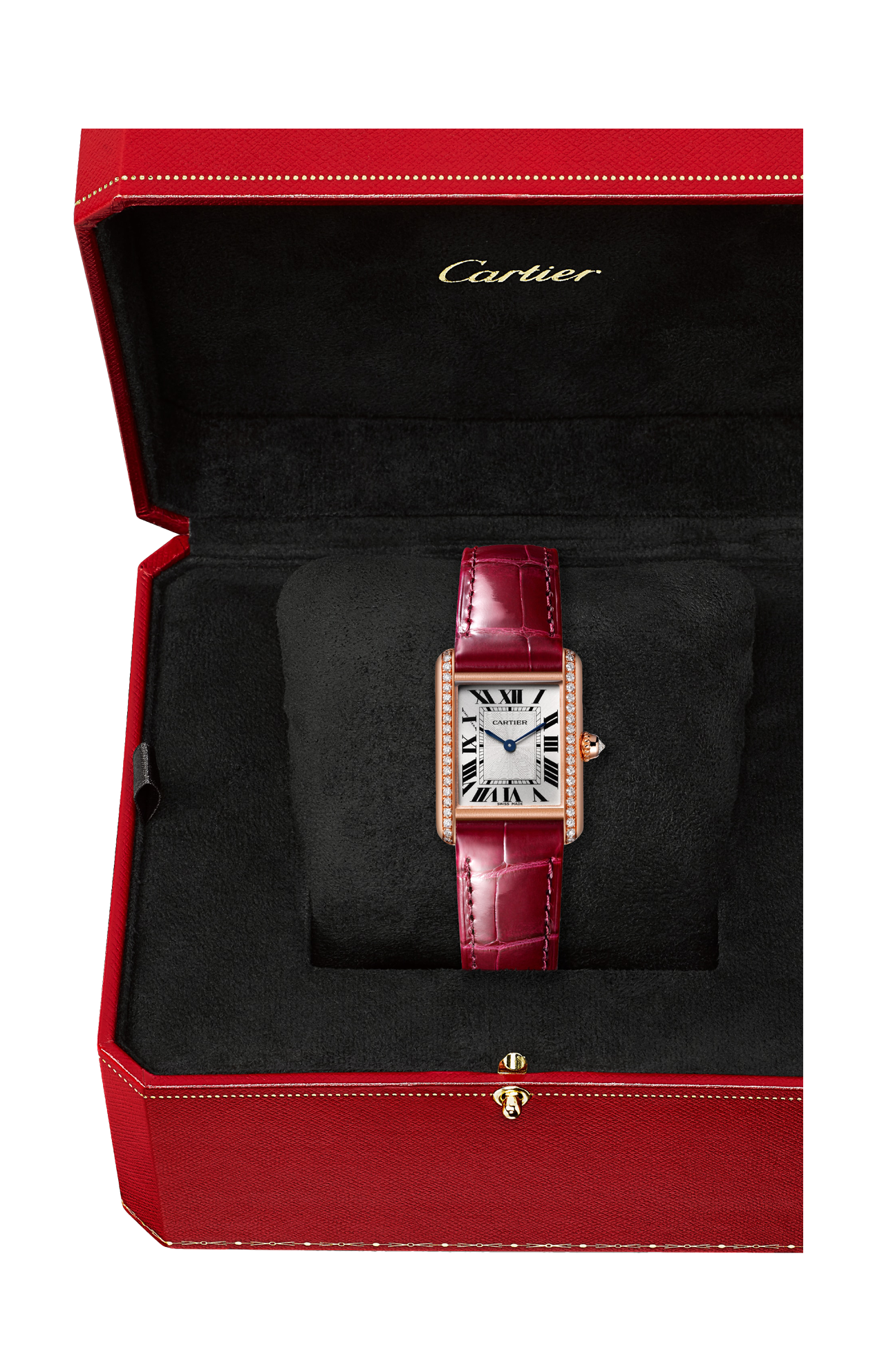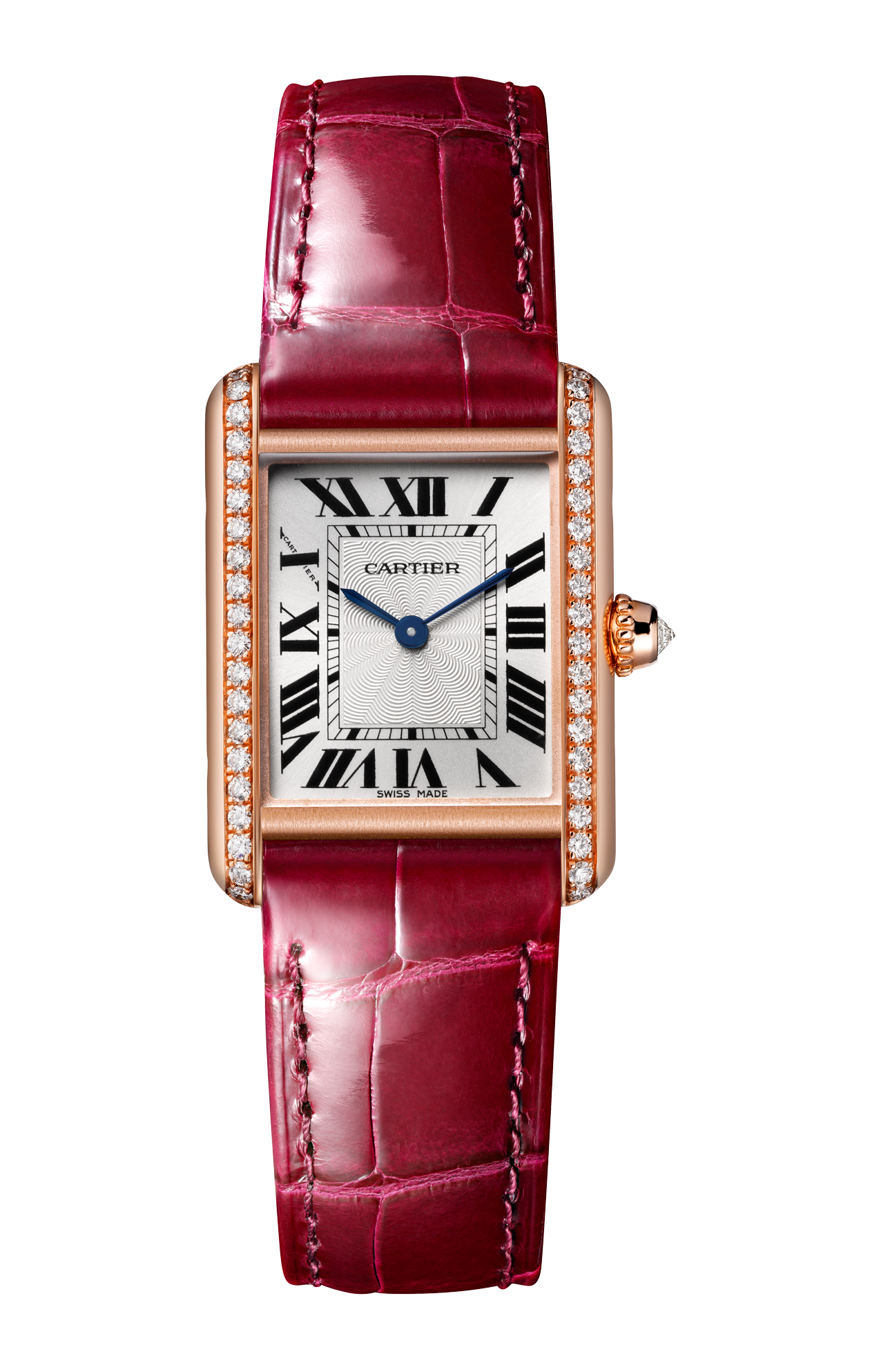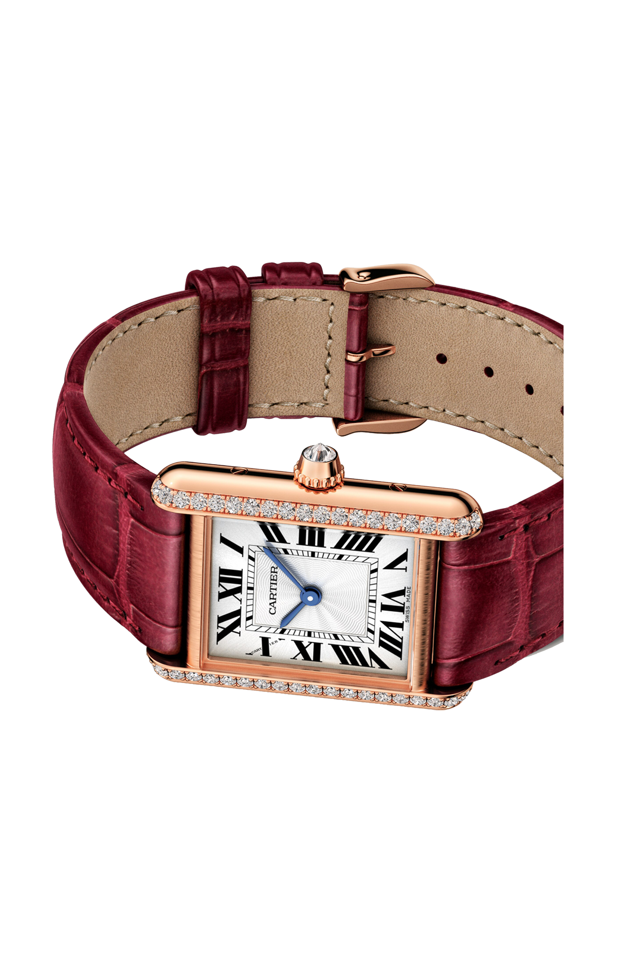 Orologio Tank Louis Cartier, modello piccolo, movimento meccanico di manifattura a carica manuale. Cassa e corona perlata in oro rosa 750/1000 ornate di 41 diamanti taglio brillante (0,47 carati). Quadrante perlato argentato, lancette a forma di gladio d’acciaio azzurrato, vetro minerale, cinturino in alligatore color vinaccia, fibbia ardiglione in oro rosa 750/1000. Dimensioni della cassa 29,5 x 22,0 mm, spessore 6,8 mm. Impermeabile fino a 30 metri.