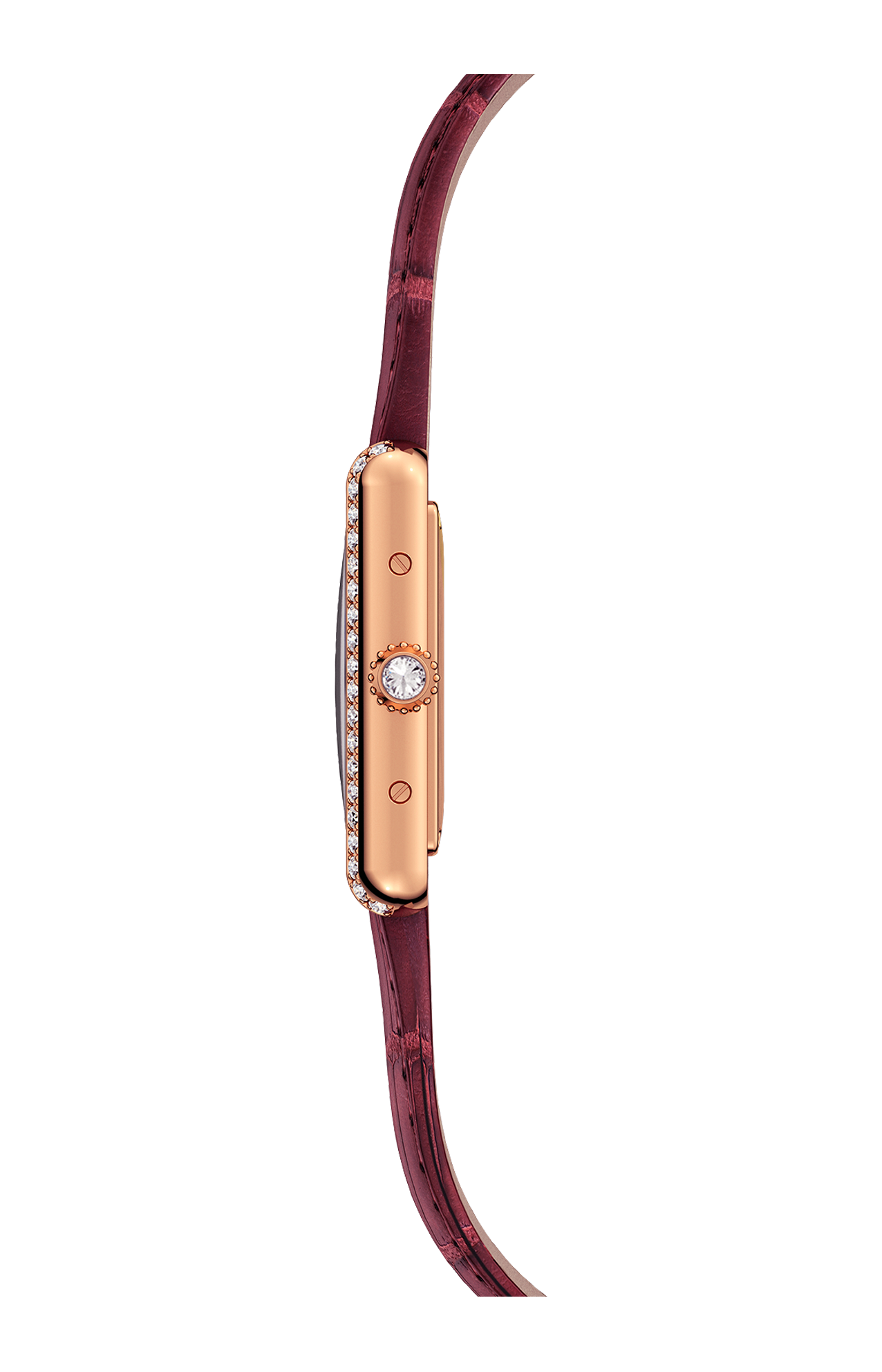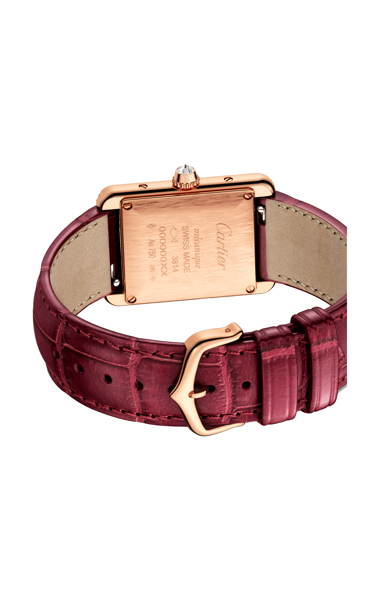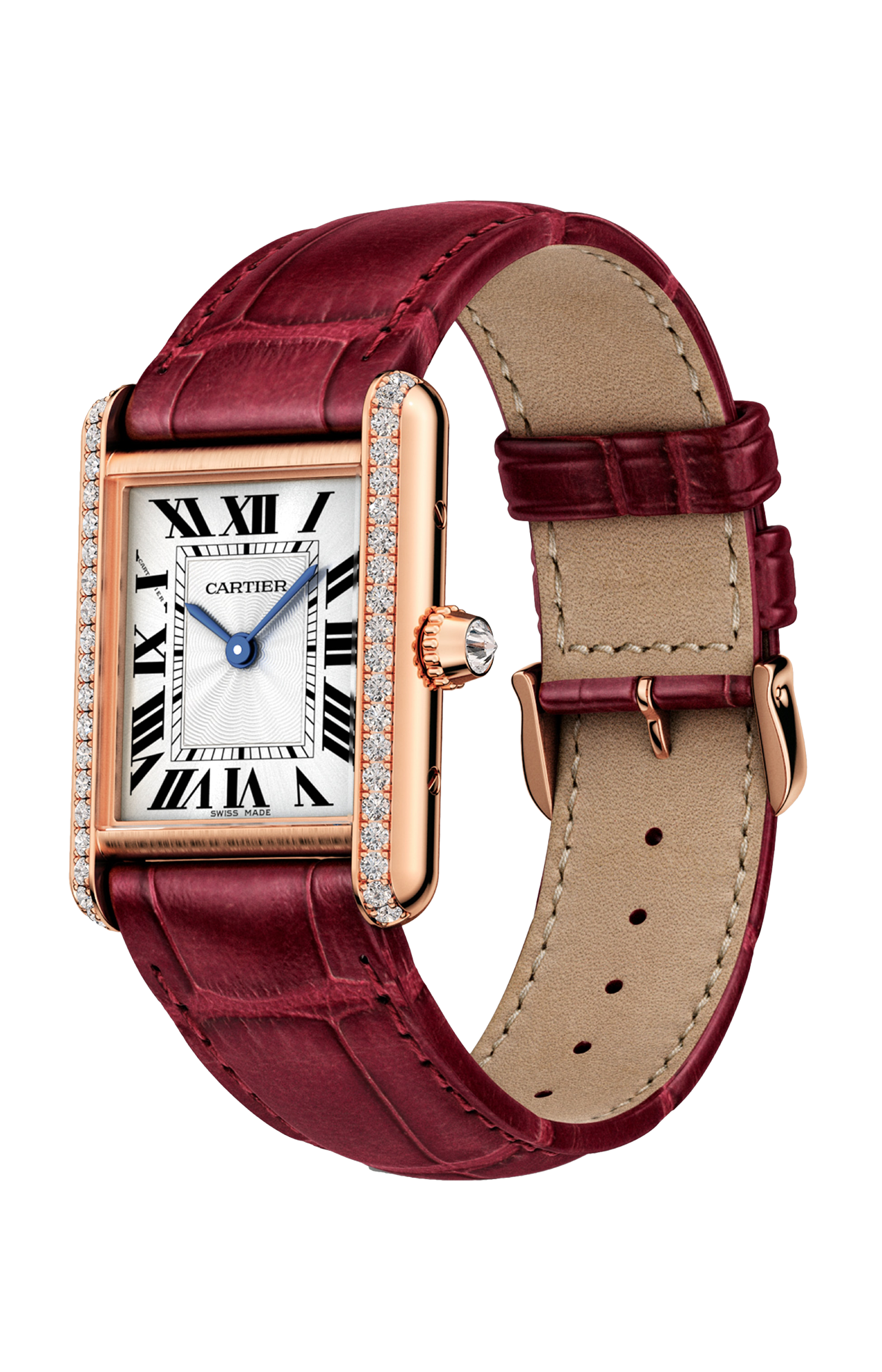 Orologio Tank Louis Cartier, modello piccolo, movimento meccanico di manifattura a carica manuale. Cassa e corona perlata in oro rosa 750/1000 ornate di 41 diamanti taglio brillante (0,47 carati). Quadrante perlato argentato, lancette a forma di gladio d’acciaio azzurrato, vetro minerale, cinturino in alligatore color vinaccia, fibbia ardiglione in oro rosa 750/1000. Dimensioni della cassa 29,5 x 22,0 mm, spessore 6,8 mm. Impermeabile fino a 30 metri.