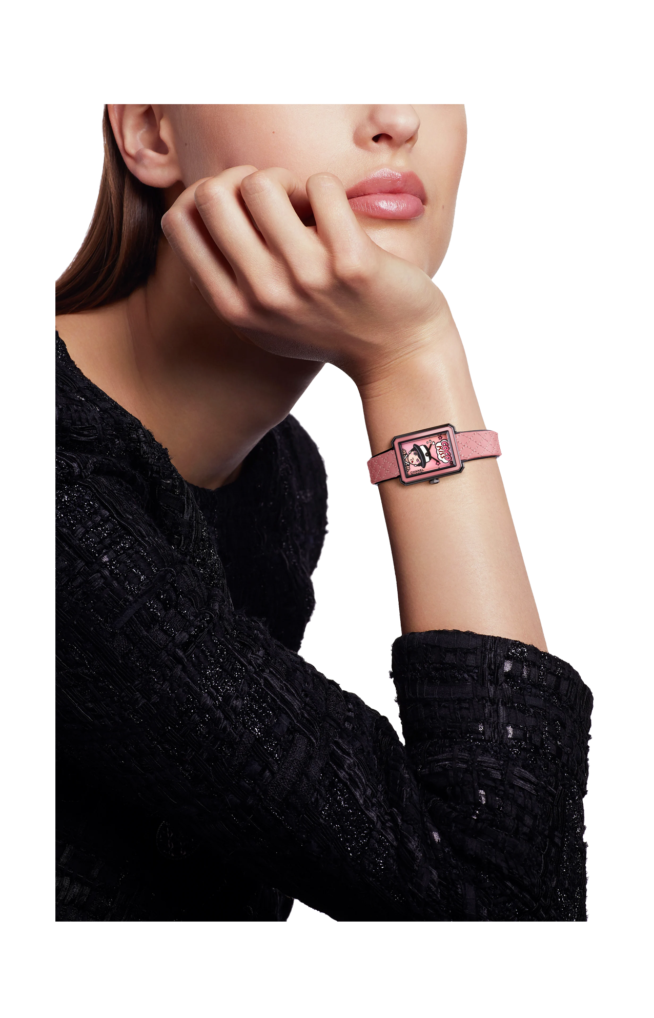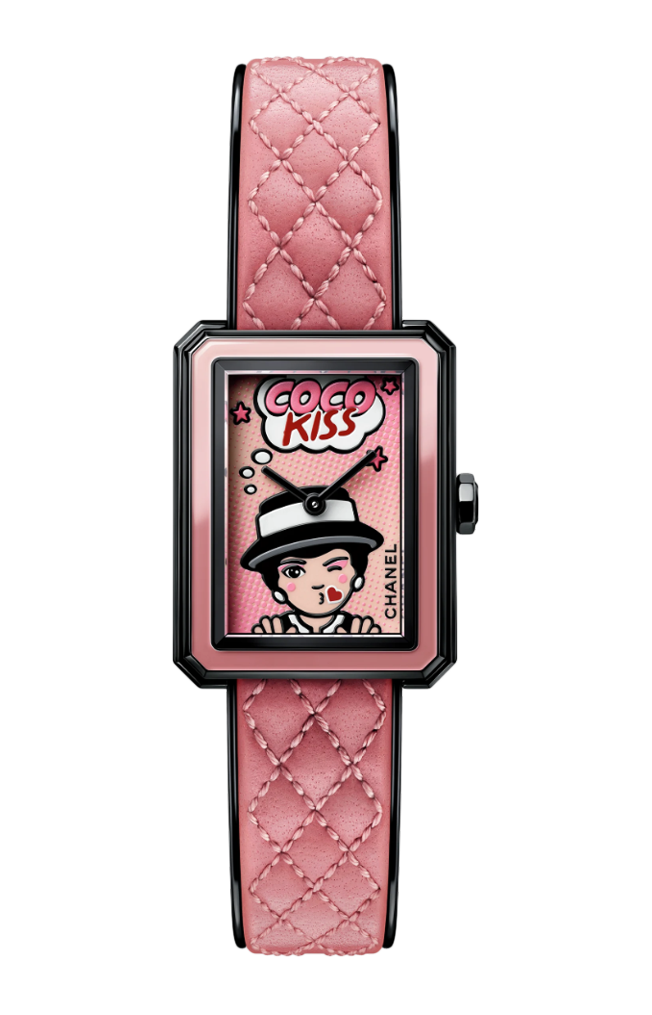 L’orologio Boyfriend Blush Ref. H10281 di Chanel è un’edizione limitata che fonde eleganza, audacia e il fascino dell’universo beauty della maison. Realizzato in acciaio con rivestimento nero, presenta una cassa piccola dalle dimensioni discrete che conferisce equilibrio e portabilità. La lunetta, anch’essa in acciaio con trattamento nero, è impreziosita da un inserto in lacca rosa, mentre la corona è decorata con un cabochon in spinello nero, dettaglio raffinato che accentua il carattere lussuoso del pezzo. Sul quadrante spicca l’immagine monocromatica rosa di Mademoiselle Chanel in decalcomania, abbinata a uno sticker, per un effetto visivo che unisce arte grafica e suggestione couture. Il cinturino intercambiabile in pelle motivo matelassé rosa, con bordo in pelle verniciata nera e interno in pelle nera, è chiuso da una fibbia ad ardiglione in acciaio nero e consente di personalizzare lo stile, mantenendo comfort e sicurezza. Il movimento è al quarzo ad alta precisione, con funzioni di ore e minuti, perfetto per chi cerca affidabilità senza rinunciare al lusso. Impermeabile fino a 30 metri, questo segnatempo è pensato per chi desidera indossare eleganza e personalità ogni giorno, con un’estetica che parla di colore, texture e dettagli distintivi.