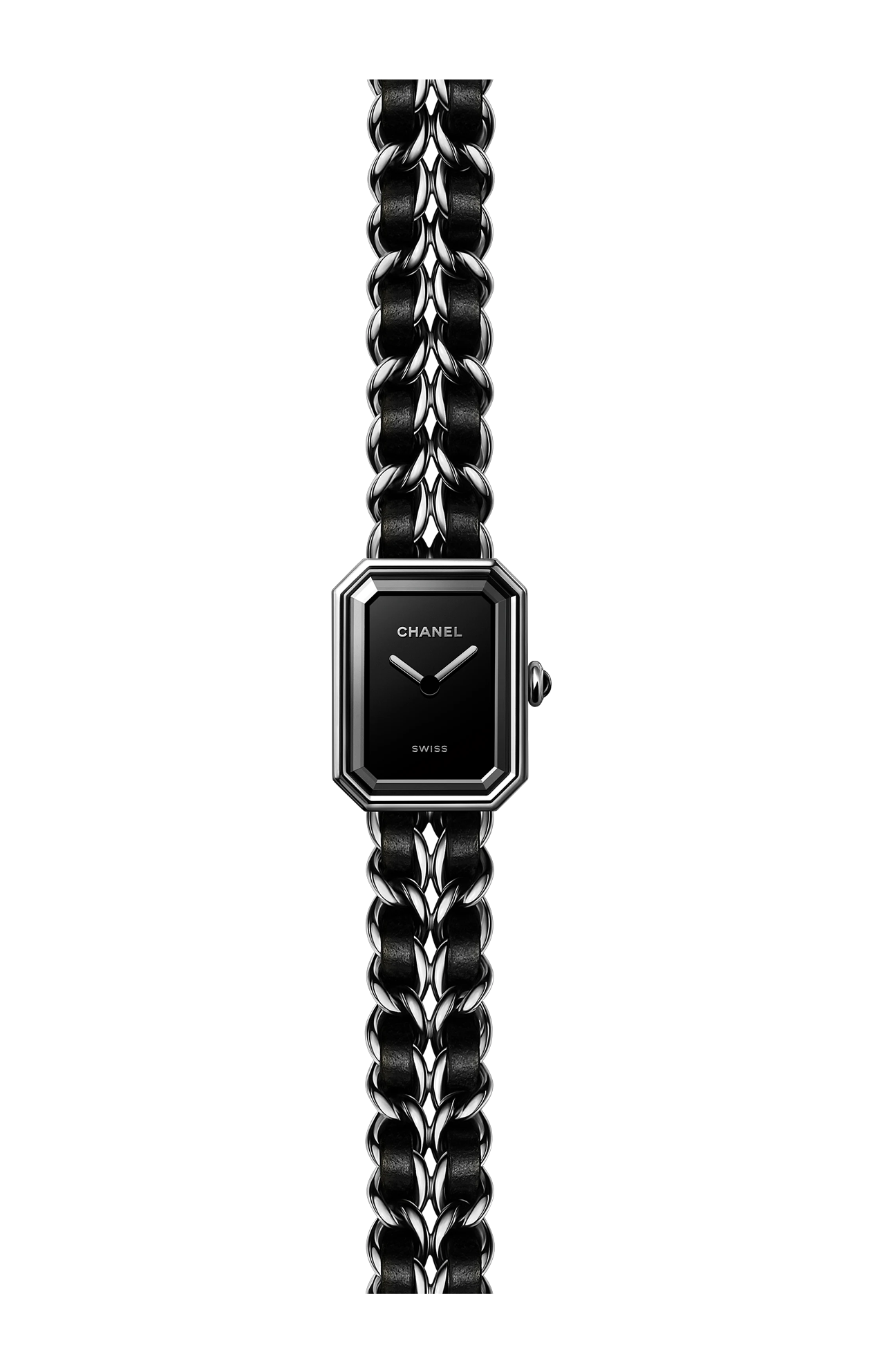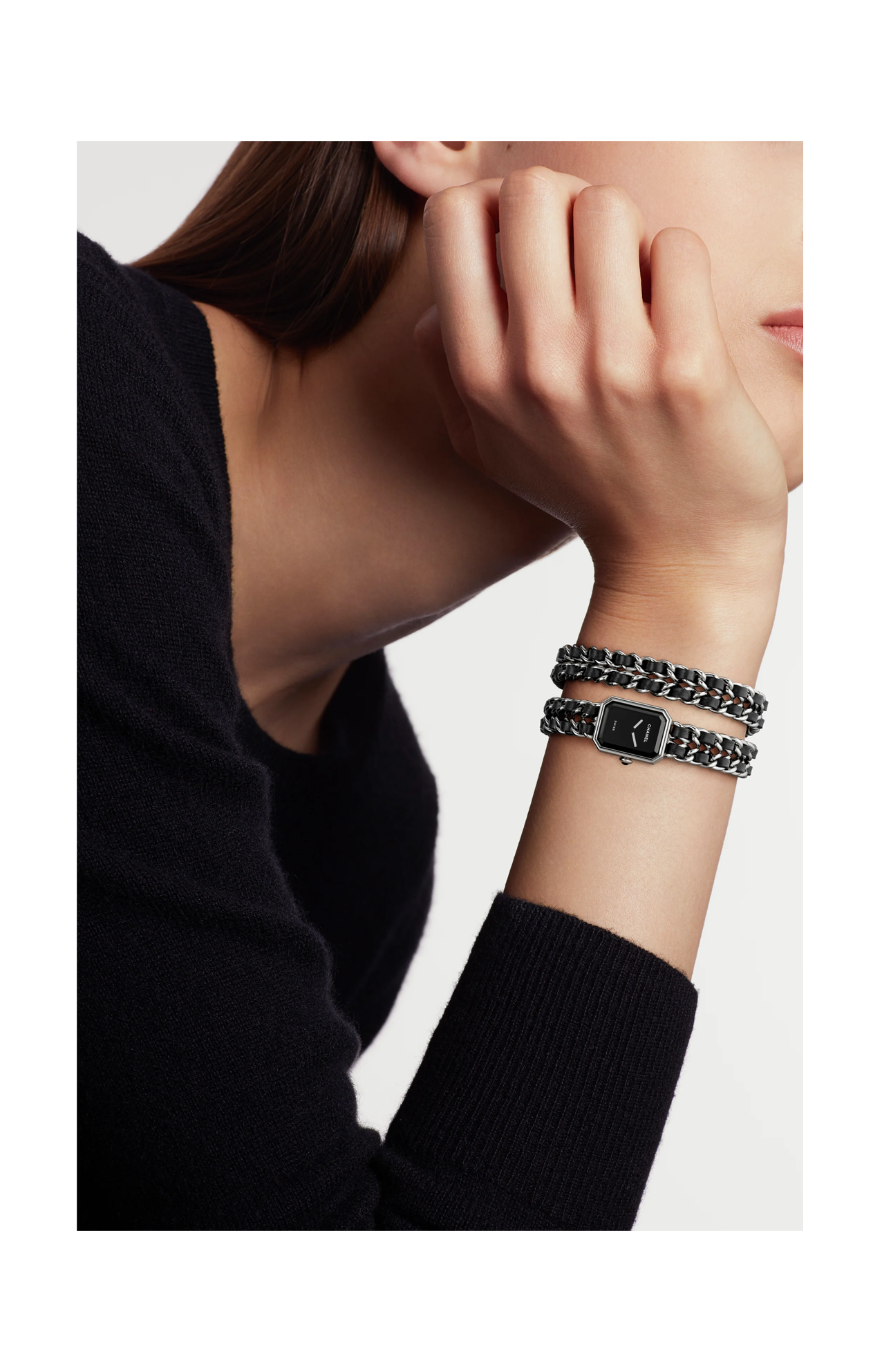L’orologio CHANEL PREMIÈRE Catena Iconica Doppio Giro Ref. H10446 è un segnatempo elegante e femminile che unisce l’estetica couture di CHANEL a un design gioiello distintivo. La cassa ottagonale, simbolo dell’iconica collezione PREMIÈRE ispirata alle forme geometriche della Place Vendôme e alla silhouette del flacone del profumo N°5, è realizzata in acciaio lucido di alta qualità e incorniciata da superfici raffinate che ne esaltano la lucentezza. Il quadrante nero laccato dona profondità visiva e un contrasto sofisticato con gli indici e le lancette rodiate, assicurando una lettura chiara e armoniosa delle ore e dei minuti. Il vero protagonista è il cinturino a doppio giro con catena iconica CHANEL, caratterizzato dal motivo gourmette intrecciato in acciaio e pelle, che unisce comfort e forte impatto estetico, trasformando il segnatempo in un accessorio prezioso oltre che funzionale. Il movimento al quarzo ad alta precisione garantisce affidabilità quotidiana con minima manutenzione, perfetto per chi desidera una combinazione di stile e praticità. Questo orologio è pensato per accompagnarti con eleganza in ogni momento della giornata, dalle occasioni formali a quelle più casual chic, incarnando l’eleganza senza tempo e l’innovazione stilistica della Maison CHANEL.