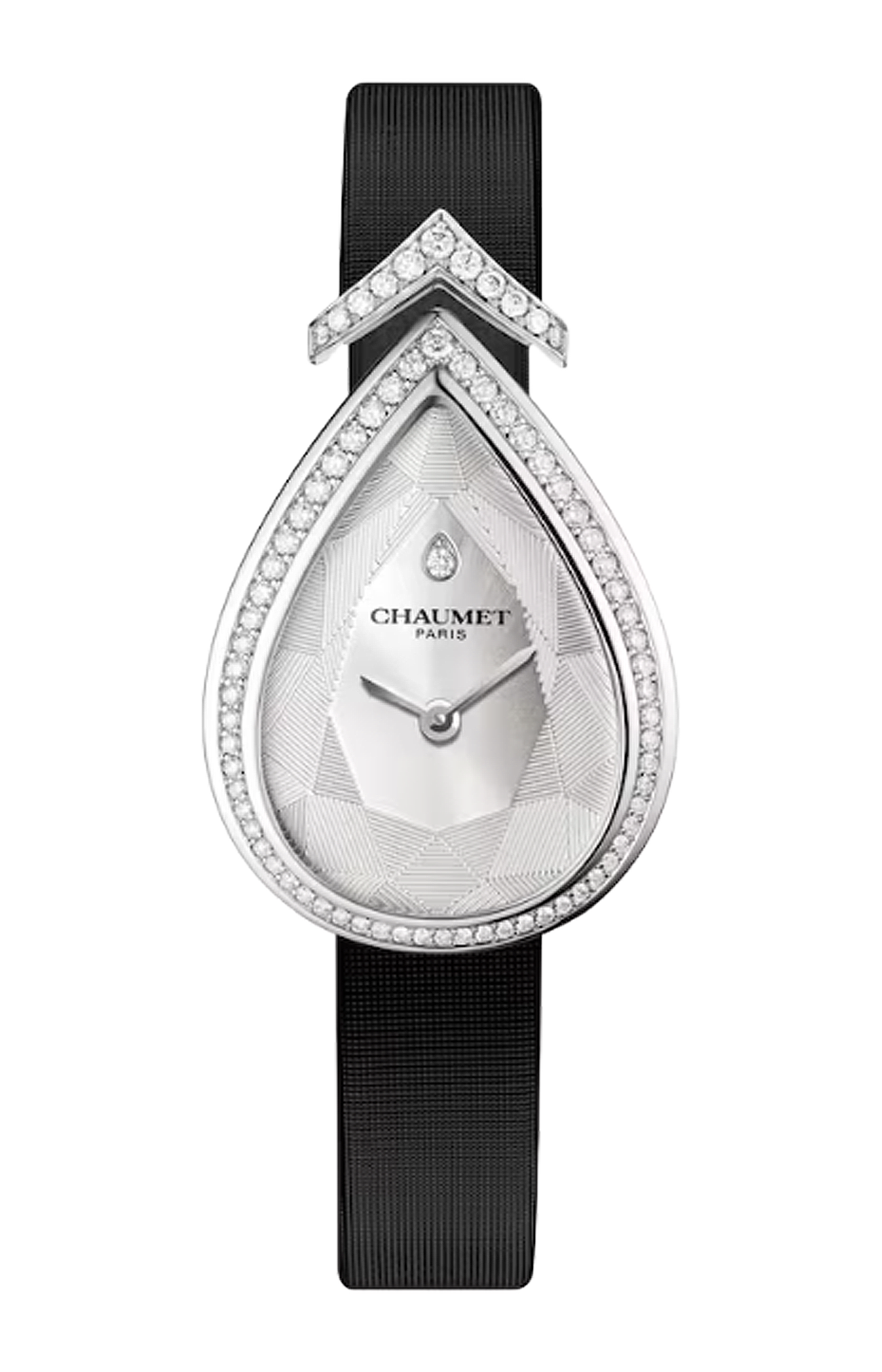 QUESTO OROLOGIO DA DONNA IN ORO BIANCO, TEMPESTATO DI DIAMANTI E CON QUADRANTE INCISO, REINTERPRETA IL TAGLIO A PERA CARO ALL'IMPERATRICE GIUSEPPINA. DALLA FORMA A V DELL'AIGRETTE AGLI INDICI TROMPE L'OEIL CON DIAMANTI INCASTONATI, QUESTO PEZZO INCARNA I CODICI EMBLEMATICI DELLA COLLEZIONE JOSÉPHINE.