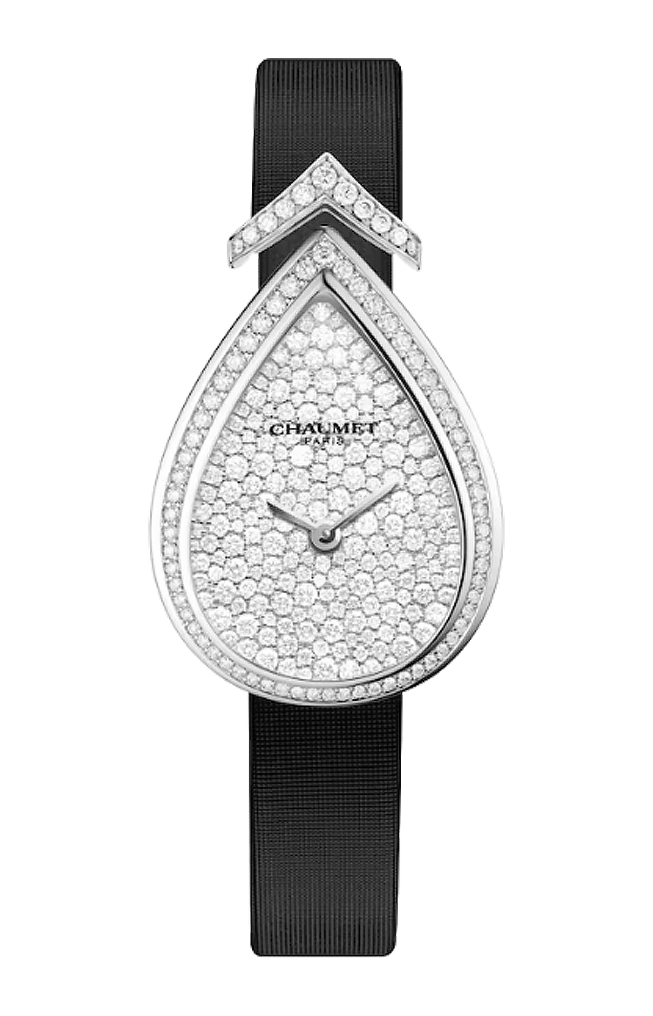 Questo orologio femminile in oro bianco interamente tempestato di diamanti reinterpreta l'amato taglio a pera dell'Imperatrice Joséphine. Dall'aigrette a V alla cassa a forma di pera, questo orologio gioiello incarna i codici emblematici della collezione Joséphine.
