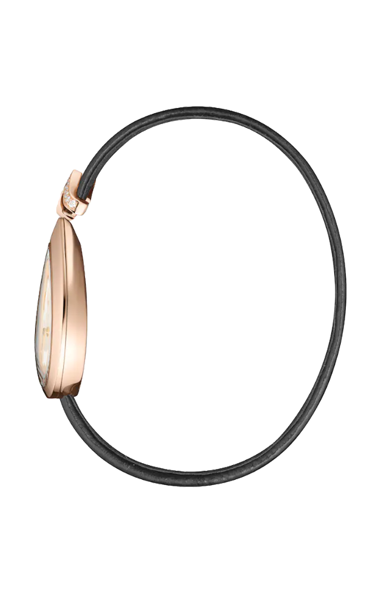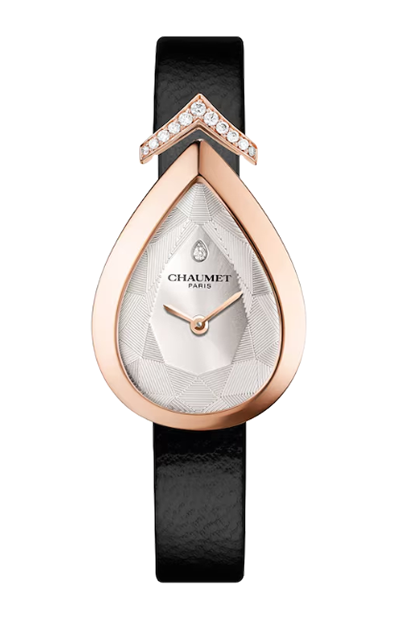 Questo orologio femminile in oro rosa con quadrante inciso reinterpreta l'amato taglio a pera dell'Imperatrice Joséphine. Dall'aigrette a V agli indici trompe-l'oeil in diamanti che impreziosiscono il quadrante, questo orologio gioiello incarna i codici emblematici della collezione Joséphine.