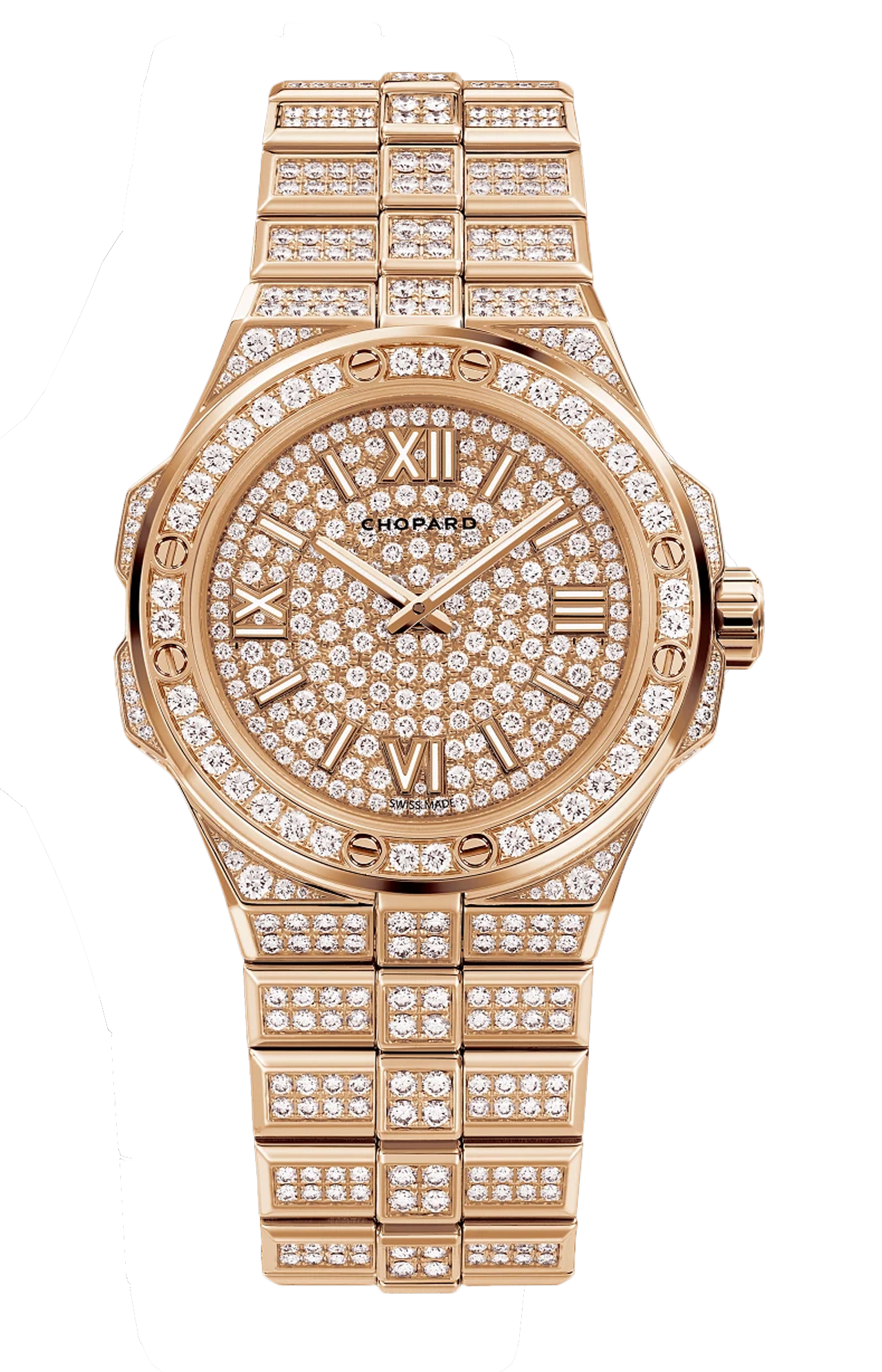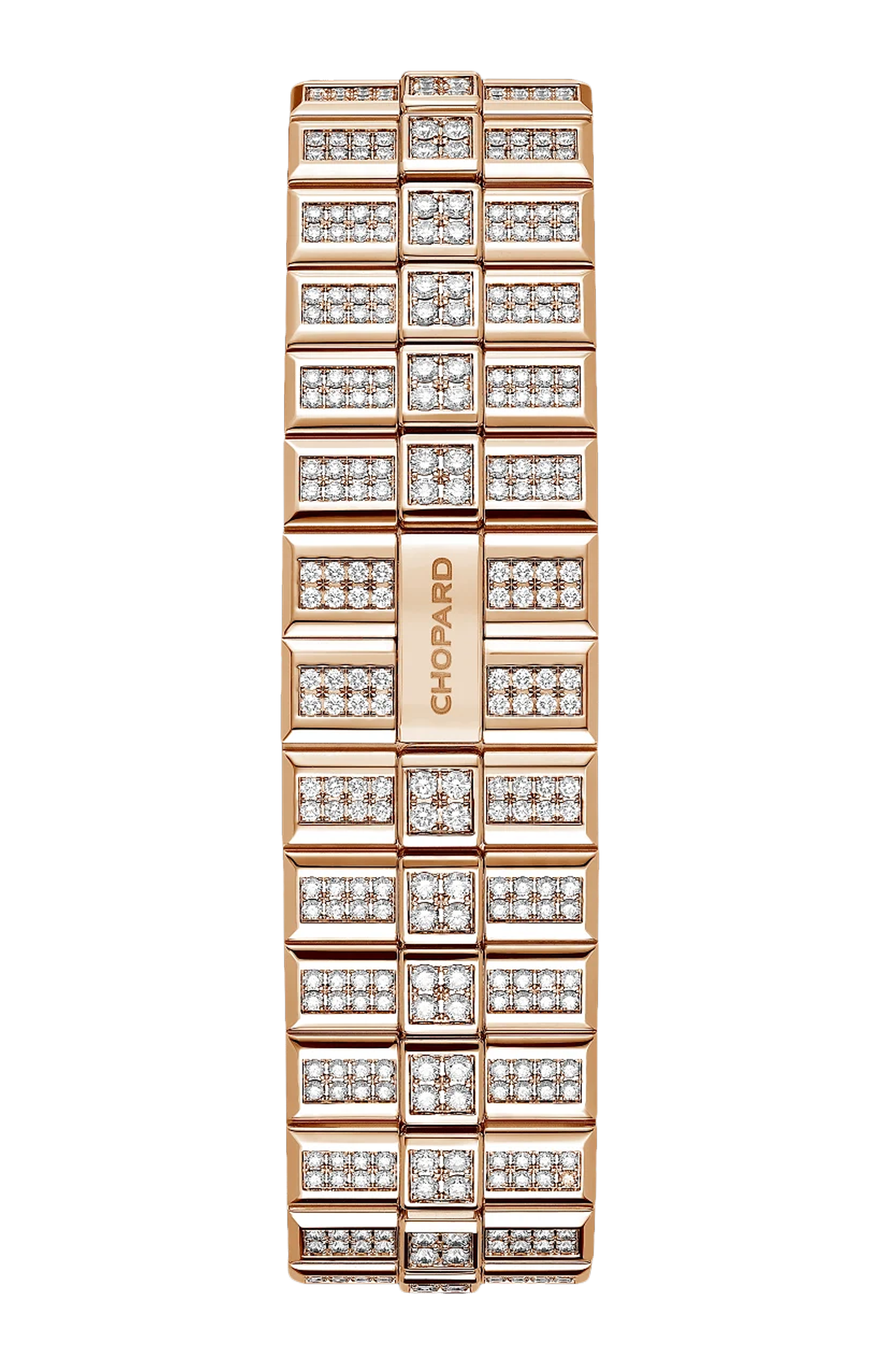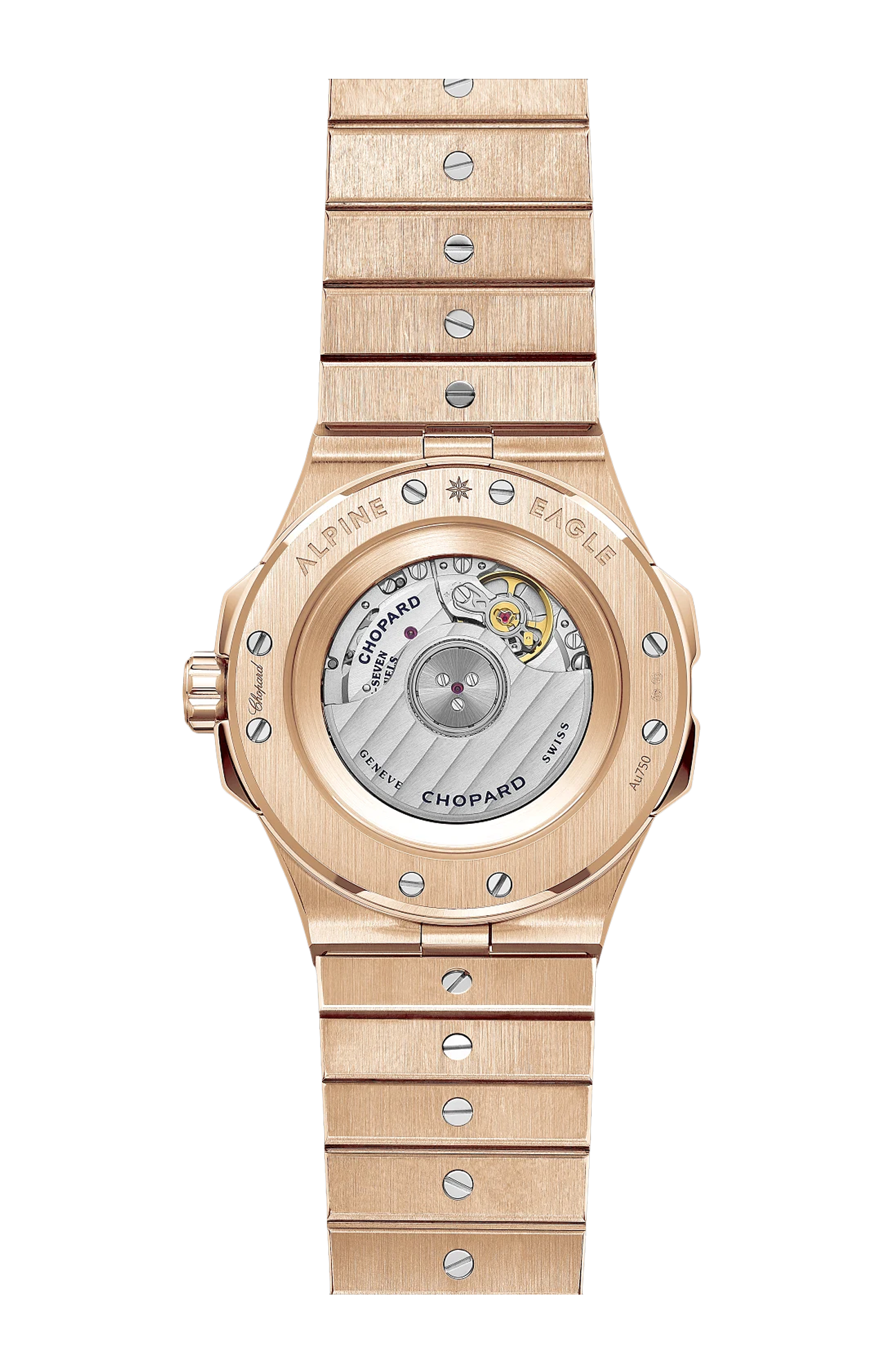 Gli orologi sporty-chic di Chopard, ispirati alla grazia dell’aquila e alla maestria delle Alpi, accolgono il segnatempo di diamanti Alpine Eagle Frozen. Questo orologio di lusso in oro etico rosa 18 carati esibisce una cassa di 36 mm di diametro e un bracciale integrato interamente ricoperti di un pavé di diamanti. Questa versione gioiello dell’orologio dedicato alle “aquile contemporanee”, la cui perizia tecnica è pari solo alla raffinatezza estetica, ospita il movimento Chopard 09.01-C a carica automatica con 42 ore di riserva di carica. Grazie alla ricchezza dei suoi diamanti che ricordano i delicati cristalli di neve sulle cime delle Alpi, questo orologio in oro rosa e diamanti scintilla di un’aura etica e responsabile.
