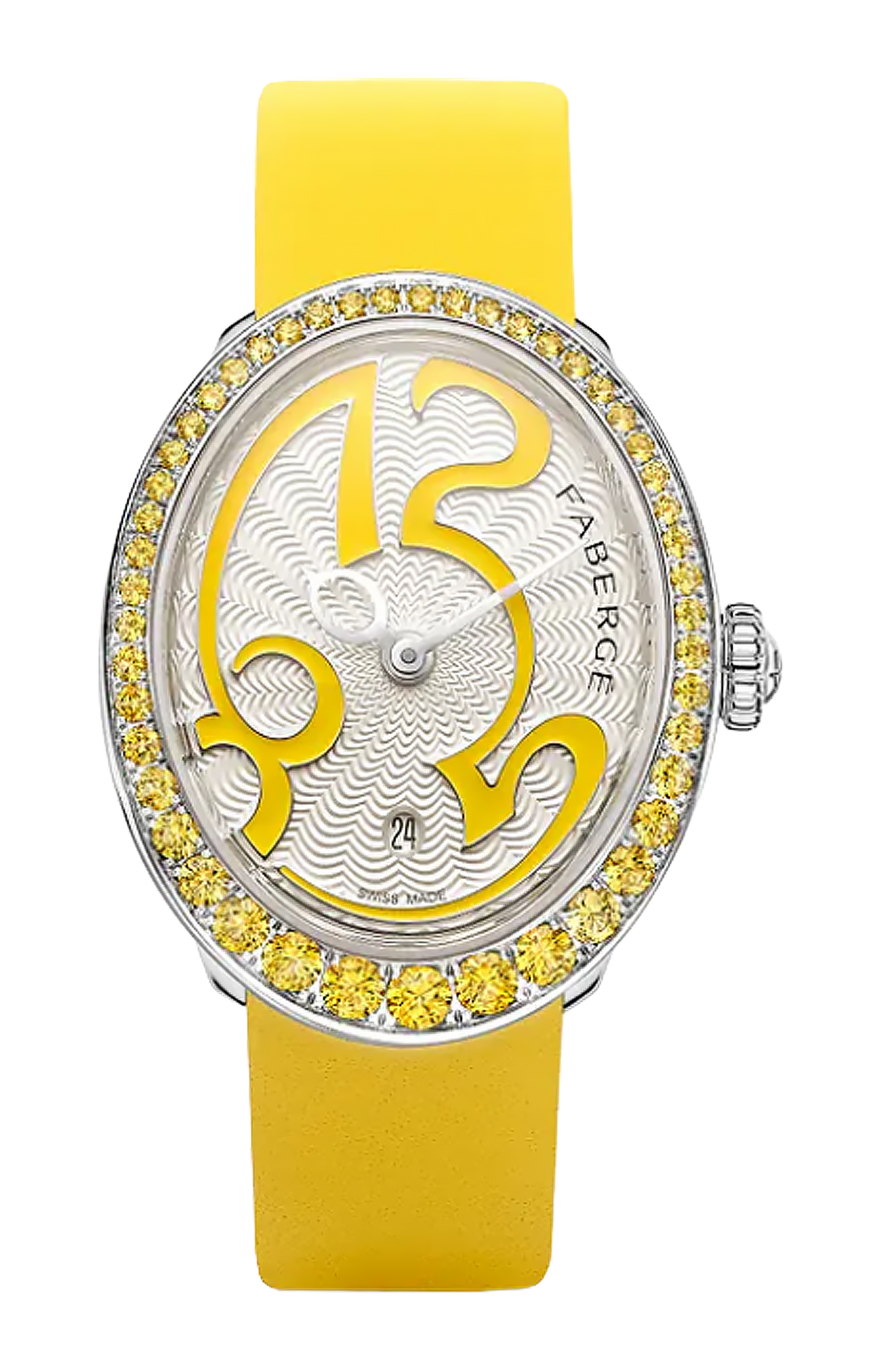 Fabergé ha introdotto gli orologi Eggsistence nella sua collezione Colours of Love , che celebra "Una vita a colori" attraverso l'uso di straordinarie pietre preziose colorate, colmando il divario tra gioielleria e orologi. Ispirata al simbolo più rappresentativo della Maison, l'uovo, questa nuova e giocosa collezione di orologi racchiude 180 anni di storia in un design contemporaneo, incarnando il fascino senza tempo di Fabergé . A carica automatica, questo stile presenta un'elegante cassa in acciaio inossidabile con zaffiri gialli sulla lunetta. La cassa presenta delicate scanalature sui lati, una caratteristica distintiva della nostra collezione Colours of Love , e numeri incastonati di diamanti, che consentono ai numeri di brillare e catturare la luce attraverso le diverse sfaccettature delle pietre preziose.