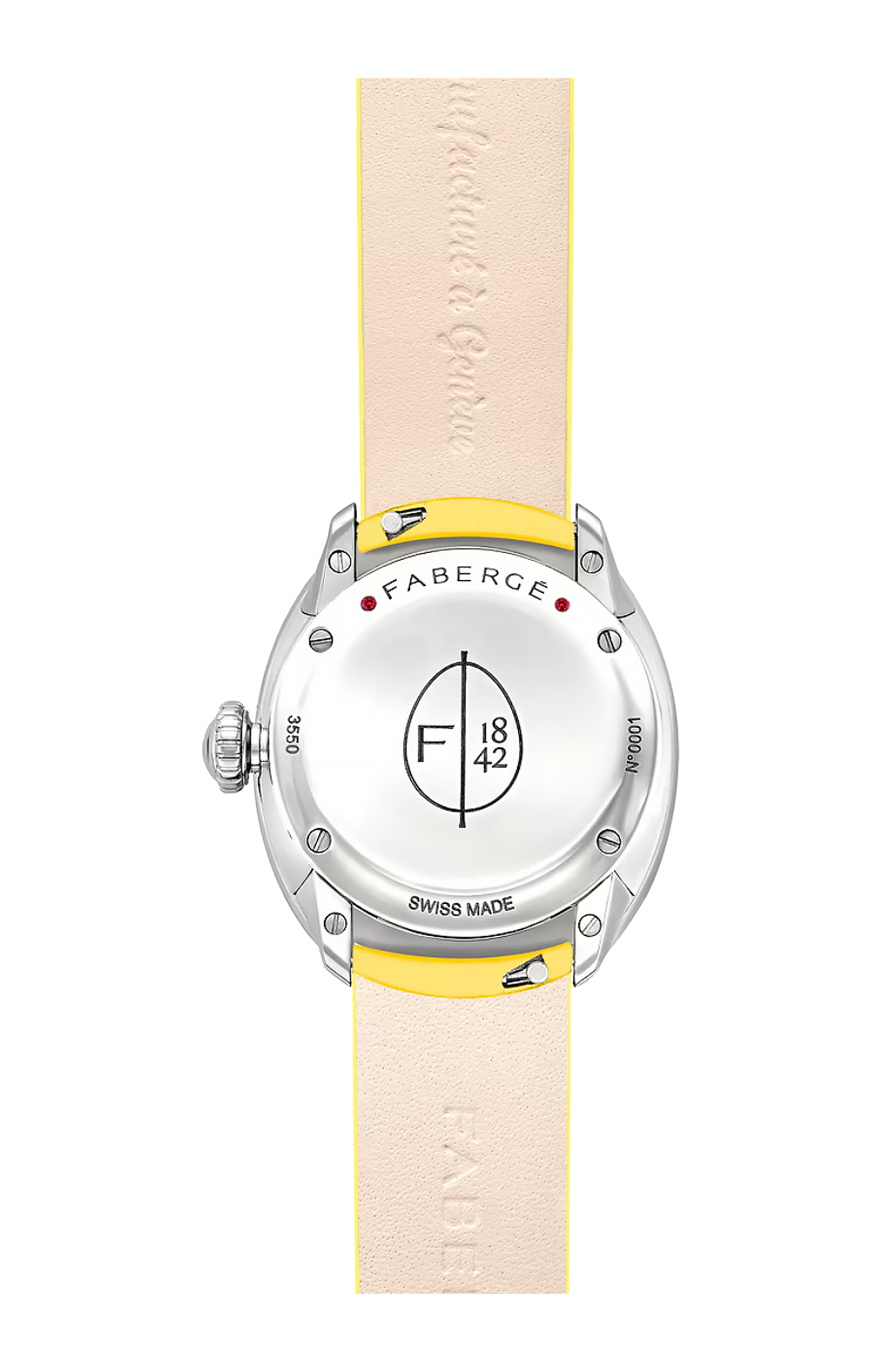 In vero stile Fabergé , ogni quadrante presenta un'incisione guilloché che, riflettendo la luce, crea un affascinante effetto perlato. Un ulteriore tocco divertente è dato dai cinturini intercambiabili, che possono essere facilmente rimossi e scambiati da chi li indossa. Ciò consente la possibilità di mescolare e abbinare per creare un look personalizzato. Mantieni un look chic con quadrante e cinturino abbinati, oppure osa osare con un look a contrasto. I cinturini sono realizzati in pelle di vitello e saranno disponibili in un'ampia gamma di opzioni di colore. Il tocco finale si trova sul fondello, con due rubini del Mozambico Gemfields estratti in modo responsabile, una sorpresa segreta che solo chi lo indossa conosce.