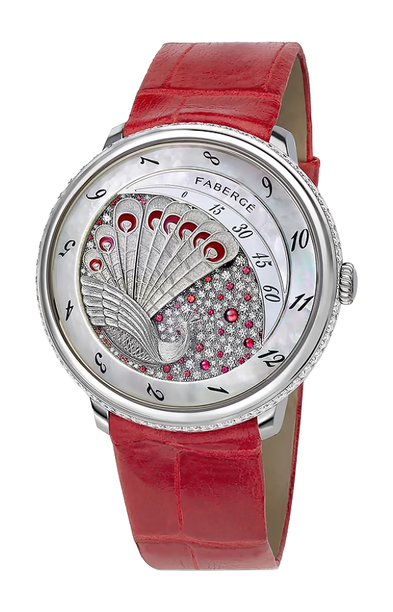 L'orologio Compliquée Peacock Ruby presenta un quadrante incastonato di diamanti e rubini, un pavone inciso a mano in oro bianco 18 carati, una lunetta incastonata di diamanti, indicatori dei minuti e delle ore in madreperla e un movimento retrogrado a carica manuale, racchiuso in una cassa in platino da 38 mm, con cinturino in alligatore.