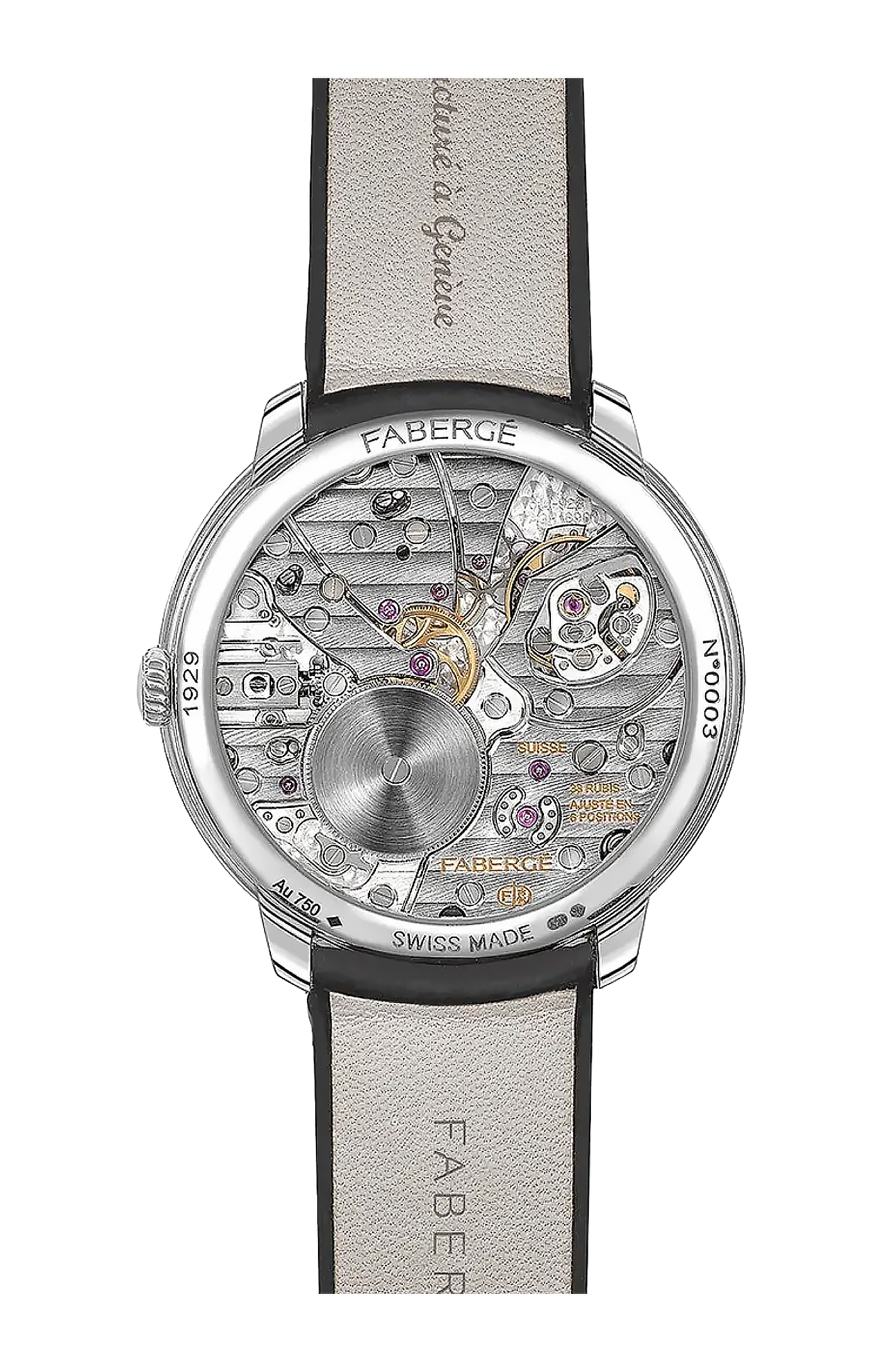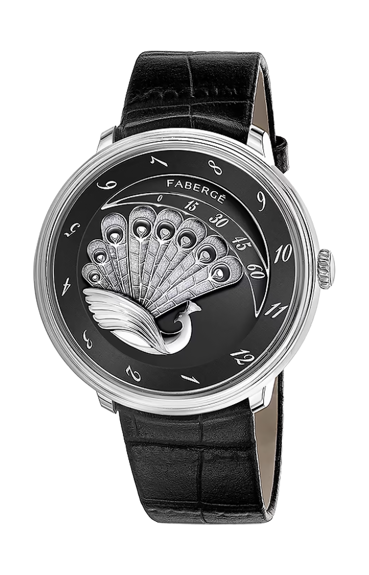 La collezione Compliquée Haute Horlogerie mantiene viva la tradizione di Peter Carl Fabergé di sorpresa e meticolosa esecuzione con un nuovo e spettacolare display del tempo, che ha vinto il prestigioso Grand Prix d'Horlogerie de Genève (GPHG) 2015, il più alto riconoscimento dell'industria orologiera svizzera, nella categoria "High-Mechanical". Il display altamente originale della collezione presenta un ventaglio al centro dell'orologio, un movimento sviluppato esclusivamente per Fabergé da Agenhor Manufacture. Perpetua così lo spirito ingegnoso e libero pensatore di Peter Carl Fabergé ; il display nell'orologio Compliquée Peacock rende omaggio al famoso "Peacock Egg" del 1908. L'orologio Compliquée Peacock White Gold Black è caratterizzato da un quadrante laccato nero opaco, un pavone inciso a mano, indicatori dei minuti e delle ore in madreperla verniciati di nero e un movimento retrogrado a carica manuale, racchiuso in una cassa in oro bianco 18 carati da 38 mm, con cinturino in alligatore.