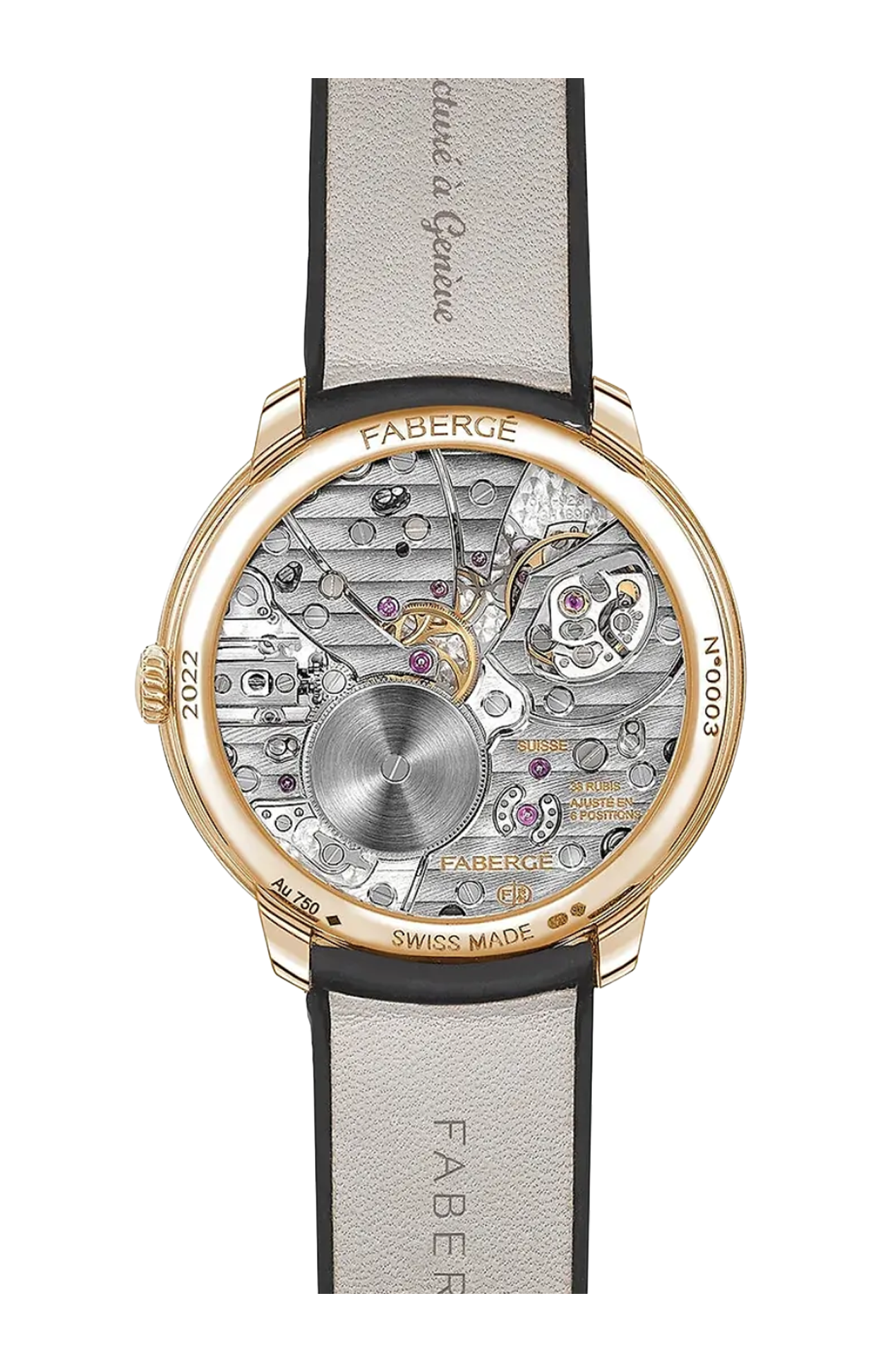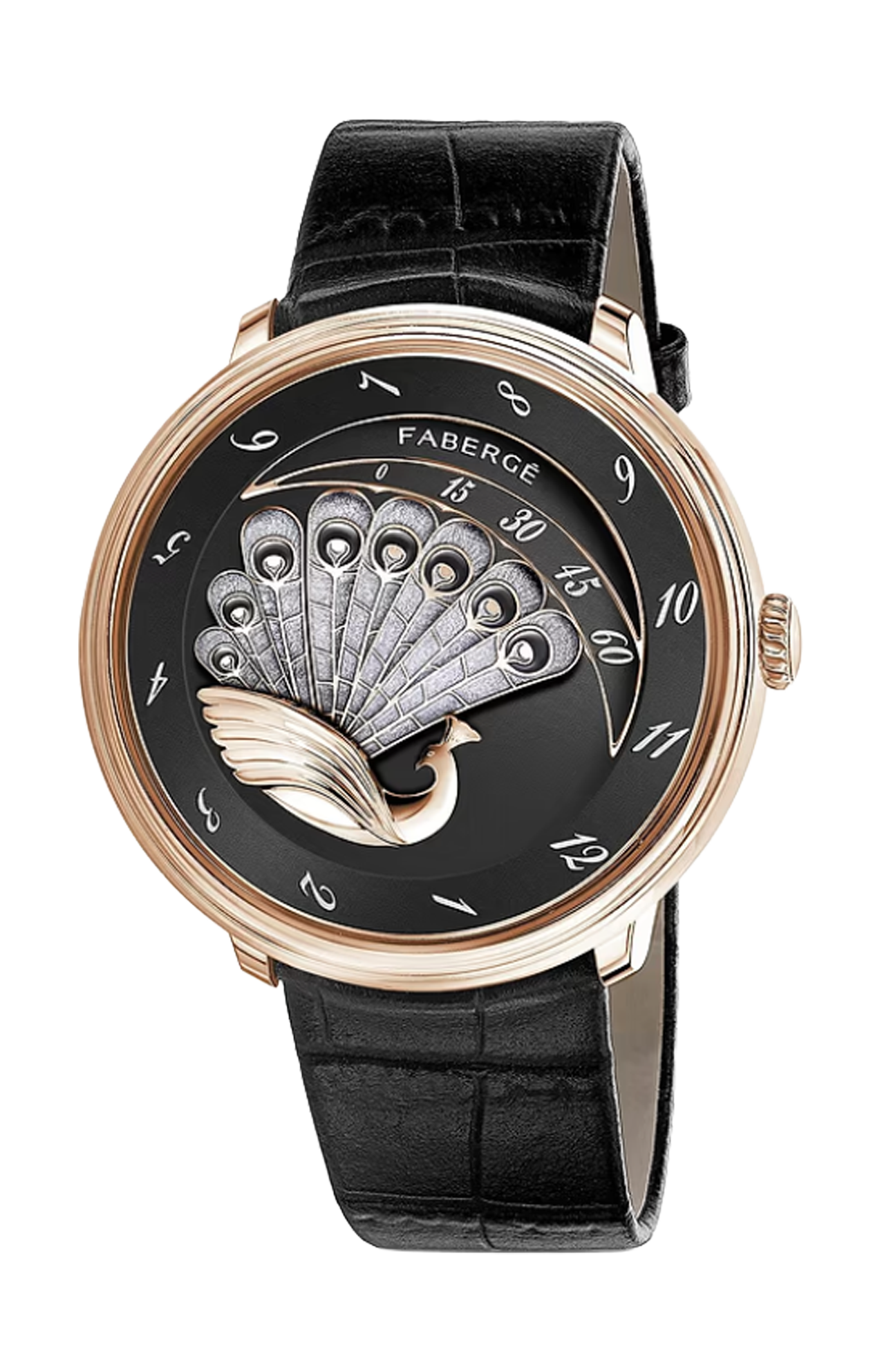 La collezione Compliquée Haute Horlogerie mantiene viva la tradizione di Peter Carl Fabergé di sorpresa e meticolosa esecuzione con un nuovo e spettacolare display del tempo, che ha vinto il prestigioso Grand Prix d'Horlogerie de Genève (GPHG) 2015, il più alto riconoscimento dell'industria orologiera svizzera, nella categoria "High-Mechanical". Il display altamente originale della collezione presenta un ventaglio al centro dell'orologio, un movimento sviluppato esclusivamente per Fabergé da Agenhor Manufacture. Perpetua così lo spirito ingegnoso e libero pensatore di Peter Carl Fabergé ; il display nell'orologio Compliquée Peacock rende omaggio al famoso "Peacock Egg" del 1908. L'orologio Compliquée Peacock Rose Gold Black è caratterizzato da un quadrante laccato nero opaco, un pavone inciso a mano, indicatori dei minuti e delle ore in madreperla verniciati di nero e un movimento retrogrado a carica manuale, racchiuso in una cassa in oro rosa da 38 mm, con cinturino in alligatore.