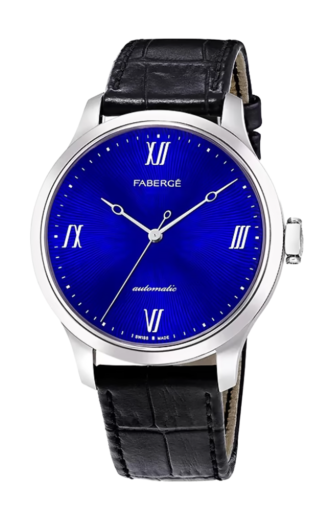 L'orologio Fabergé Altruist in oro bianco 18 carati è dotato di un quadrante guilloché inciso a mano con smalto blu, corona Fabergé in oro bianco 18 carati e movimento automatico Vaucher Manufacture, racchiuso in una cassa in oro bianco 18 carati da 41 mm, con cinturino in alligatore.