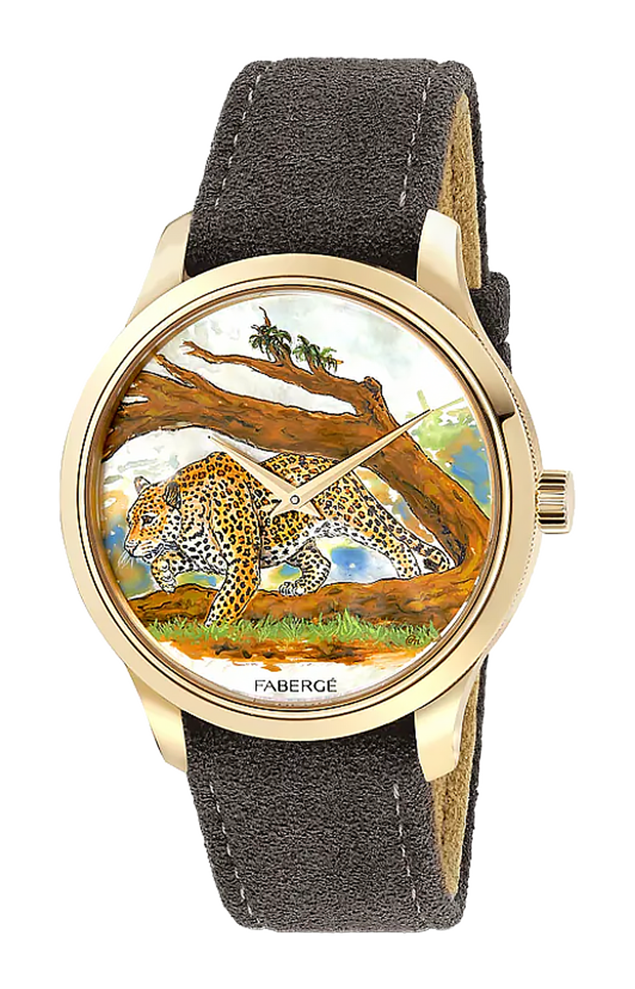Parte della collezione Fabergé Altruist , opportunamente chiamata, a sostegno della Gemfields Foundation, questo orologio in edizione limitata rende omaggio a uno degli animali selvatici più iconici dell'Africa: il leopardo. Il maestro artigiano Fabergé André Martinez, specialista nella pittura artistica miniaturista sui quadranti degli orologi, ha dipinto a mano meticolosamente ogni quadrante per raffigurare questo meraviglioso animale. Questa creazione presenta una miniatura di un leopardo, applicata meticolosamente a mano su un quadrante in madreperla con lacche di qualità eccezionale.