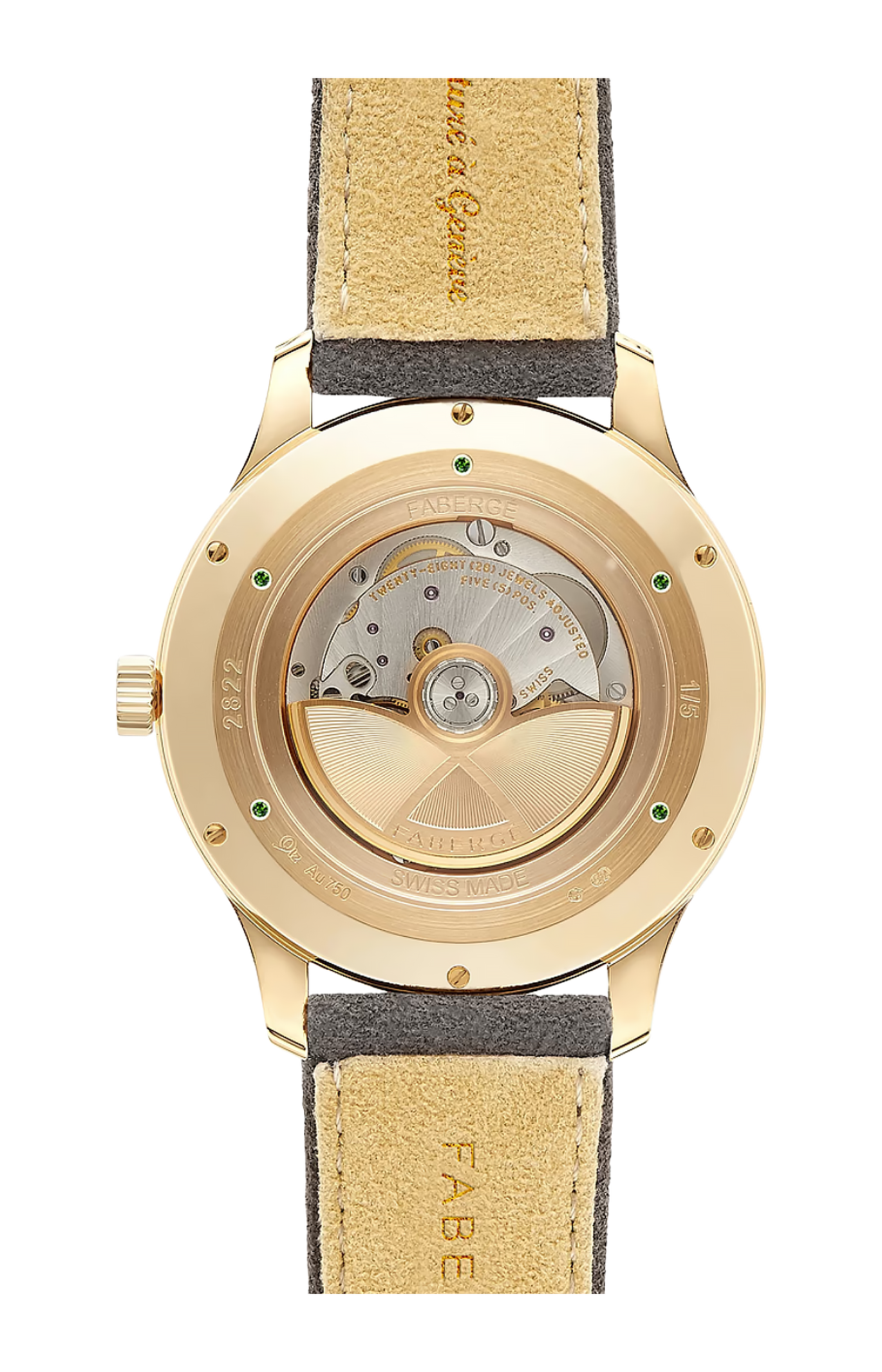 Una cassa in oro rosa 18 carati si abbina perfettamente al quadrante, con un fondello su misura su ogni orologio incastonato con cinque smeraldi dello Zambia Gemfields di provenienza responsabile. Si dice che gli smeraldi simboleggiano la speranza, la crescita, la vita, la fertilità e la pace. Su ogni fondello è inciso individualmente il numero del pezzo per dimostrare che si tratta di creazioni uniche e da collezione.