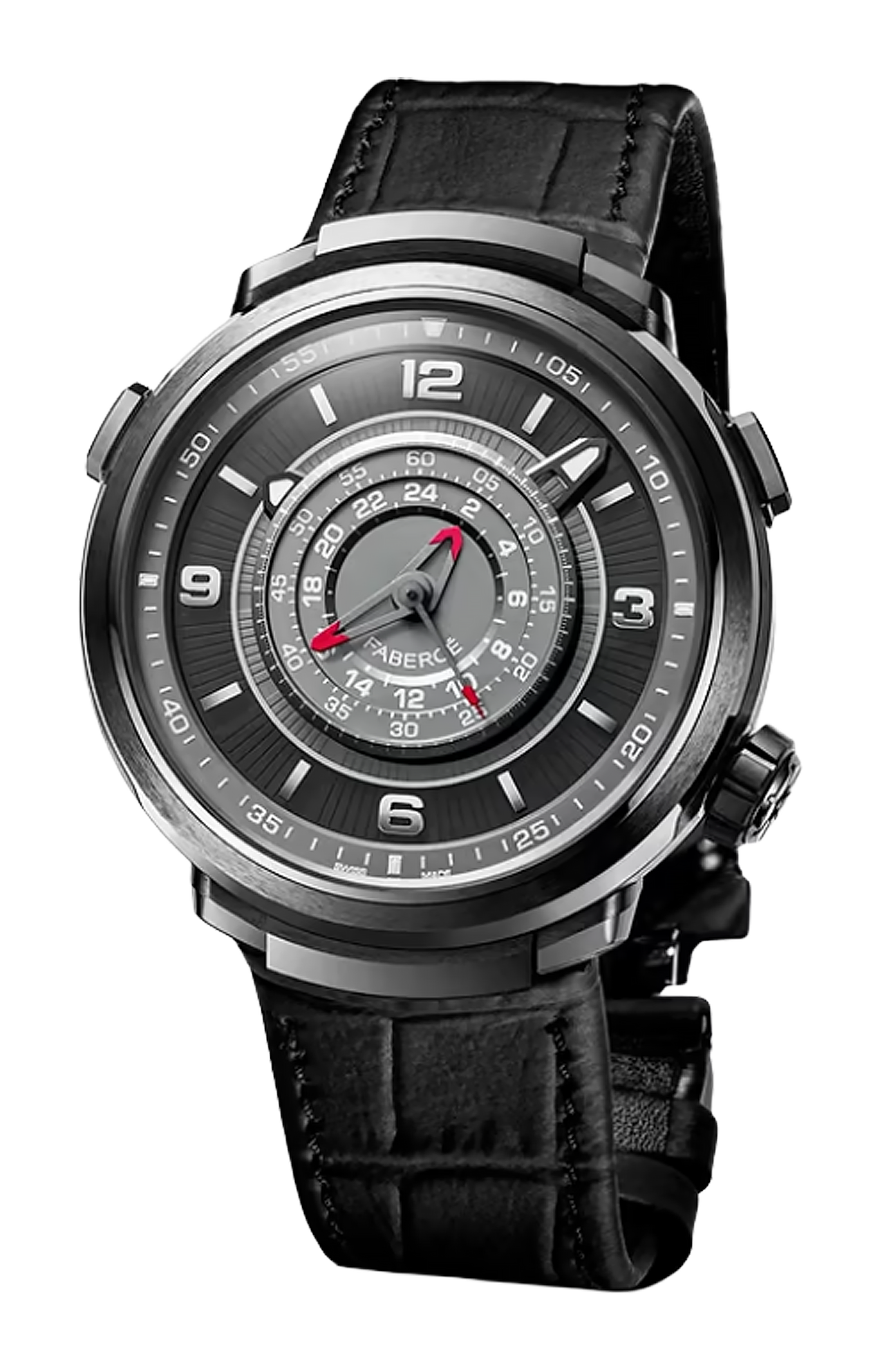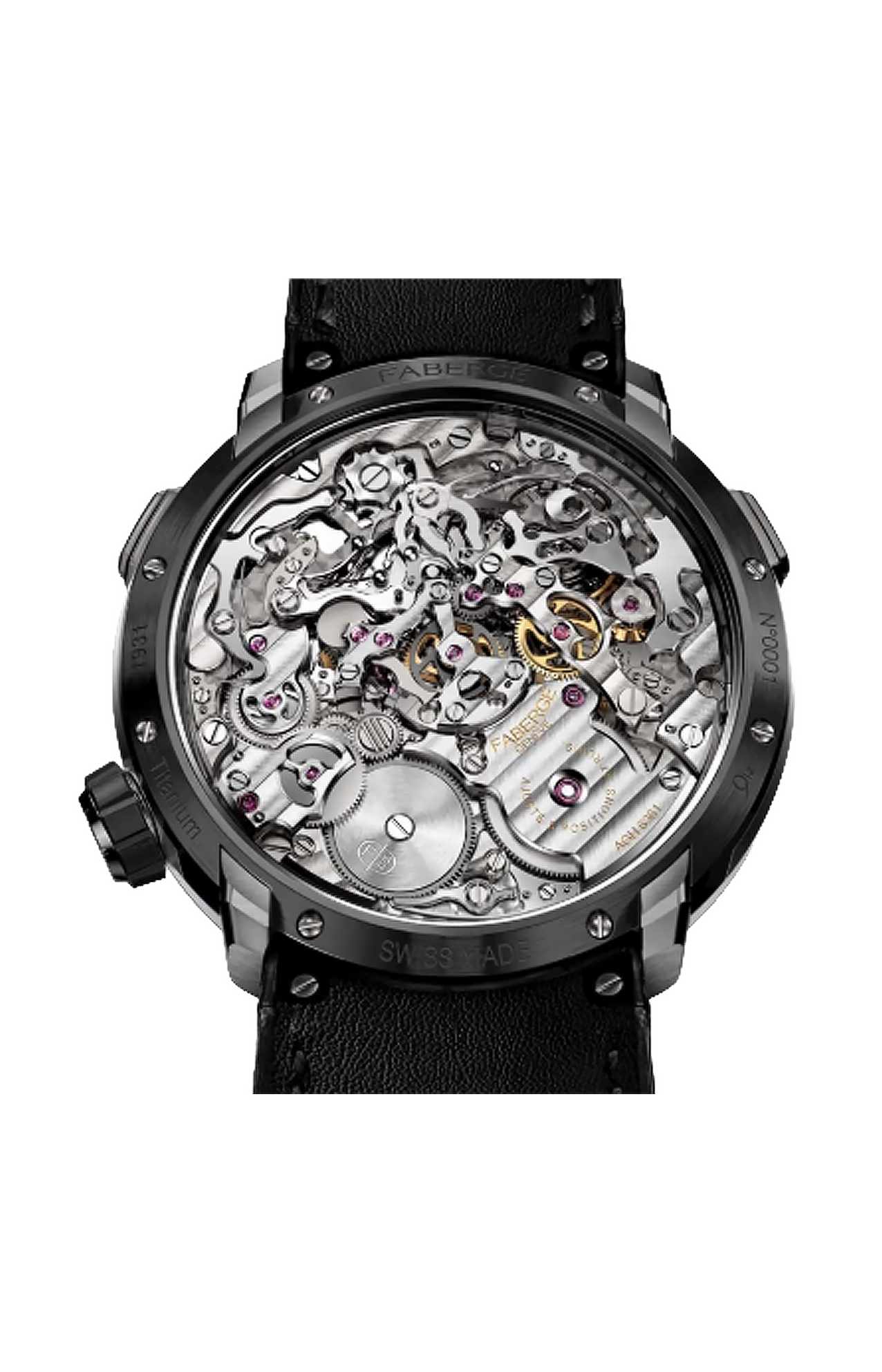 L'orologio Fabergé Visionnaire Chronograph Ceramic è dotato di un quadrante opalino con rivestimento luminescente TCI, indicatori dei 15 minuti, zaffiro con trattamento metallico e numeri e indicatori delle ore applicati e un movimento cronografico automatico di portata rivoluzionaria, sviluppato da Agenhor, racchiuso in una cassa in ceramica nera e titanio da 43 mm, con cinturino in alligatore.