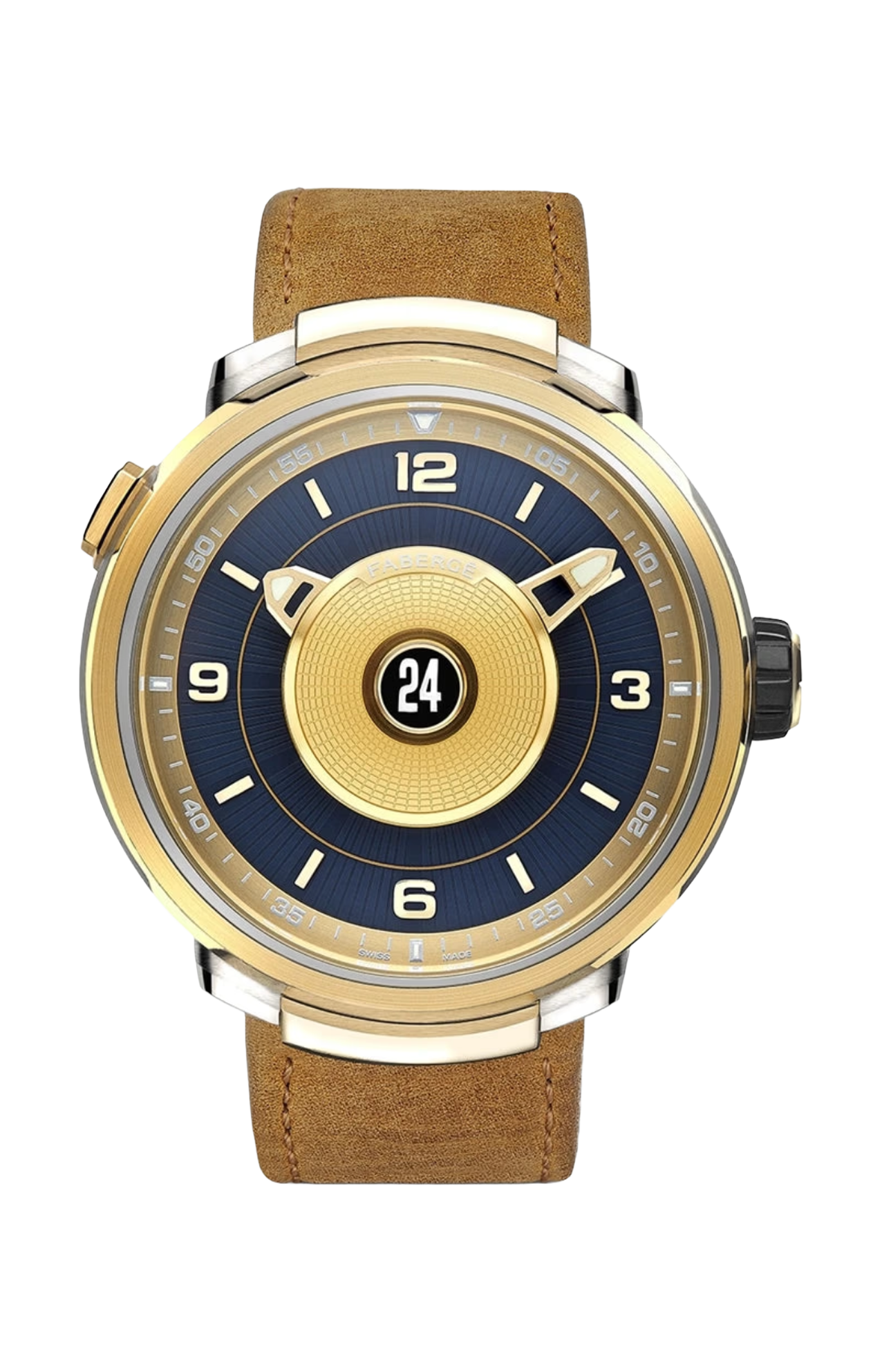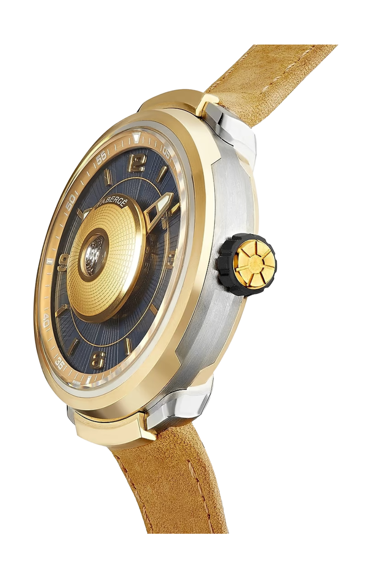 L'orologio Fabergé Visionnaire DTZ Galivanter presenta un quadrante dorato satinato con indicatori dei 15 minuti con rivestimento luminescente TCI, uno zaffiro con numeri applicati e indicatori delle ore, un rotore laterale del quadrante con decorazione blu e un movimento automatico con complicazione GMT, racchiuso in una cassa da 43 mm in oro giallo 18 carati e titanio, con cinturino in pelle marrone.