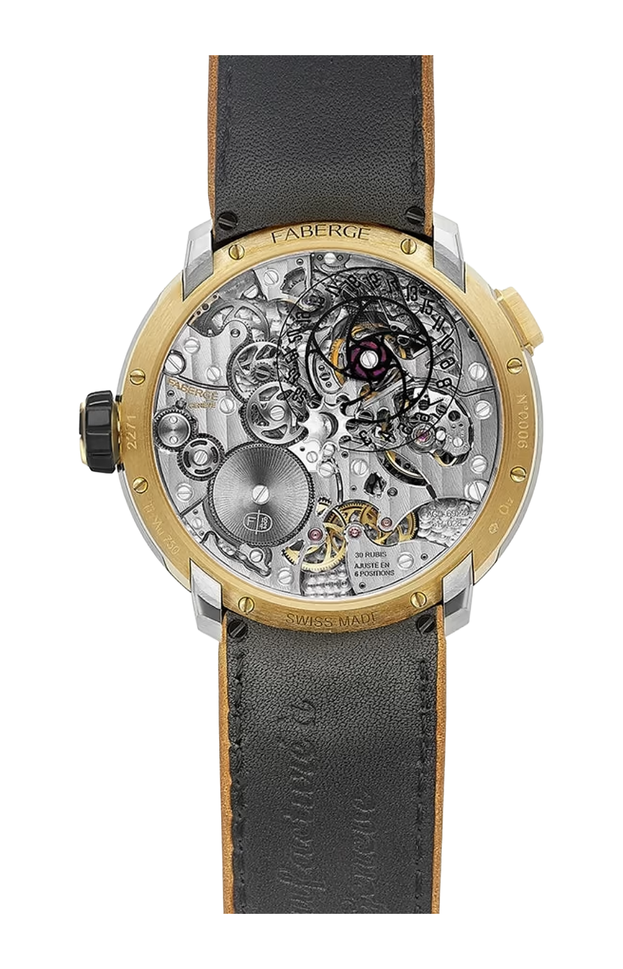 Il Fabergé Visionnaire DTZ a carica automatica utilizza un movimento progettato esclusivamente per Fabergé da Agenhor Manufacture. Il modello adotta un metodo logico e intuitivo per visualizzare due fusi orari contemporaneamente, perfettamente adatto allo stile di vita di coloro che hanno bisogno di tenere traccia del tempo in una seconda posizione distante. Le ore e i minuti del fuso orario locale sono presentati con lancette periferiche traforate che ruotano attorno a una cupola rialzata e decorata situata al centro del quadrante. L'ora del secondo fuso orario remoto è visualizzata attraverso una straordinaria apertura al centro della cupola, amplificata otticamente per una finitura audace, una caratteristica che sicuramente sorprenderà e delizierà. Per creare ancora più animazione e teatralità al quadrante, la collezione presenta un rotore laterale al quadrante, visibile sotto l'anello delle ore in vetro zaffiro del quadrante con indici applicati. Nel vero spirito Fabergé , Agenhor Manufacture ha creato un meccanismo a forma di pavone nascosto all'interno del movimento, rendendo omaggio all'elemento sorpresa caratteristico di Fabergé.