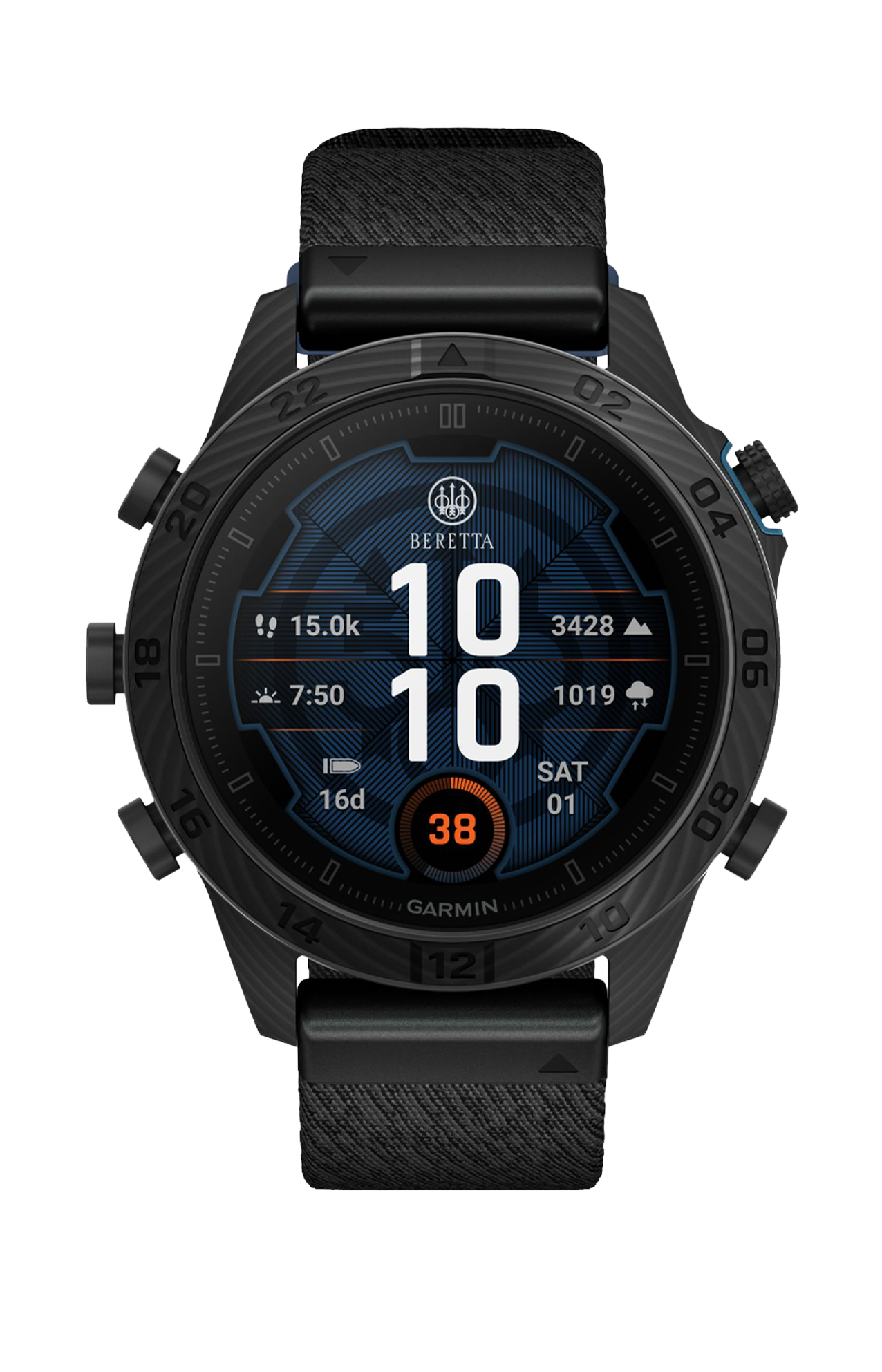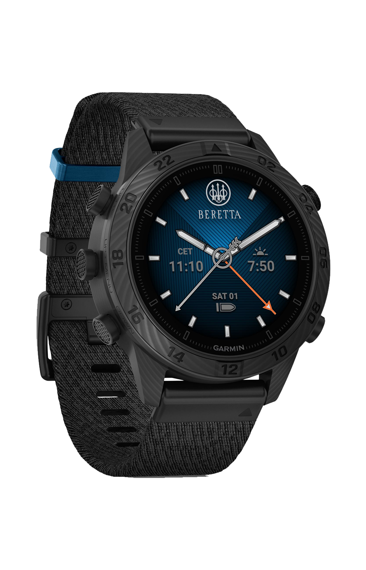 I dettagli dedicati a Beretta includono un passante del cinturino blu inciso al laser, un pulsante start personalizzato e un fondello esclusivo, oltre a quadranti analogici e digitali pre‑caricati ispirati al mondo Beretta.