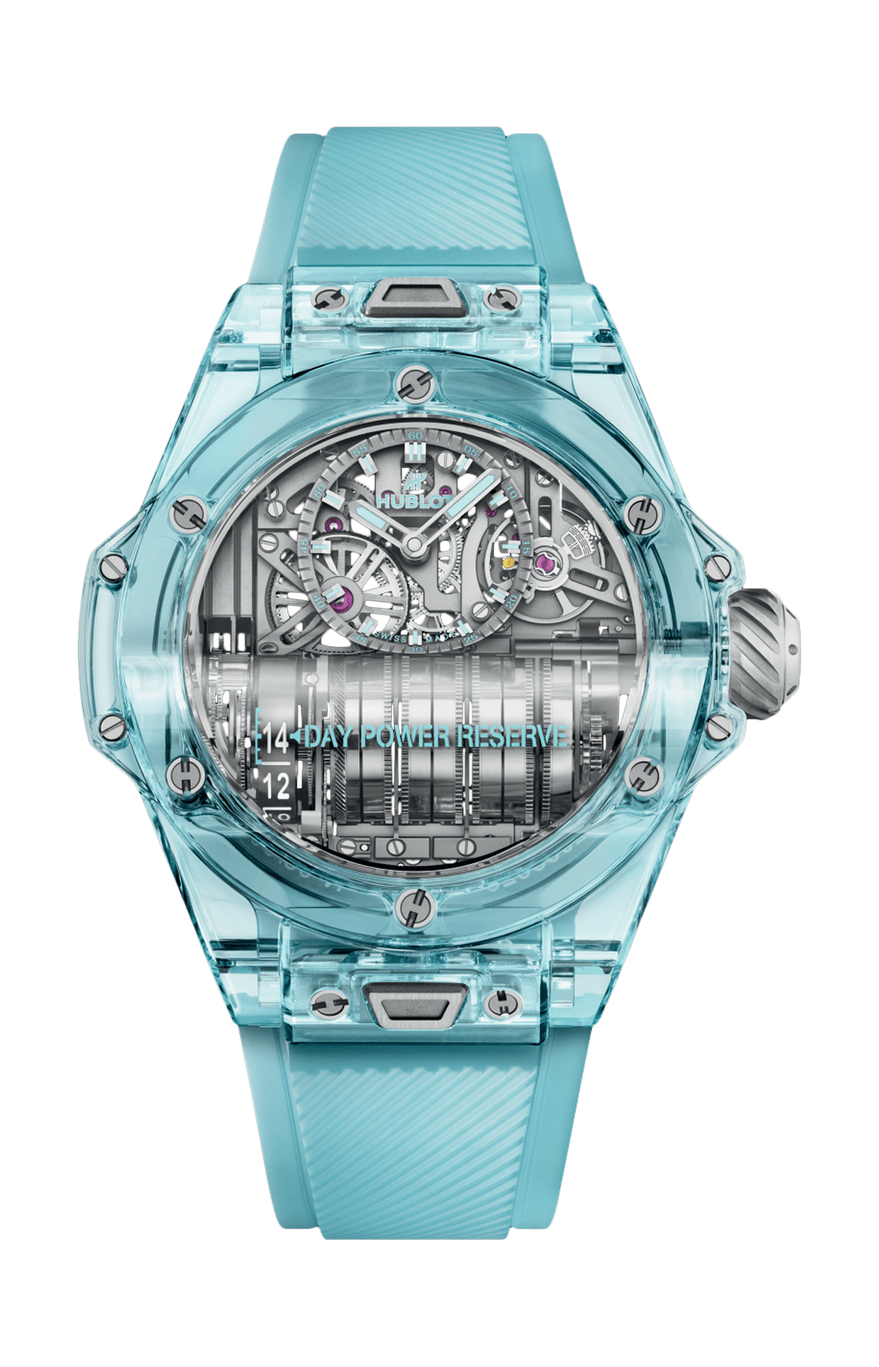 Per ottenere una riserva di carica di due settimane, Hublot ha sviluppato un movimento dal design originale e spettacolare che integra sette bariletti accoppiati in serie. Per consentire la trasmissione di energia tra l'asse orizzontale dei bariletti e la ruota verticale che aziona le indicazioni di ore e minuti, la manifattura ha utilizzato un sistema molto raro in orologeria: un ritorno di 90 gradi tramite la ruota dentata elicoidale, del tipo "a vite senza fine".