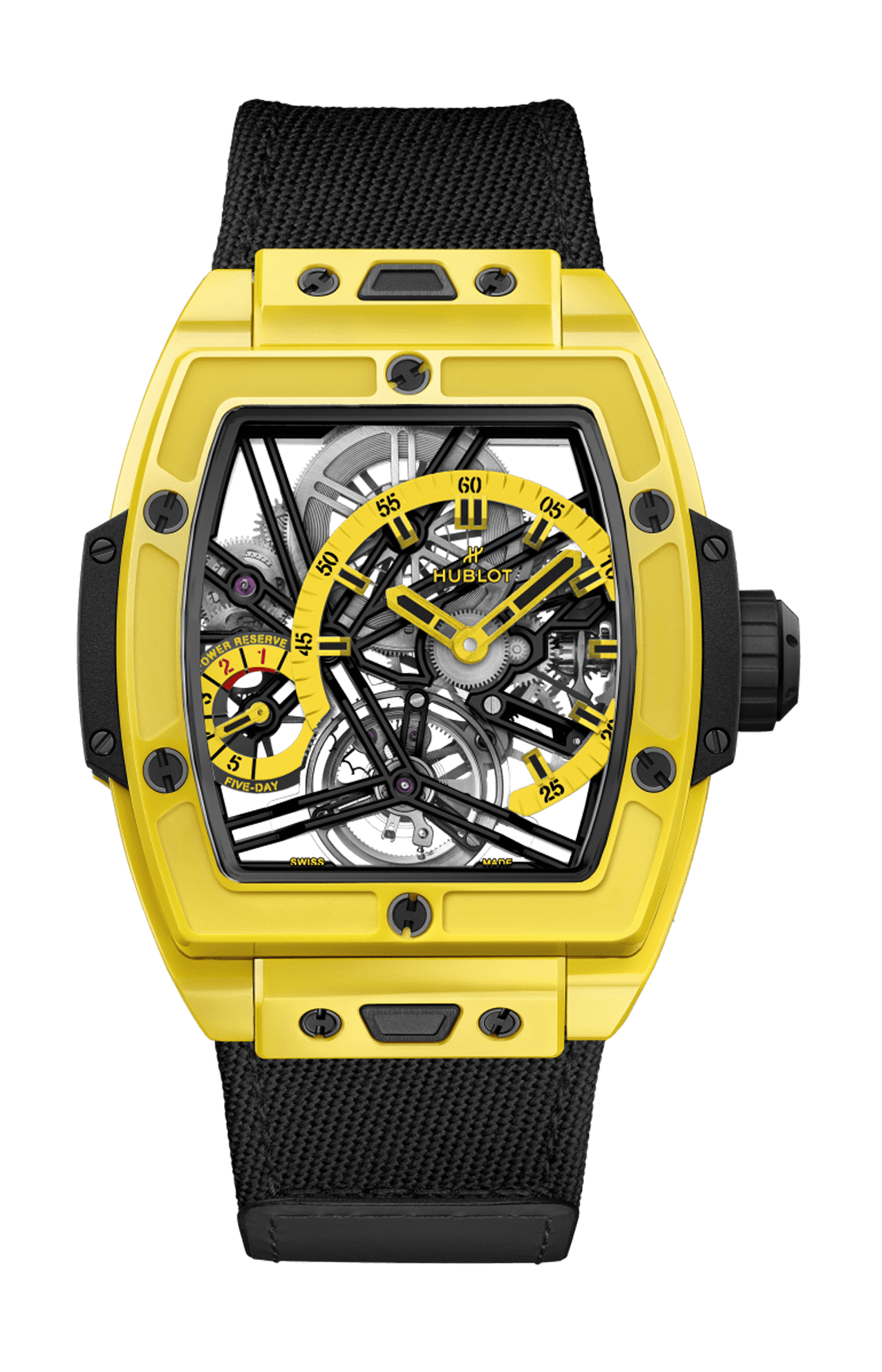 L'arte della fusione si esprime fino al cuore del movimento. Orologi semplici con concetti orologieri innovativi: Hublot ha creato una gamma di movimenti "in-house" unici. Un design unico per il cronografo automatico unico. Una riserva di carica senza pari per i calibri Meca-10, Tourbillon e MP-11. Un motore rivoluzionario con 11 bariletti MP-05 e una riserva di carica di 50 giorni. Nella sua "arte della fusione", Hublot realizza una perfetta simbiosi tra funzionalità, architettura e design. Secondo cinturino incluso caucciù nero e giallo. Edizione limitata a 20 esemplari.