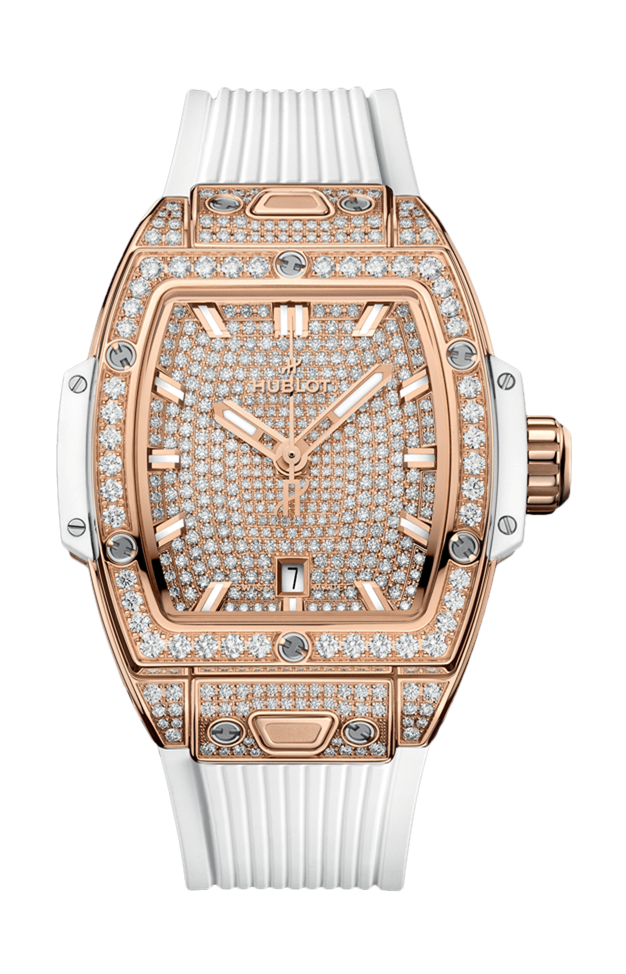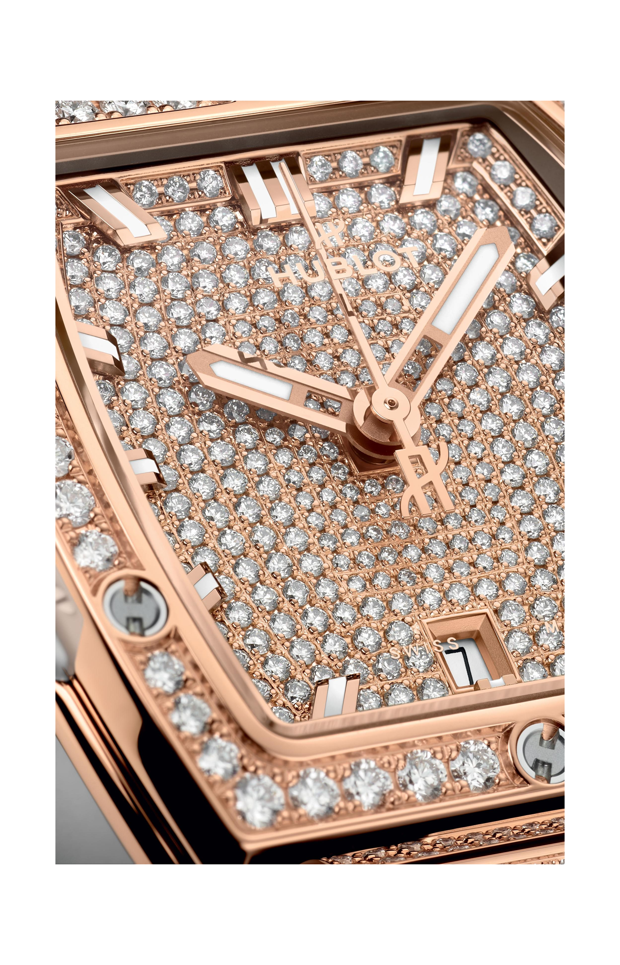 L’Hublot Spirit of Big Bang King Gold White Full Pavé da 32 mm è un segnatempo femminile che fonde l’energia audace della collezione Spirit of Big Bang con l’eleganza preziosa dell’oro King Gold e l’inconfondibile brillantezza dei diamanti, pensato per chi ama uno stile sofisticato e distintivo. La cassa tonneau da 32 mm, realizzata in oro King Gold 18 K — una lega esclusiva Hublot che unisce oro rosa e materiali nobili per una tonalità calda e intensa — è completamente incastonata con diamanti taglio brillante di altissima qualità, trasmettendo un senso di lusso discreto ma deciso. Il quadrante bianco, anch’esso ricoperto da un pavé di diamanti, riflette la luce con raffinatezza e crea un contrasto armonioso con la brillantezza dell’oro, mentre le lancette e gli indici dorati offrono leggibilità ed equilibrio. Il vetro zaffiro antigraffio con trattamento antiriflesso protegge il cuore di questo orologio e lascia intravedere ogni dettaglio con chiarezza assoluta. Il movimento automatico di alta precisione assicura affidabilità quotidiana, mentre il cinturino in caucciù bianco con fibbia deployante in oro King Gold combina comfort e stile contemporaneo, adattandosi perfettamente al polso. Impermeabile fino a un uso quotidiano leggero, questo segnatempo è ideale per chi desidera un orologio di carattere, capace di unire maestria orologiera, design moderno e un tocco di brillantezza elegante — perfetto sia come accessorio quotidiano sia come pezzo statement nelle occasioni speciali.