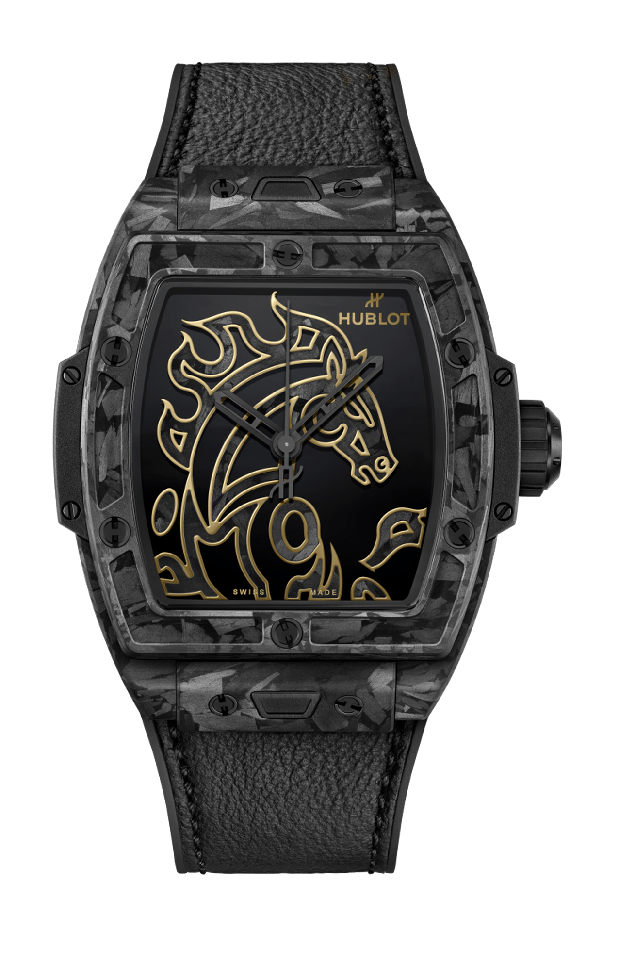 Apprezzato nelle corse automobilistiche, il carbonio possiede qualità meccaniche ineguagliabili. È ultraleggero, resistente alla torsione e si distingue per il suo rapporto ottimale tra peso e resistenza. Questo materiale high-tech si presenta sotto forma di una maglia di fibre inglobate in una resina epossidica. Hublot utilizza anche un carbonio 3D in cui le fibre sono intrecciate su tre piani. Altri modelli utilizzano un carbonio "smerigliato" con inclusioni colorate. Edizione limitata a 88 esemplari.