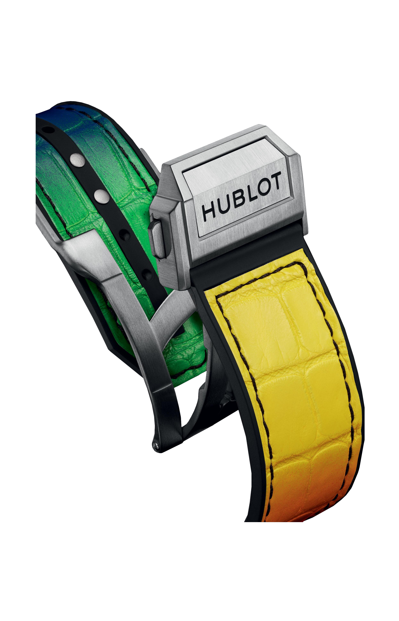 Il titanio è ampiamente utilizzato da Hublot, in particolare per la sua leggerezza. Presenta il miglior rapporto tra resistenza e peso di qualsiasi altro materiale, il che lo rende un materiale estremamente popolare soprattutto in ambito aeronautico. Si distingue anche per la sua resistenza alla corrosione e la sua inerzia a contatto con la pelle. Hublot utilizza esclusivamente titanio di alta qualità, grado 5, il più resistente in assoluto. Una volta lucidato, questo materiale mantiene una leggera lucentezza metallica bluastra.