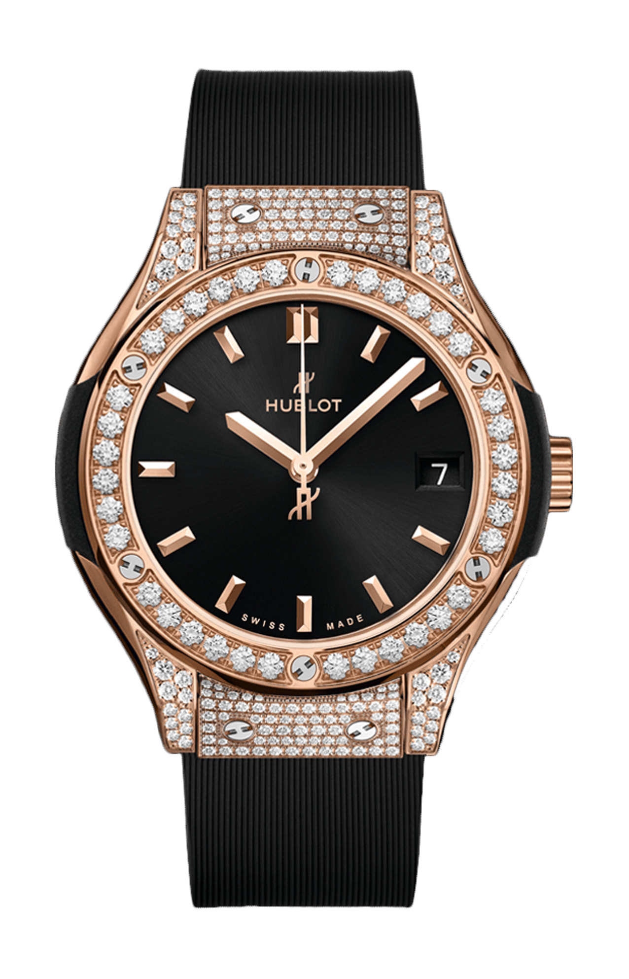 Maestro della fusione e alchimista dei metalli preziosi, Hublot ha sviluppato un nuovo colore dell'oro con una tonalità più calda rispetto al tradizionale oro 5N 18 carati. Composta principalmente da platino, questa esclusiva lega King Gold si presta perfettamente a tutti gli elementi di lucidatura e satinatura. Gli orologi Hublot fondono i materiali più inaspettati come ceramica high-tech, caucciù e carbonio. Secondo cinturino incluso in pelle di alligatore nero.