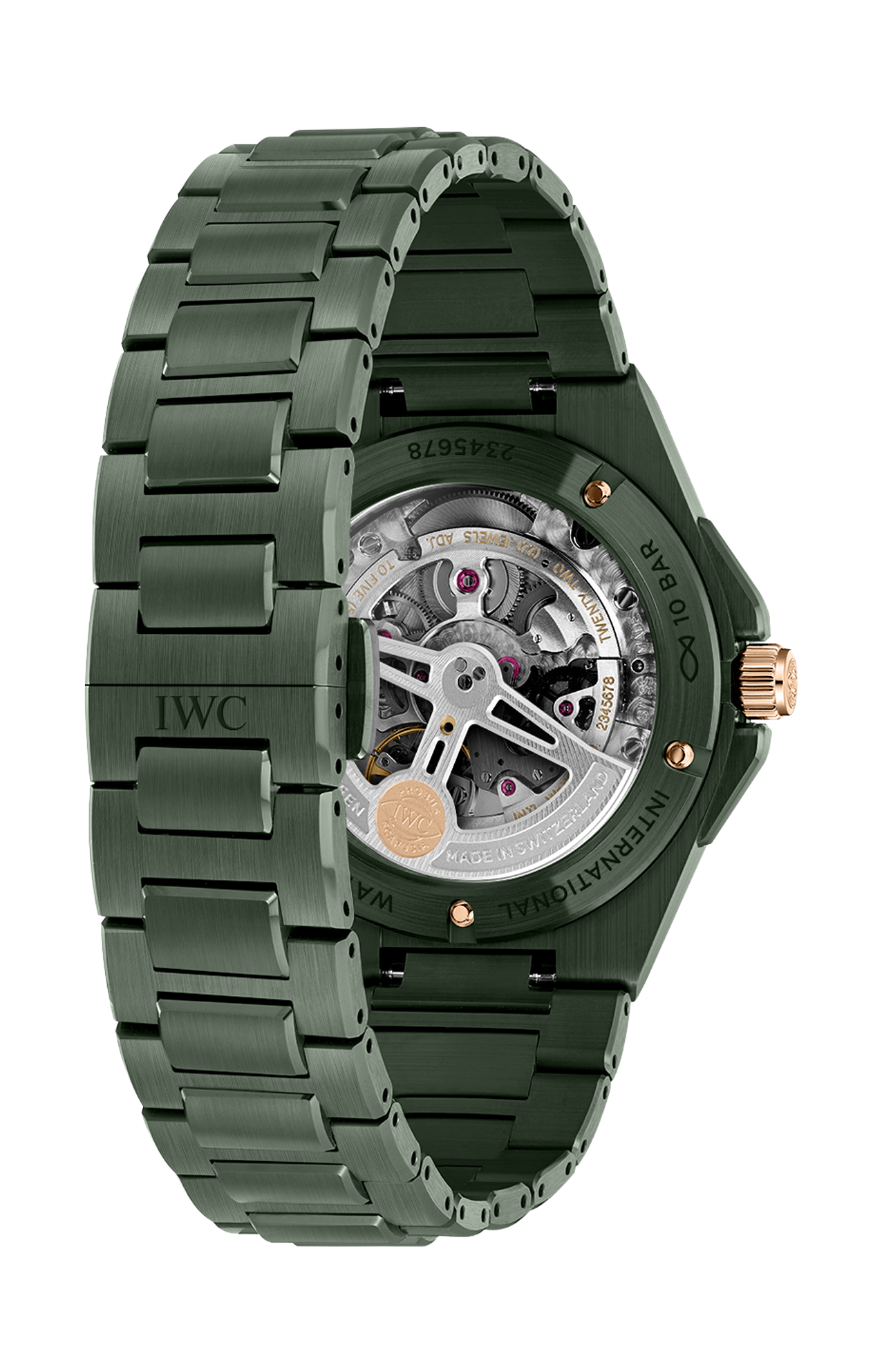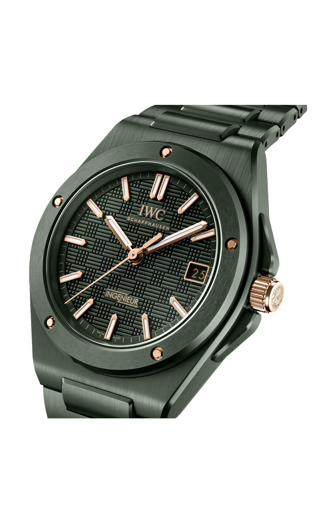 L’Ingenieur Automatic 42 combina il design con bracciale integrato derivato da Gérald Genta a una sorprendente interpretazione in ceramica verde oliva scuro.